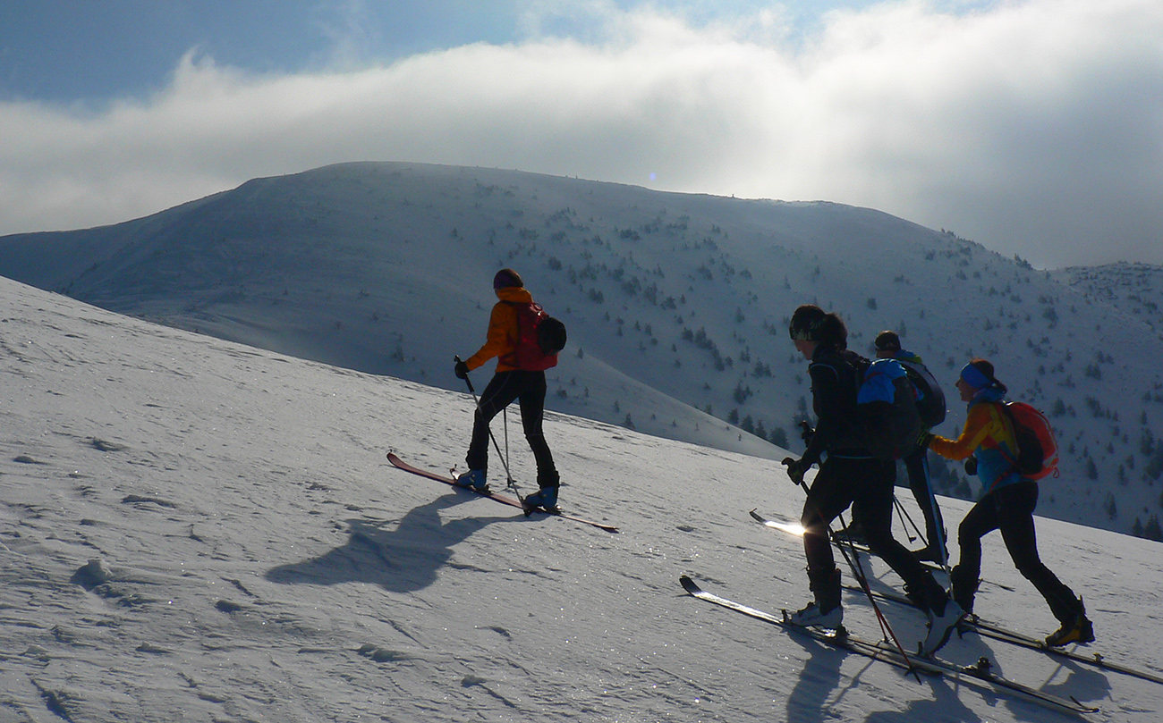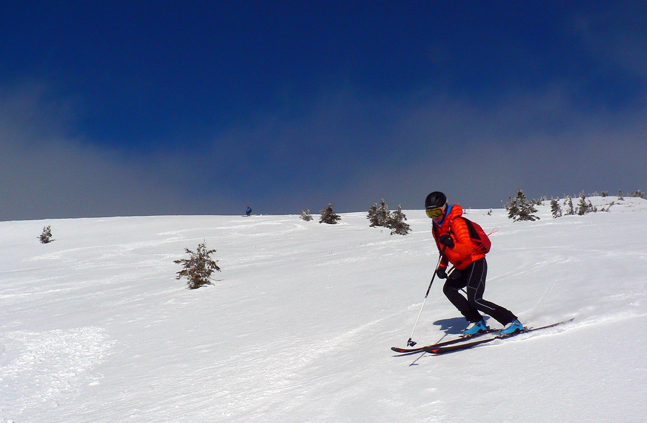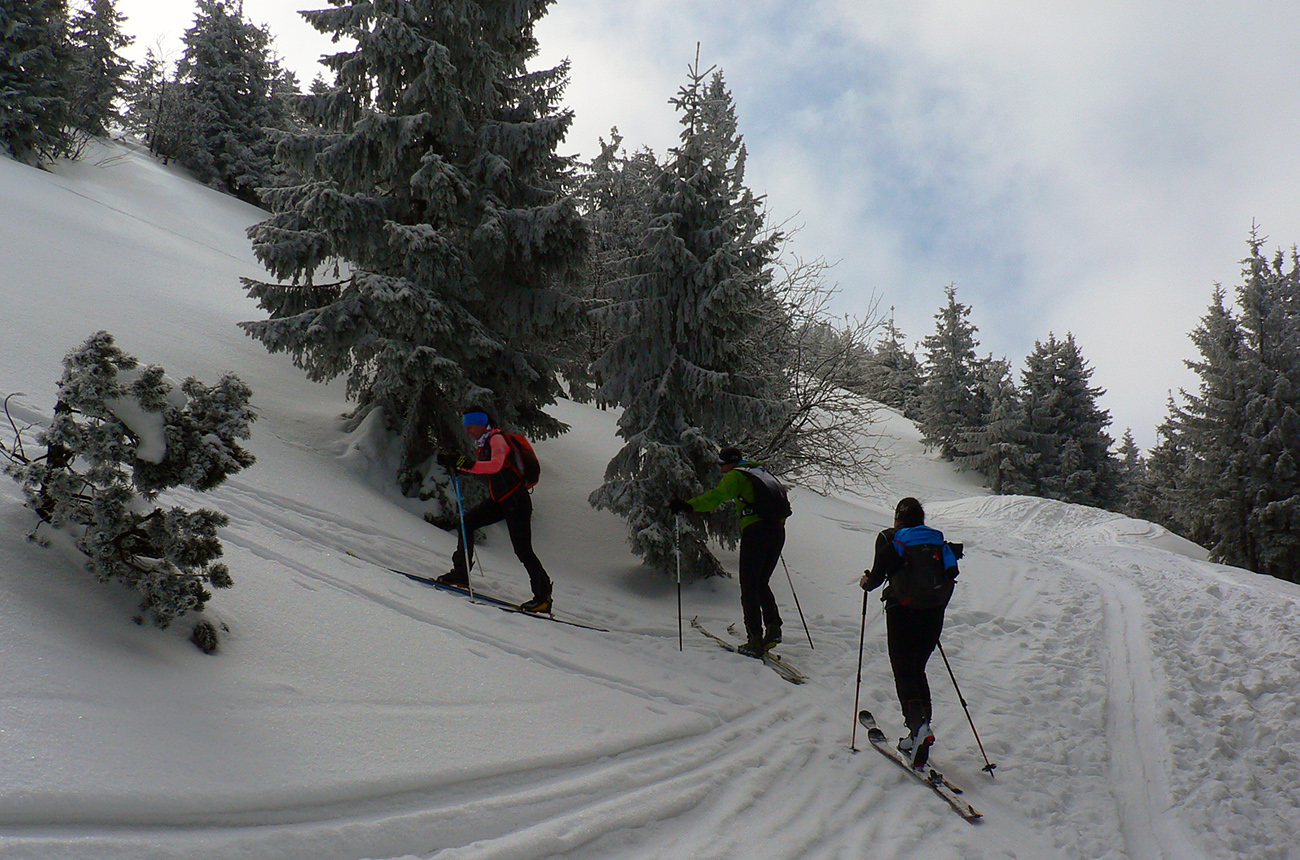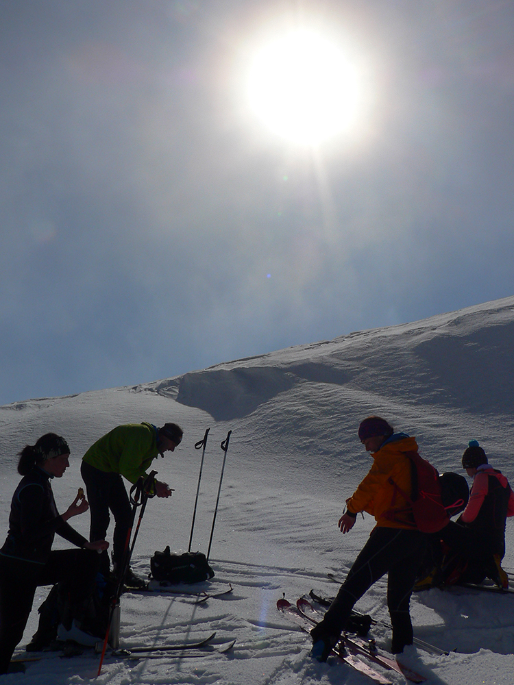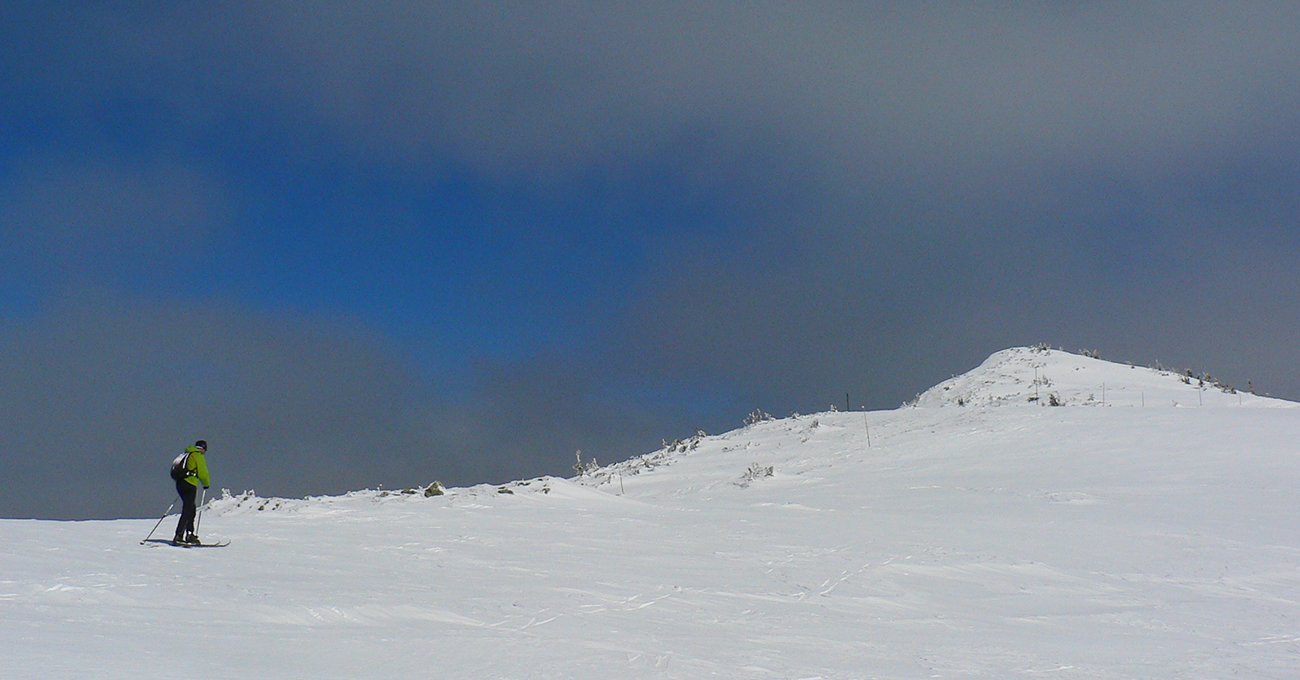 No mali sme byť traja, nakotilo sa nás päť. Na môj samotársky vkus poriadna banda, ale všetko známe firmy, niekedy neuškodí aj takáto „masofka“. Mal som tam byť za sprievodcu, ale známa firma „Majster Z“ sa vyzná lepšie, najmä po kadejakých miestnych zbojníckych chodníčkoch, grúňoch a dolinách. Tak som s radosťou prijal úlohu vzadu sa vlečúceho a miestami z predposledných síl nadbiehajúceho fotoreportéra. Lebo počasie vyšlo na jedna mínus. Jedna preto, lebo aj na hrebeni vládlo bezvetrie, slnko čoraz viac prepaľovalo rednúce mraky a dobré snehy sa dali nájsť ľahko. Mínus preto, lebo nepieklo ani na južných svahoch, slnkom opekaných, v podstate stále bolo mínus a keď už okolo obeda začal prašanček na tých juhoch trošíčka naznačovať, že by snáď mohol aj lepiť, zdrhli sme definitívne do severov.