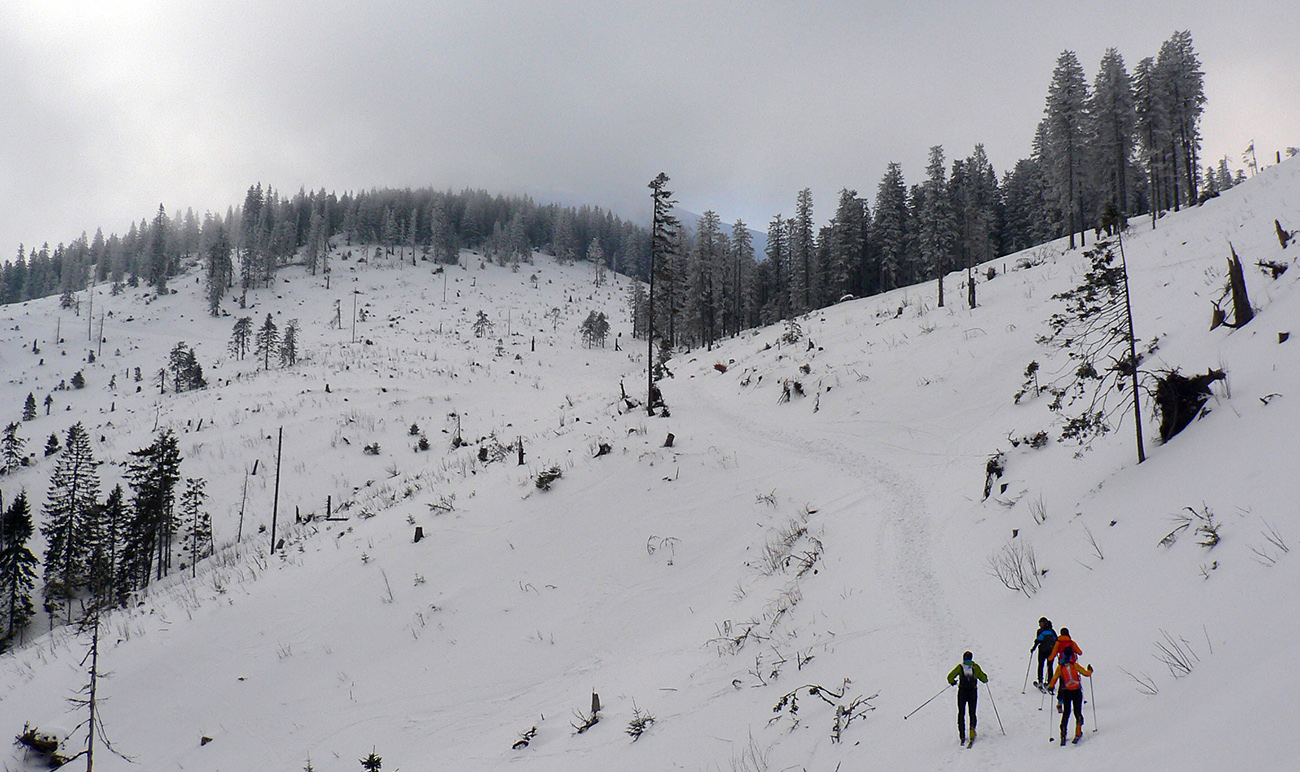 Takmer presne po roku som sa „vrátil na miesto činu“ (odkaz dole), ale teraz už dve expedičné autá sme zapichli vyššie, priamo v sedle Prievalec na takmer prázdnom parkovisku. Len rozospatý pohľad z jedinej prítomnej dodávky nás obviňoval z radosti asi príliš nahlas prejavovanej - pri chystaní do akcie. A sme teda vyrazili: stopy preleštené, aj v lese špina prikrytá novým popraškom, na rúbaniach hygienická bieloba, ešte takmer nepokreslená. Samozrejme som z čistej zaneprázdnenosti zabudol zapnúť hodinky.