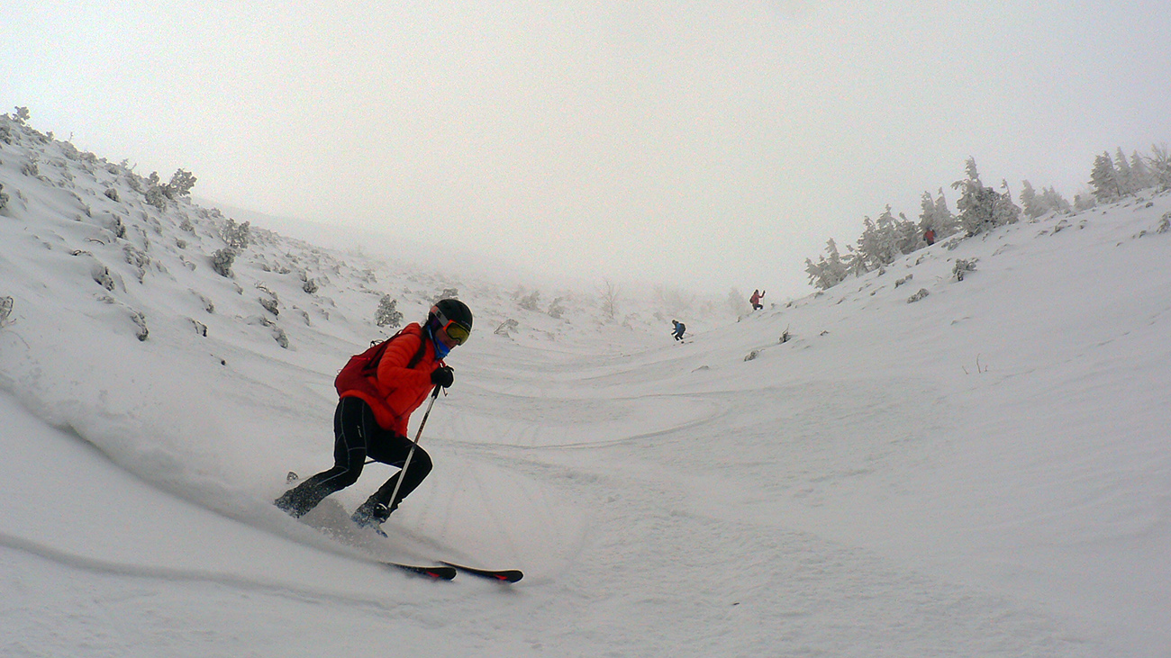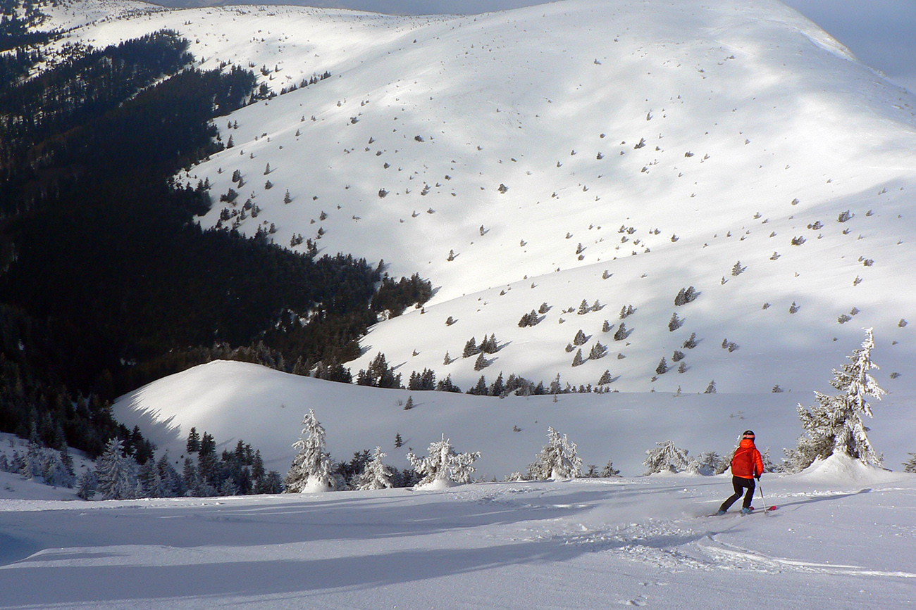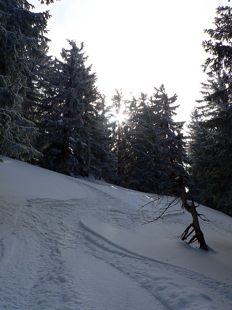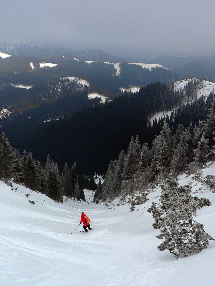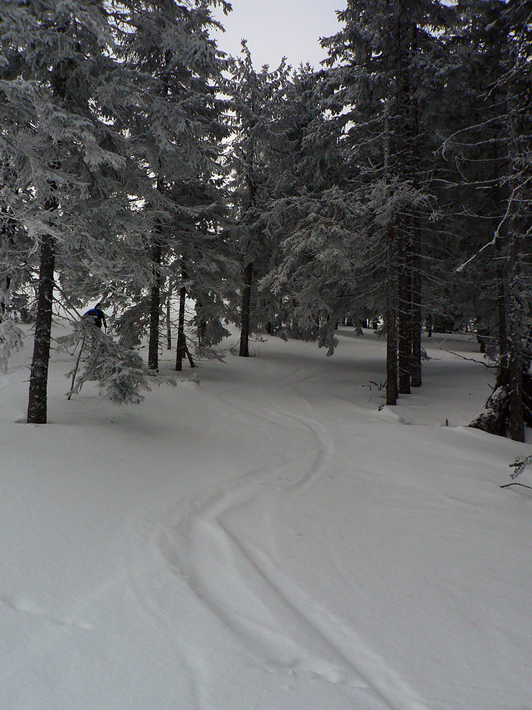 Po niekoľkých krátkych prestávkach na vydýchanie (alebo taktických poradách) padla prvá voľba na Latiborskú hoľu, ktorej temeno bolo na počudovanie viacerých normálne ZASNEŽENÉ a netrčalo tam skoro nič!!! No ci beka! Takže očkávanie smerom dole na JZ bolo viac než veľké a celkom sa aj splnilo. Hore ešte to pod tenkou vrstvou škrípalo a nedržalo, ale ako sme sa norili do tieňov, norili sme sa aj do snehov. Zase žiadna hlbočizná orba frírajdová, len proste príjemné oblúky.