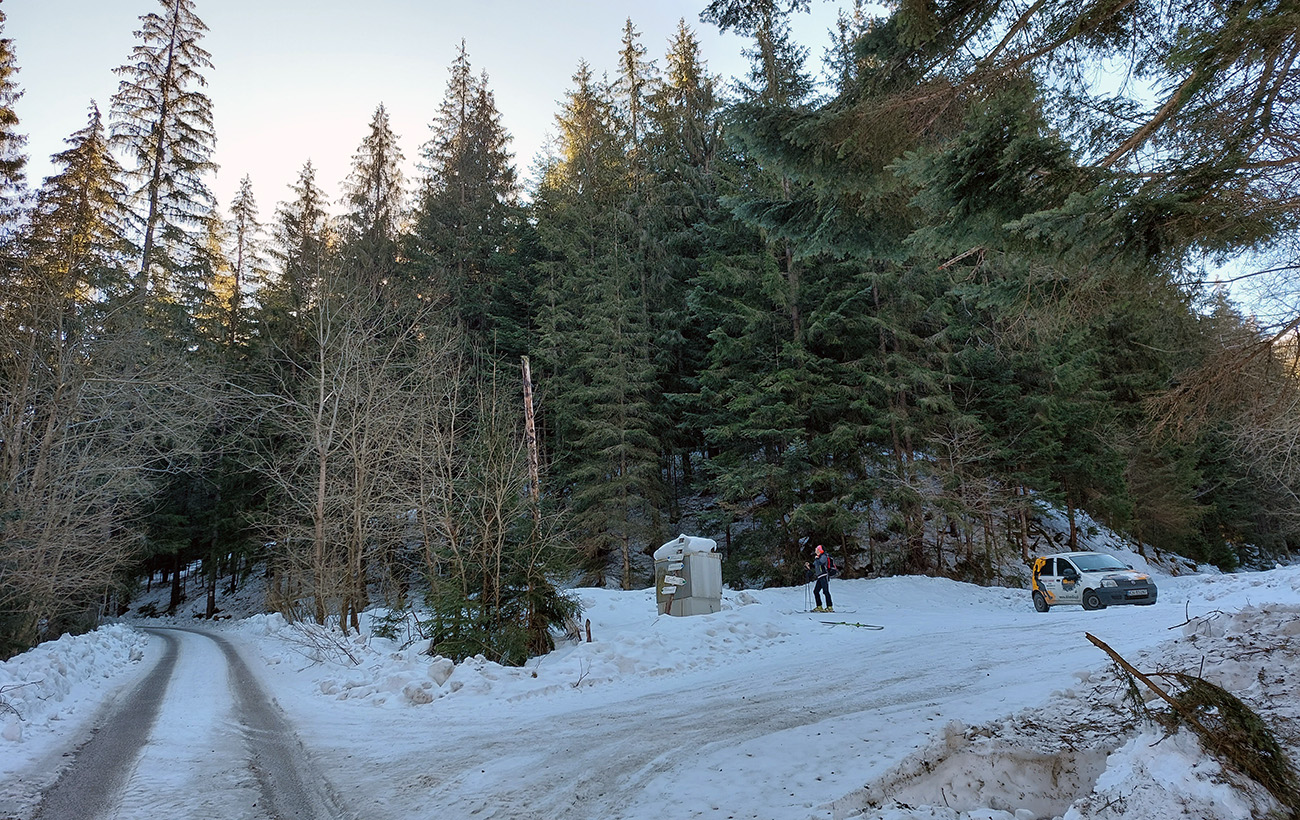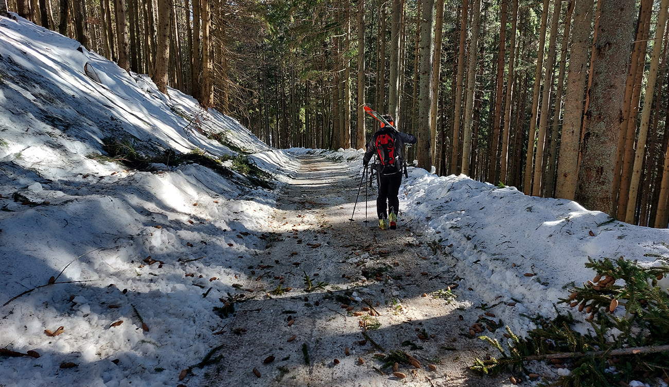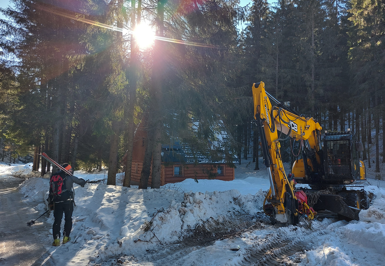 Čo k dispozícii nebolo? Znalosti o prístupe a o stave cesty. Tak sme reťaze nechali v kufri a povoz na Prievalci, že sa skúsime prebojovať na Magurku po ceste, po zelenej značke. Aspoň to tam poriadne obzrieme. Aj sme obzreli, lebo pod cestou lesáci veselo ťažia a po ceste smerom na Prievalec veselo tie stromy ťahajú. Tak pešovačka, ale to by asi bola aj bez toho, lebo odmäky povyťahovali šutre spod snehu, skoro na asfalt odhrnutého. Aspoň sa moc nešmýkalo, lebo inak pod tým bordelom ľady prestrašné: