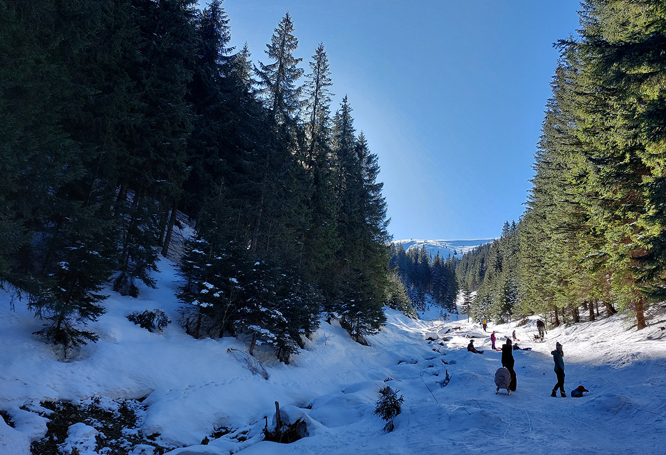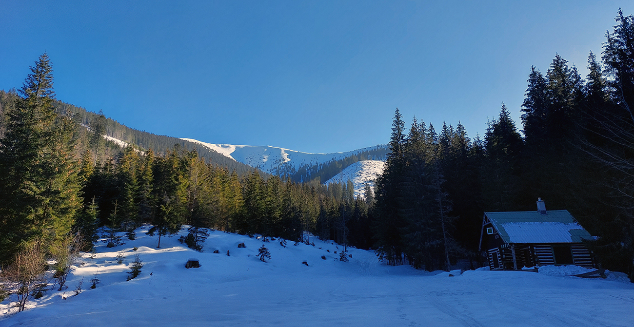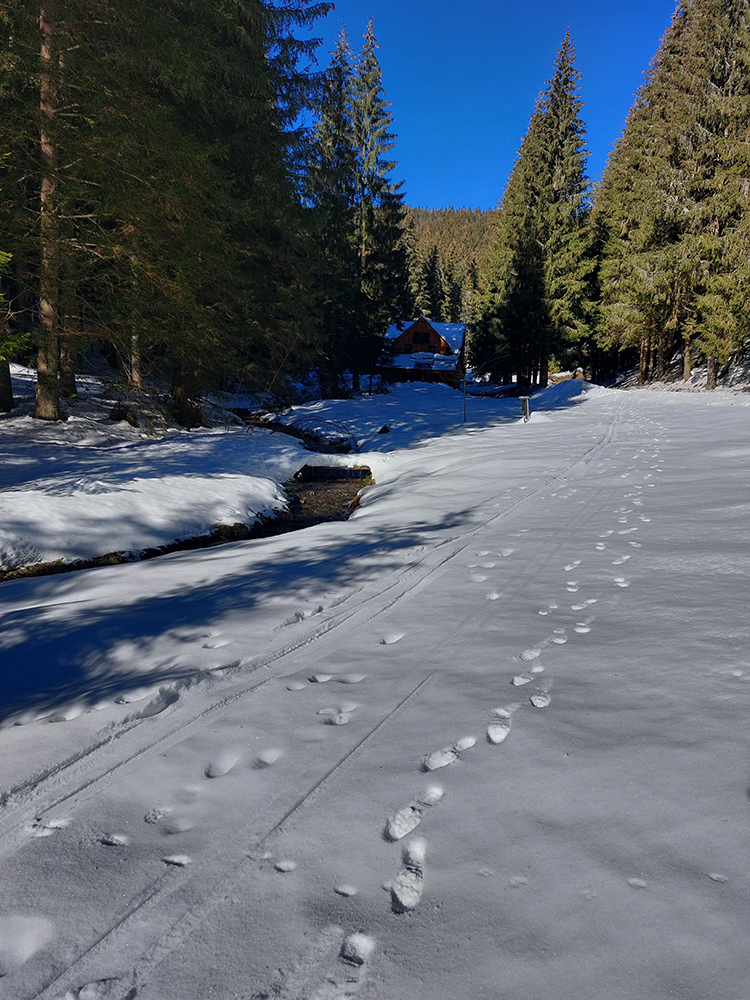 Odjazd popri potoku samozrejme očakávane komfortný, preleštený, snehu ešte dosť, zastavila nás až tá ťažba dreva na nižšej z dvoch polianok (U Báčika). Ale s tým už sme boli zmierení, poslušne sme vyzuli a netrvalo dlho, a už sme sa pod Prievalcom nakladali a tešili, ako po tejto odmene pre oči a nohy odmeníme aj hladné bruchá cestou domov niečím fajnovým. Vďaka za takýto modrobiely deň!