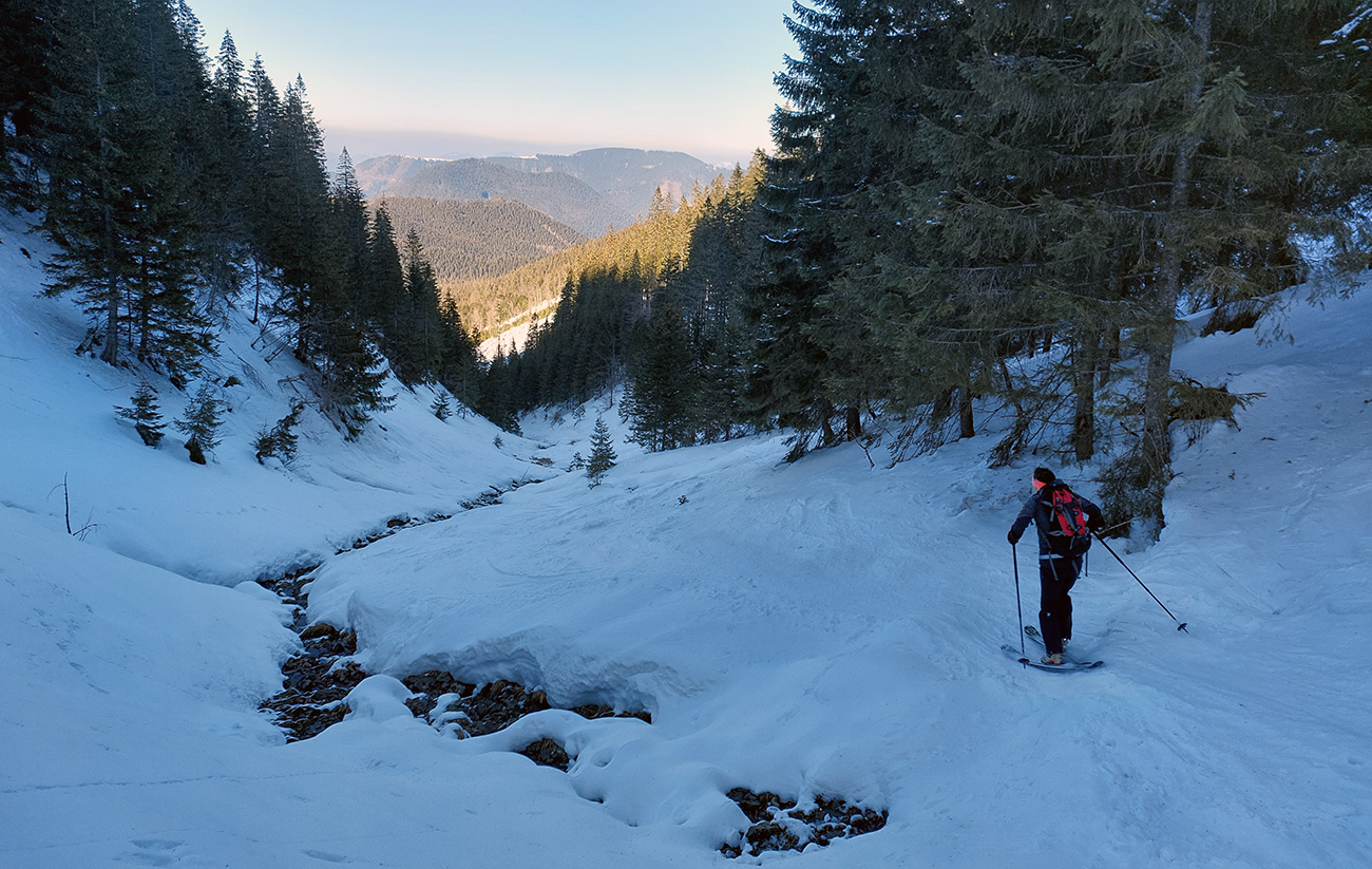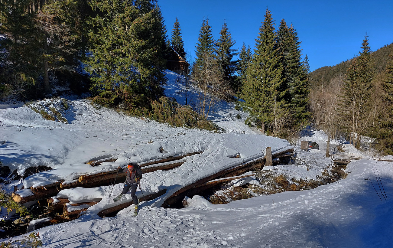 Nástup teda štýlový - cez kopu dreva, zapadanú snehom. Priamo cez potok asi. Ale sme proste nasledovali stopy. Viedenka zato parádne vyleštená, tvrdá, vôbec nie ľadovo šmykľavá. Aj rodinný výlet a pípajúci lavínový kurz sme minuli a bez podklzovania sme sa šťastne dostali až do kotla: