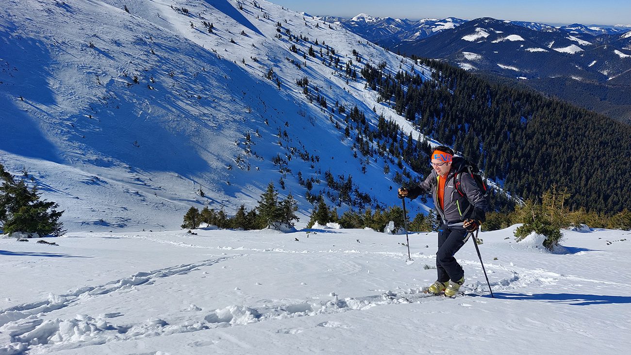 A tam samozrejme dilema, že kade hore. Zhodli sme sa napokon, že to vezmeme zľava a keď sa vyššie rozkukáme, uvidíme čo ďalej. Napokon sme to tam otočili dvakrát. Prvá jazda v parádnom prašane na tvrdom podklade, priamo do severu. Druhá trochu horšia o „zjazdovku“ vedľa, aj nejaké kôrky už za nohy ťahali, orientácia svahov už hrala podstatnú rolu. Ale slniečko sme videli po dlhej dobe konečne inak ako len cez okno pracovne, to bolo hlavné. A teplota ideál, aj vietor len osviežoval, nemrazil.