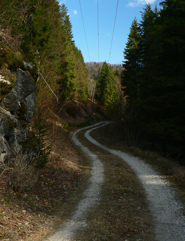 Cesta, o ktorej je reč, sa od hlavnej odpája kúsok nad železničnou stanicou Harmanec – jaskyňa (nejakých 600m n.m.) a dva kúsky od parkoviska pri jaskyni. Najprv sa chvíľu mierne vlní dolinou po vynovenom asfalte (pozor na brešúcich achilovkárov, strážiacich lesnícke kone), naberá sklon, míňa rezerváciu Harmanecká tisina, najdlhší železničný tunel u nás, skalné bralá vpravo, vľavo, prosto je čo obzerať. Za podjazdom medzi tunelmi sa mení na šotolinovú a opúšťa zelenú značku prudkou zákrutou doľava. Tu je to asi najkrajšie, o chvíľu aj najužšie pomedzi bralá a trochu strmšie. Pozor na „autoturistov“ – je to zároveň prístupová trasa k horskému hotelu Kráľova studňa. O kus vyššie na križovatke so Zalámanou dolinou treba prehodiť bajk cez rampu, nasleduje pár stoviek strmých metrov, ďalší malý kaňon a dolina sa otvára, sklon sa zmierňuje. Tu už ťažia (a hlavne zvážajú) drevo, podľa toho cesta miestami vyzerá. Vľavo nad hlavou hučia autá, vpredu v diaľke vidieť senník a vysoko nad ním v záreze ďalšiu cestu na Kráľovu studňu, tentoraz tú zo sedla. Za senníkom sa cesta skrúca doľava do bukového lesa a niekoľkými strmými serpentínami stúpa do sedla. Že sa blíži parkovisko je jasné, hádajte podľa čoho :-(