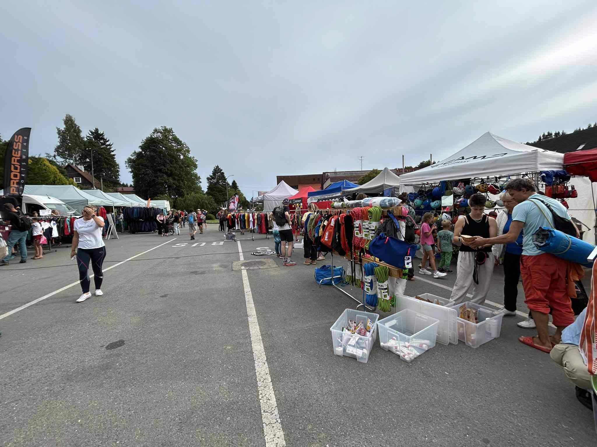 Po raňajkách sme sa vybrali do centra, ktoré sa rýchlo zaplnilo. Ulice lemovali desiatky stánkov so športovým vybavením – od lezeckého materiálu cez cyklistické doplnky až po turistické oblečenie. Festivalový trh pripomínal jarmok, len namiesto cukrovej vaty ponúkali lyofilizované jedlo a namiesto autíčok na ovládanie ste tu mohli kúpiť nové lezečky. Ceny boli často nižšie než na internete, takže nebolo ničím výnimočným vidieť ľudí, ktorí sa už prechádzdali s nakúpenými novými lanami a batohmi.
