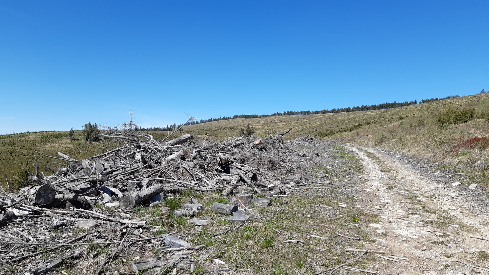 No jednoducho keď už ozaj začínalo byť zle dostal som sa z polomu na rúbanisko, vyčistené, s čerstvo nasadenými stromčekmi. Jazdiť sa nedalo ale aspoň som popri bajku dole po spádnici kráčať mohol na najbližšiu zvážnicu, po nej už opäť na bajku až do sedla Olchová jama 1080m.