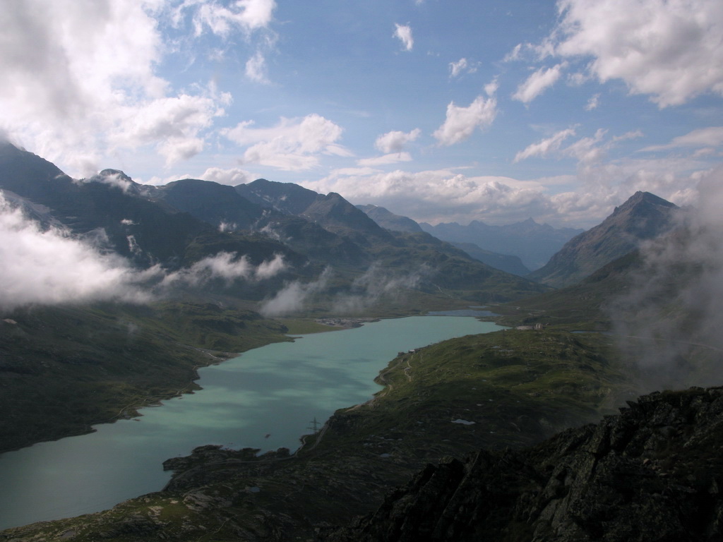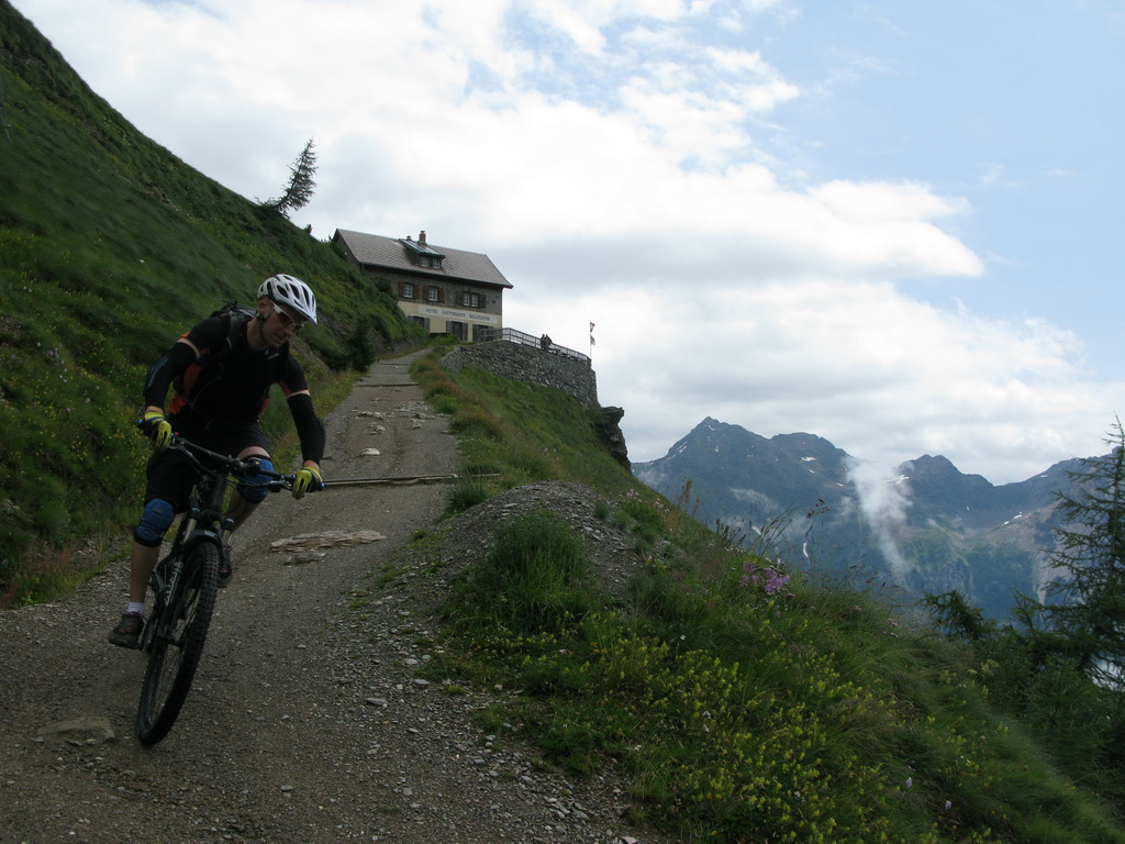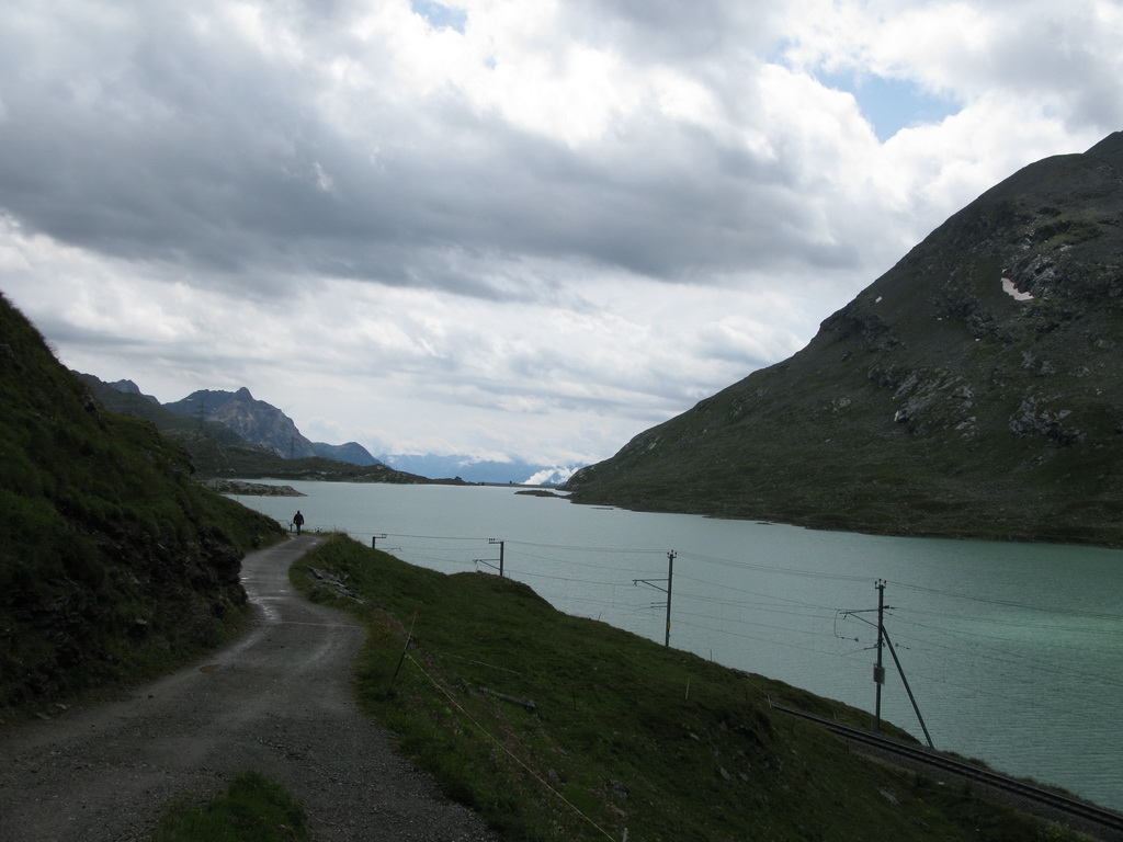 Zjazdujeme dole po štrkovej ceste ku Lago Bianco a popri brehu ideme miestami pekným trailom až ku priehradnému múru. Tu míňame odbočku k reštaurácii Sasal Mazon a zjazdujeme dole po pomerne ľahkej ceste smerom Alp Grum.