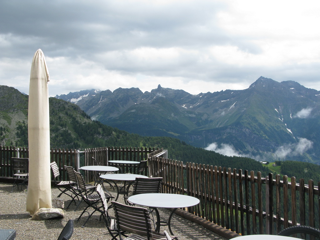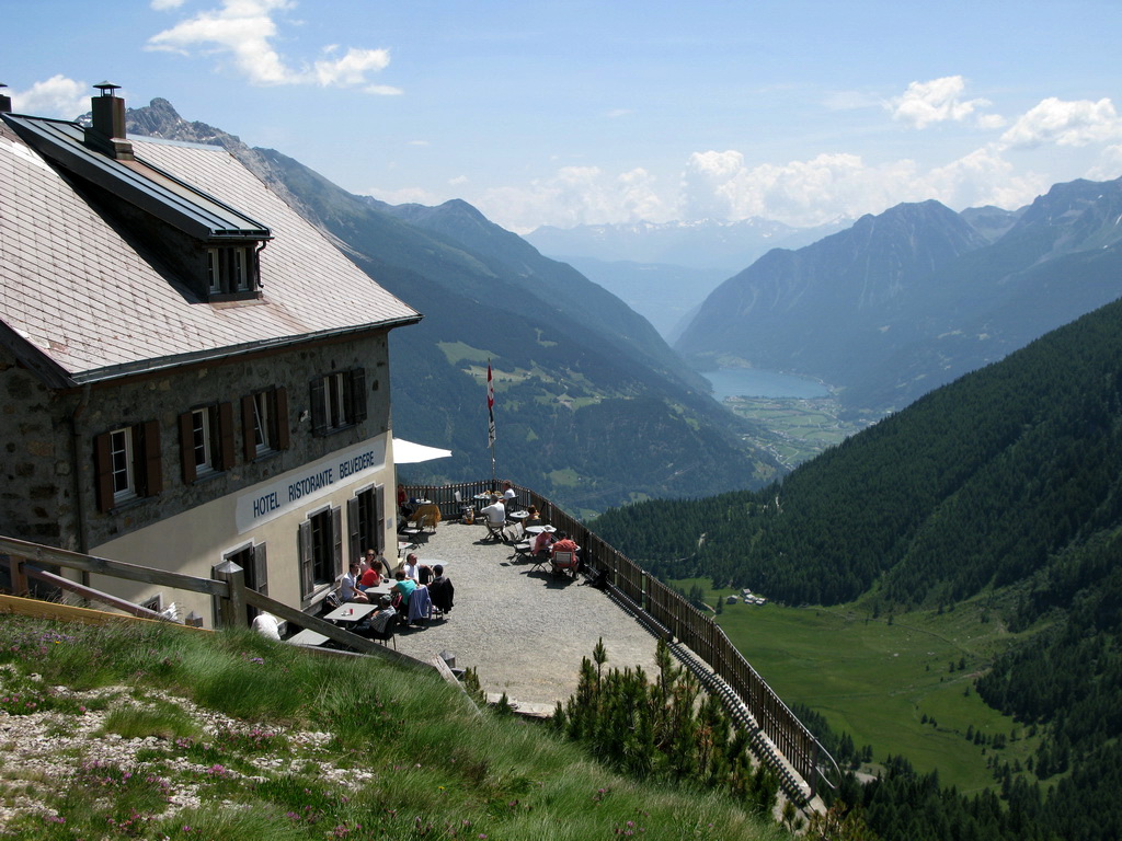 Zastavujeme pri vyhliadkovej reštaurácii a zostupujeme z bajkov. Značkovaný chodník tu totiž vedie pomedzi stoly. Vychutnávame výhľady, fotíme. Smerom na západ úžasné výhľady na Piz Palú, Piz Chambrena na opačnej strane zase zaujme špicatý masív Piz da Teo. Pod nami vykrajuje zátačku vláčik, ktorým sa budeme vracať.