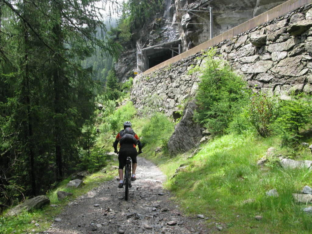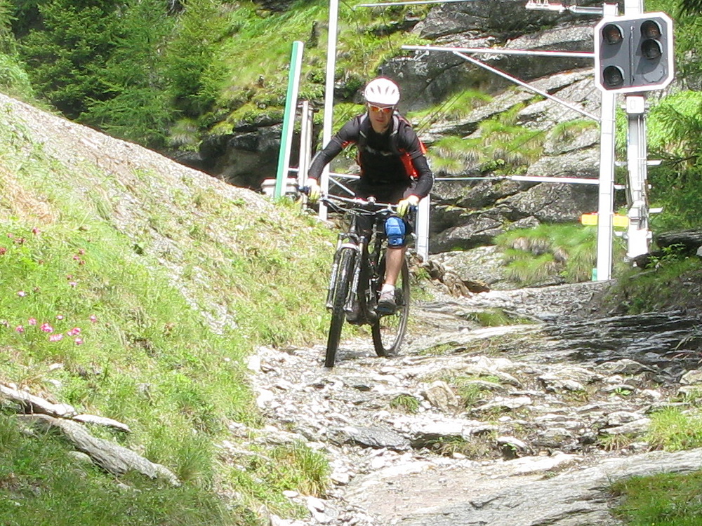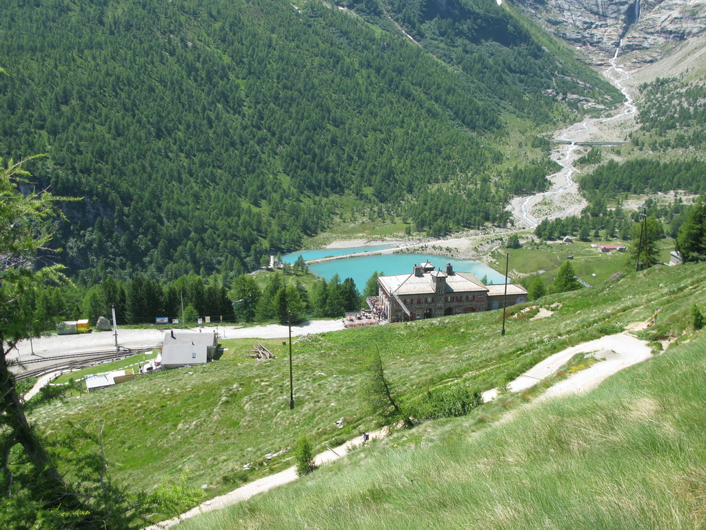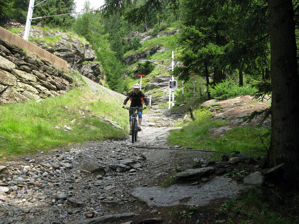 Zjazdujeme popri vlakovej stanici. Môj pokus z minulého roku keď som zjazdoval až ku jazeru skončil znášaním pomerne dlhého nezjazdného úseku. Preto tentoraz sledujeme bajkové značenie. Až po Alp Grum je zjazd pomerne ľahký a rýchly. Tu prechádzame popri pár domčekoch a znovu popri vlakovej stanici až prichádzame na križovatku pri Ľadovcovej zahrádke (Giardino del Giacchaio). Sú tu zaujímavé skalné útvary, oplatí sa zosadnúť z bajku a dať si malú prechádzku po kovových schodoch.
