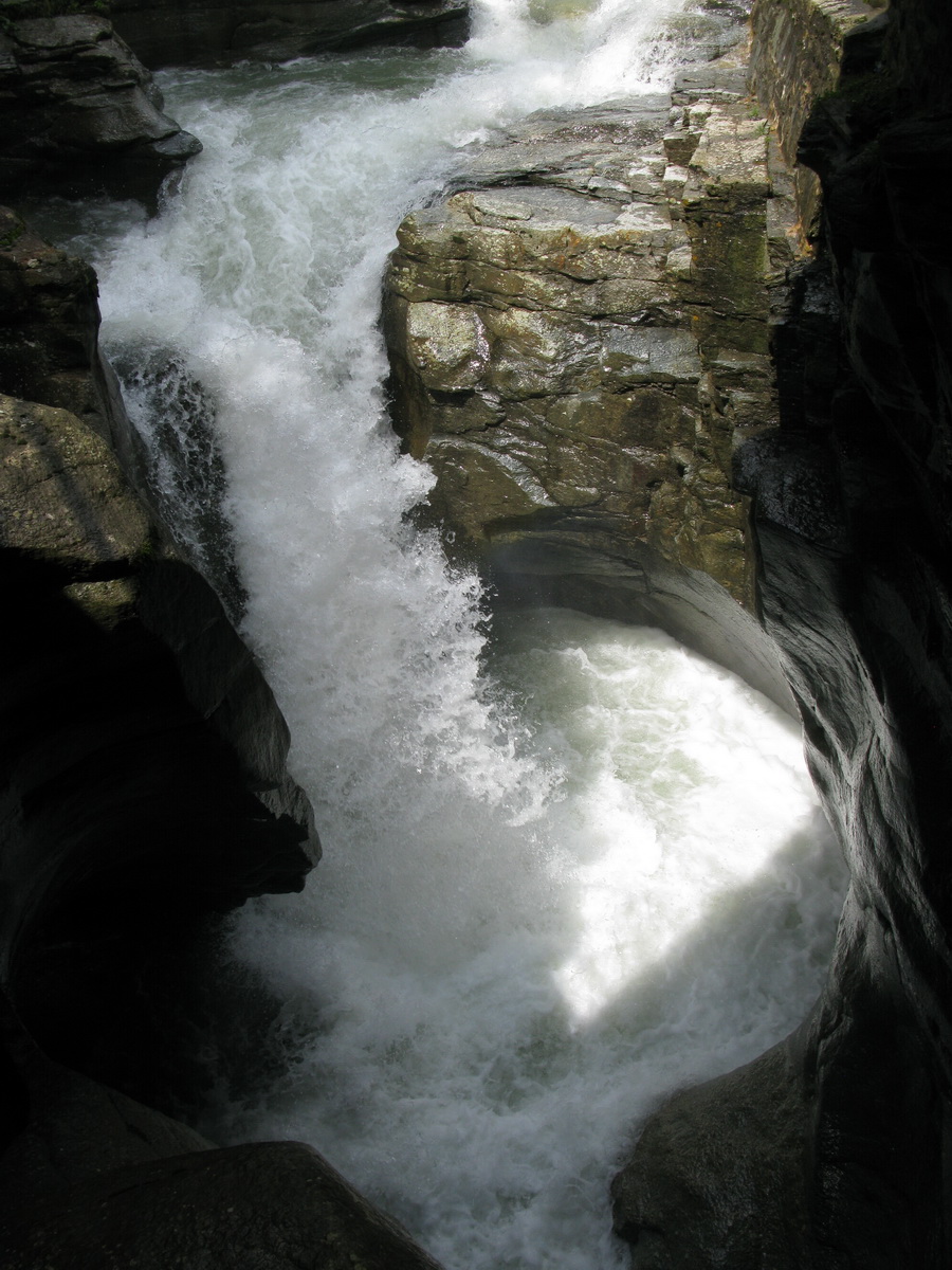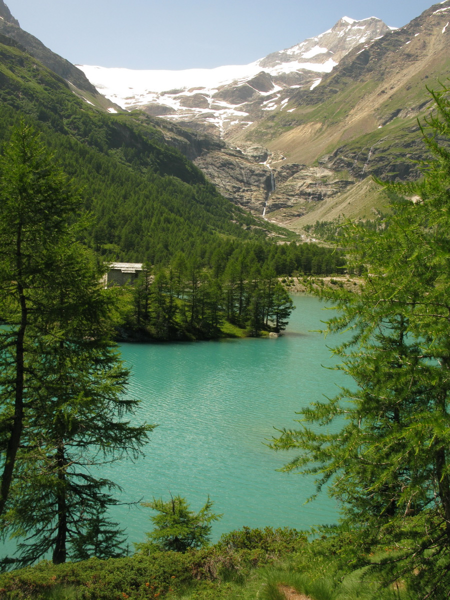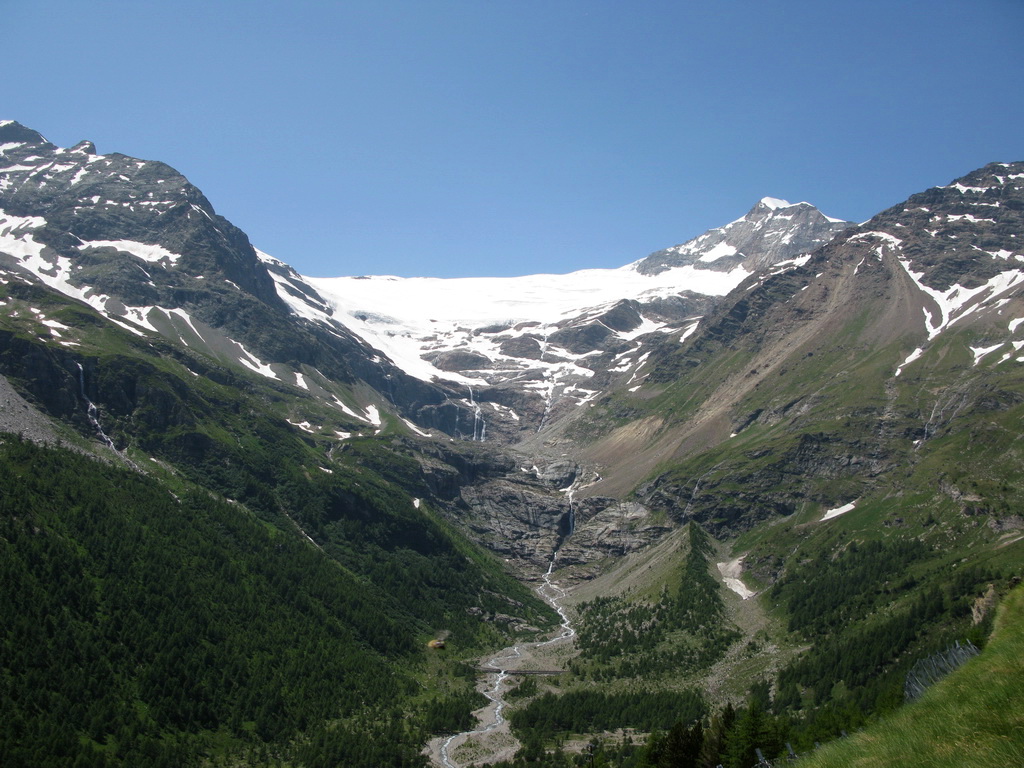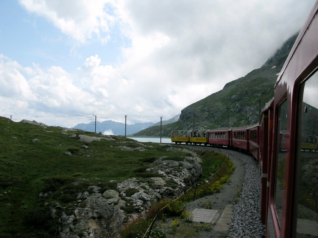 Zjazdujeme popri vlakovej stanici. Môj pokus z minulého roku keď som zjazdoval až ku jazeru skončil znášaním pomerne dlhého nezjazdného úseku. Preto tentoraz sledujeme bajkové značenie. Až po Alp Grum je zjazd pomerne ľahký a rýchly. Tu prechádzame popri pár domčekoch a znovu popri vlakovej stanici až prichádzame na križovatku pri Ľadovcovej zahrádke (Giardino del Giacchaio). Sú tu zaujímavé skalné útvary, oplatí sa zosadnúť z bajku a dať si malú prechádzku po kovových schodoch.
