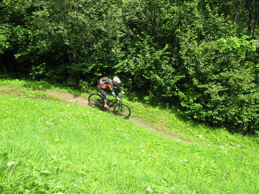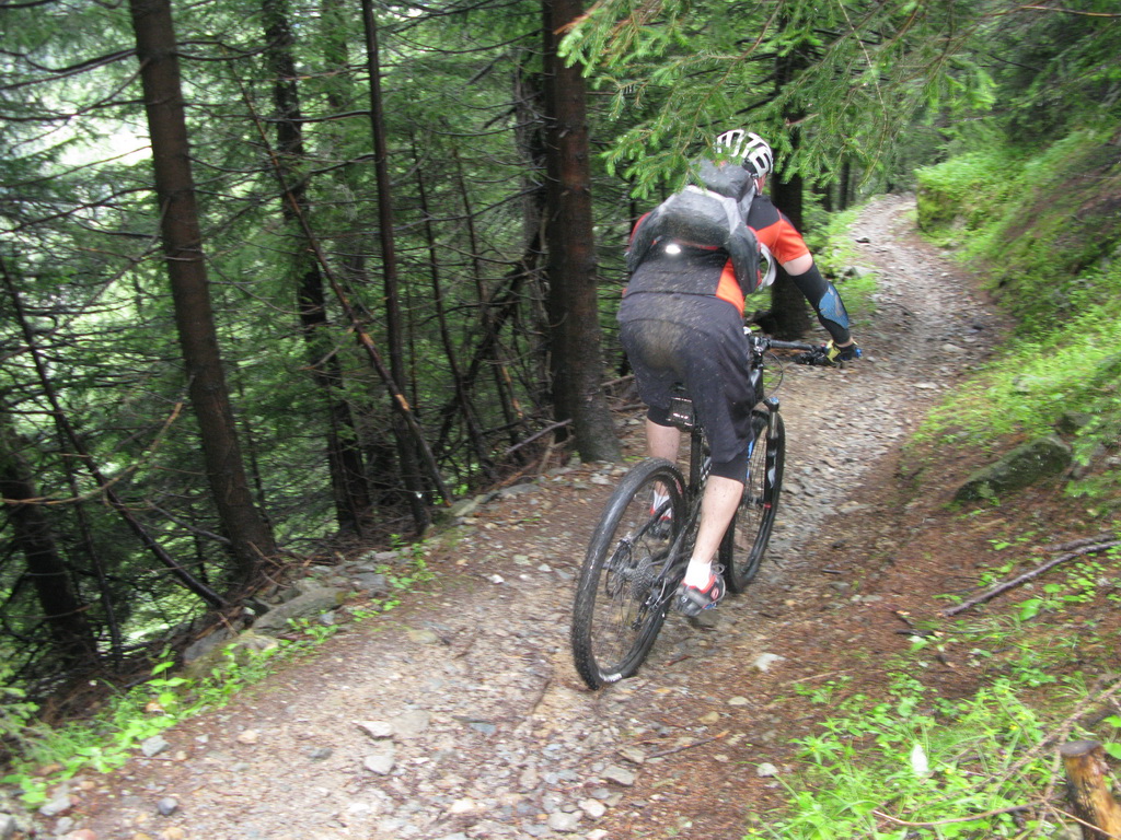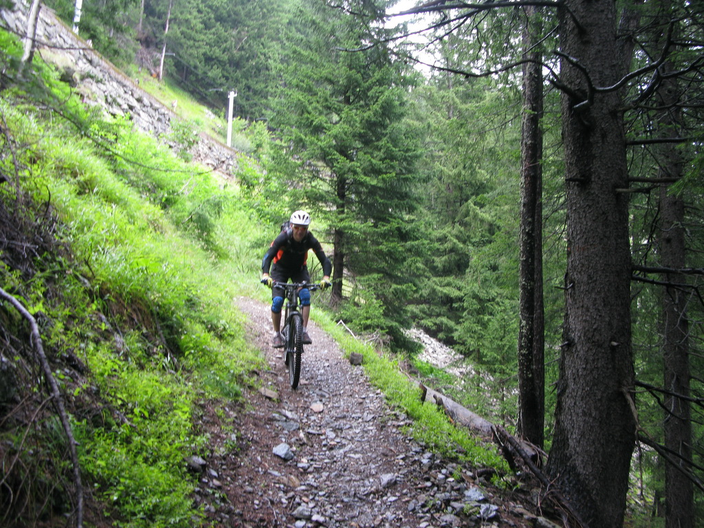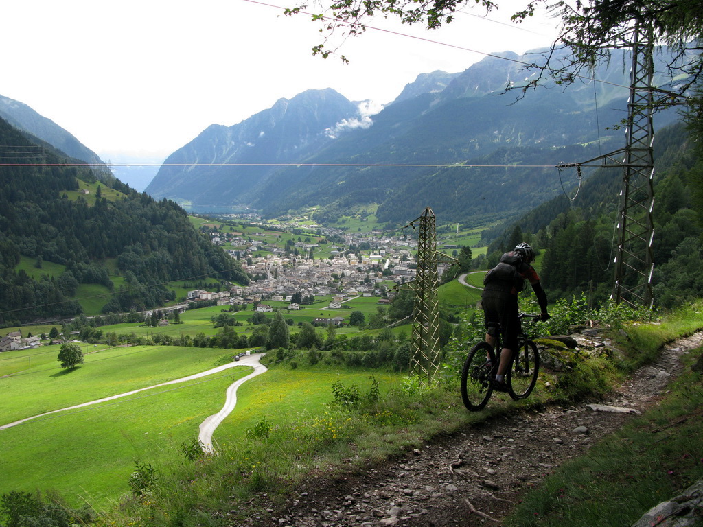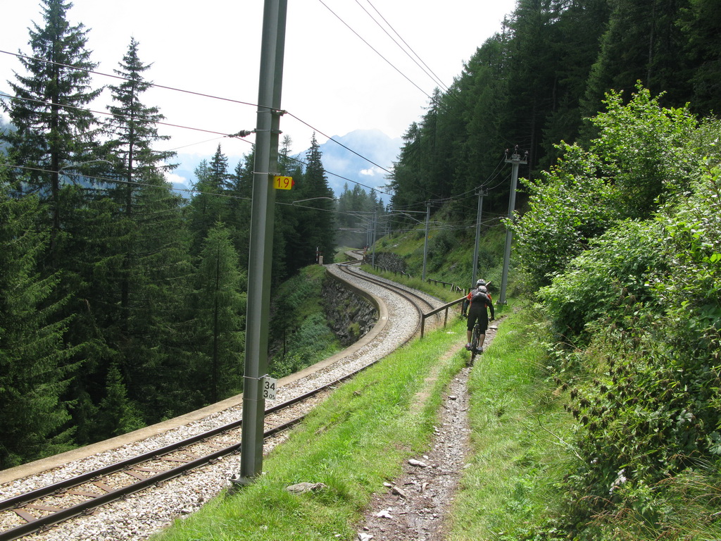 Trail tu pretína na viacerých miestach trať železnice, treba dať pozor a nenabúrať do vláčika :) Táto časť zjazdu od skalných hrncov už uspokojí aj tých najnáročnejších bajkerov. Chodníček je samý kameň a koreň, prudké točky a množstvo technických pasáží. Na niekoľkých miestach si ešte treba dať pozor na orientáciu a odbočiť v podstate stále dole. V závere trailu už pomaly vychádzame z lesa. Ukazuje sa nám pekný výhľad na Poschiavo. Dávame ešte trail po hrádzi a už po asfaltke sa púšťame do mestečka. Máme za sebou takmer 1300v.m. dole kopcom.