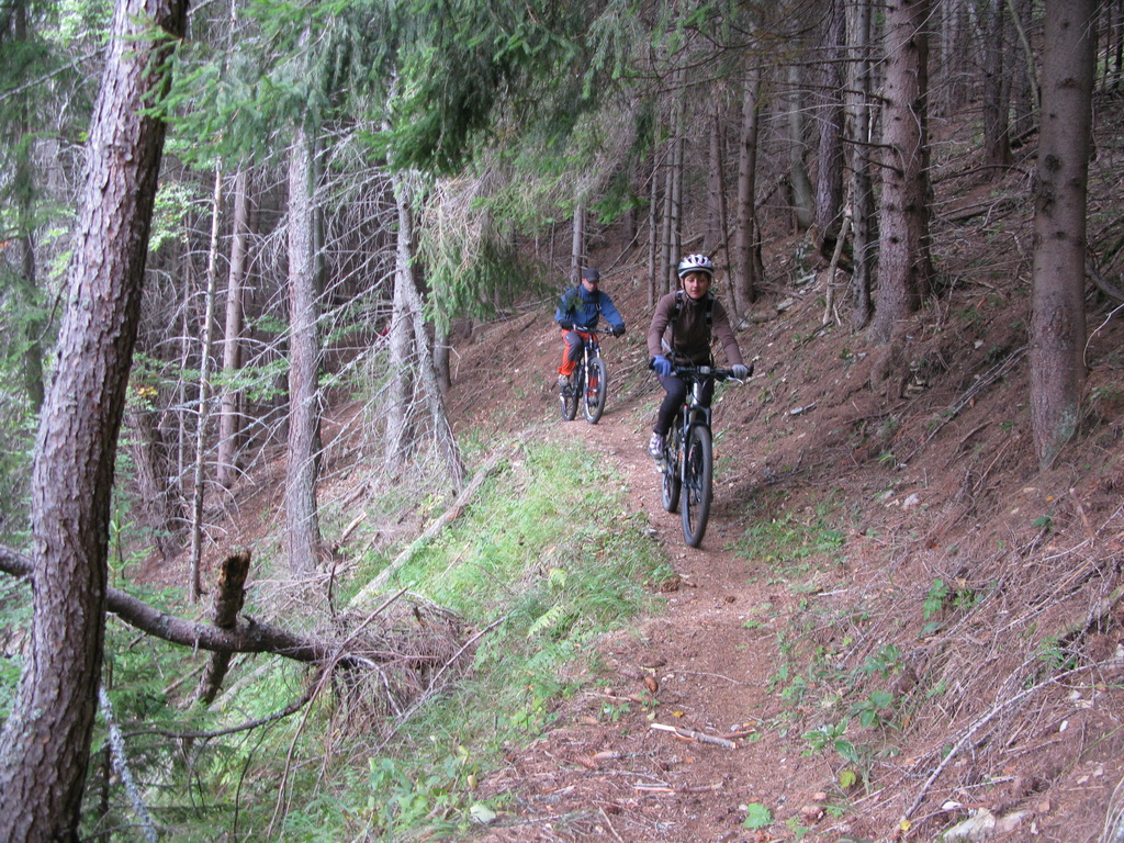 Zjazdujeme. Nádherný a divoký chodníček, sem tam zapadaný stromami. Všade plno pavučín. Na zemi hlboké lístie. Nad Vernárom sa napájame na najkrajšiu časť trailu. Tu domáci aktivisti spravili krásny zjazd s klopenkami a menšími skokmi, dá sa samozrejme prejsť aj bez skákania.