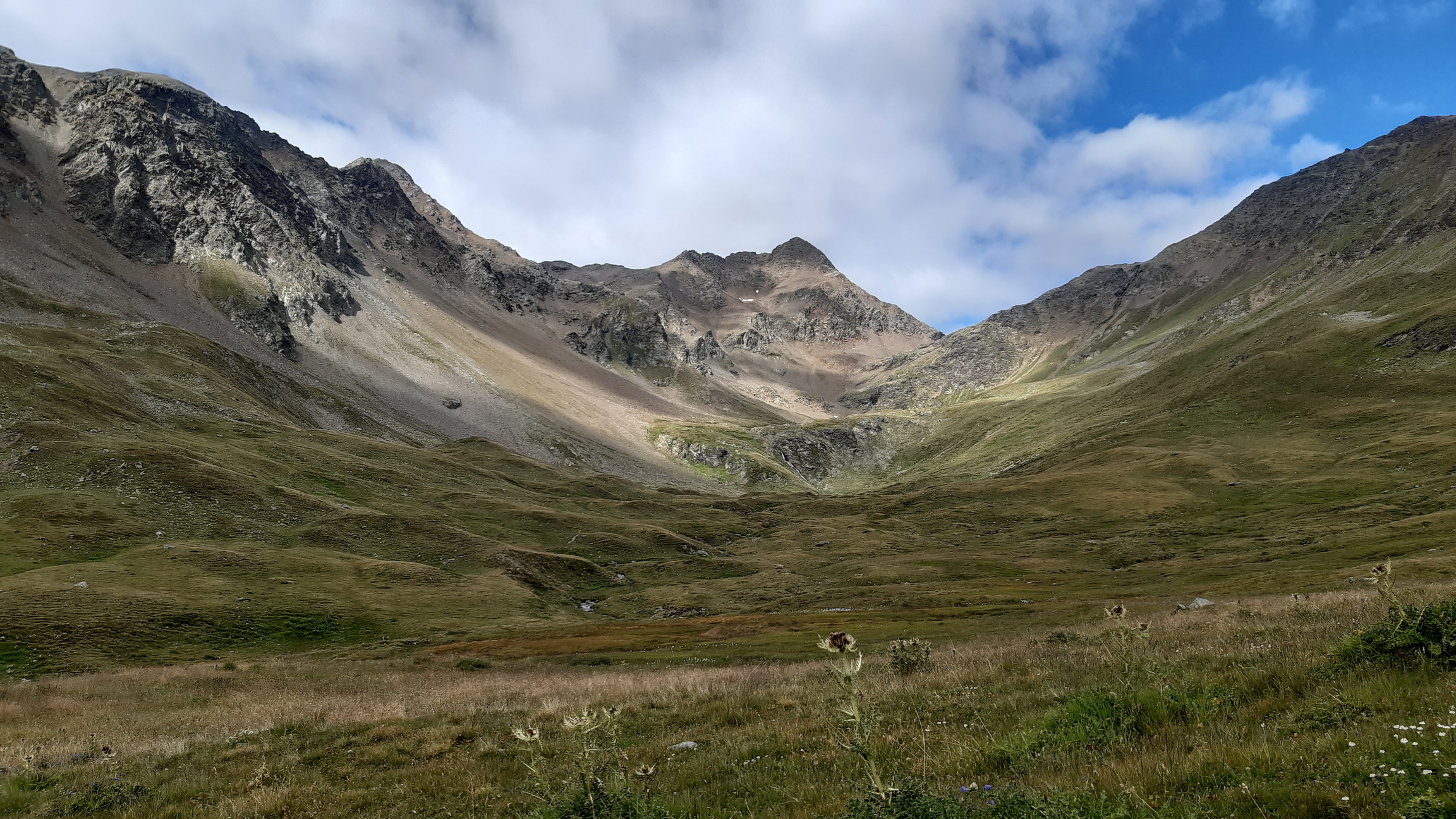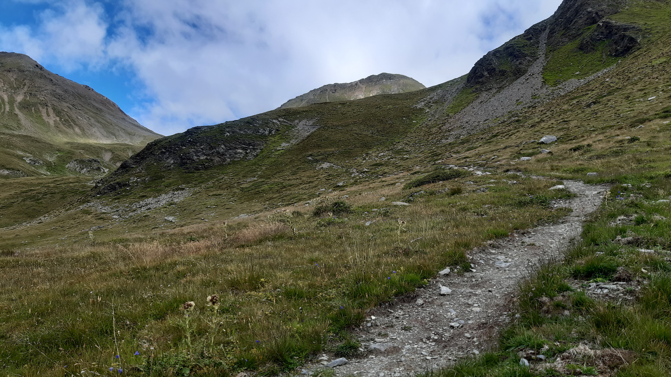 Mal som dnes šťastie, že doobeda bolo pod mrakom a chladno. Nestratil som tak drahocenné tekutiny, to sa ale zakrátko v stúpaní na passo Cassana zmení. Vyšlo slnko a vietor moc nefúka. V najťažšom stúpaní, aké som kedy v Alpách zažil, sa potím celkom dosť a zarábam si na nejakú tú dehydratáciu...
