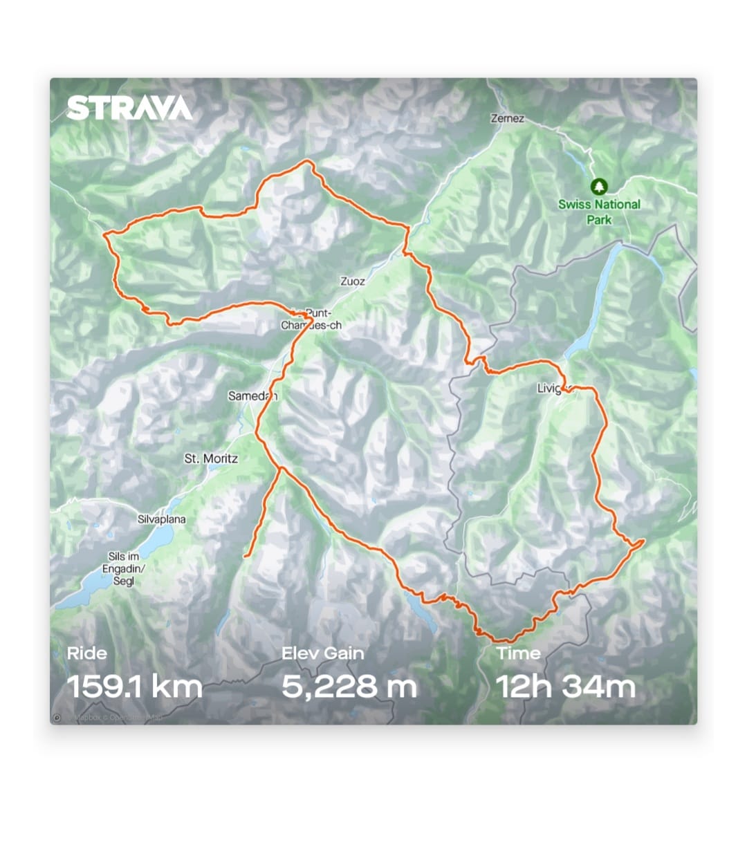 Val Roseg 2000 - Berninapass 2327 - Passo Val Viola 2455 - Passo della Vallaccia 2614 - Passo d´Eira 2210 - Livigno 1805 - Pass Chaschauna 2687 - Chapella 1633 - Kesch hutte 2627 - Bergun 1380 - Albulapass 2312 - La Punt 1686 - Val Roseg, 159km, 5228v.m., 13:30hod.