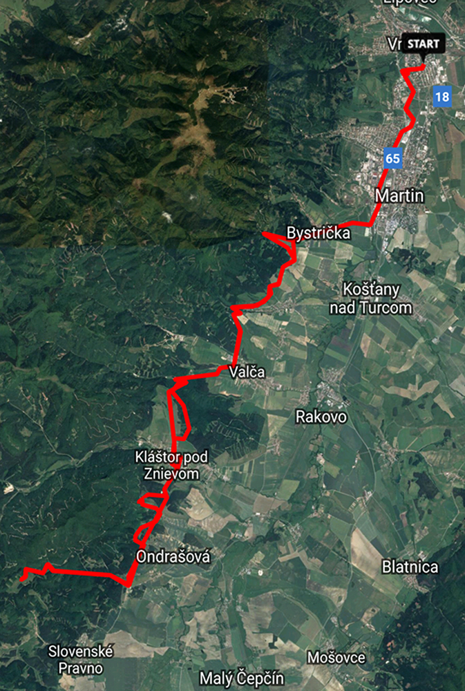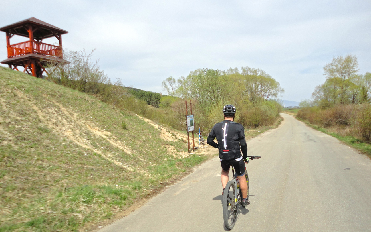 Z tankodrómu nad Martinom (toho skutočného, nemyslím cestu I/65) už spravili cyklotrasu, ale my lenivci pekne po rovinke popri Turci až pod Bystričku, ešte to tak, kopec na úvod! Na Bystričku aj na tankovú cestu nad ňou už je to stúpanie, ale mierne, tak to má byť, takto zrána a zjari. Okolo cesty okrem starých posedov nové rozhľadne (nad Petrom a Trebostovom), už tam nejakí cyklovýletníci parkovali - kempovali.