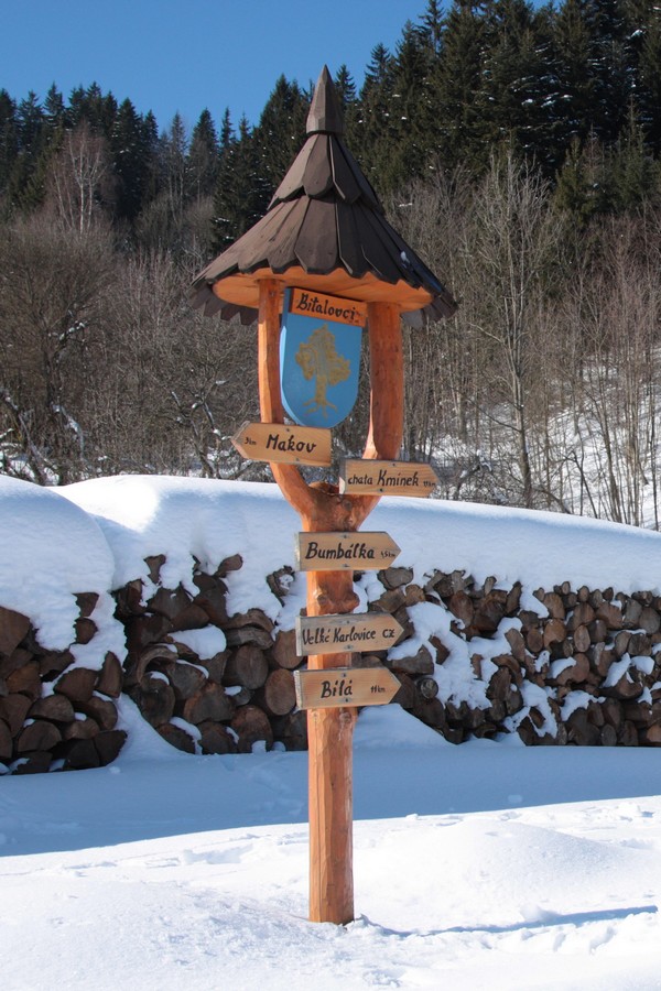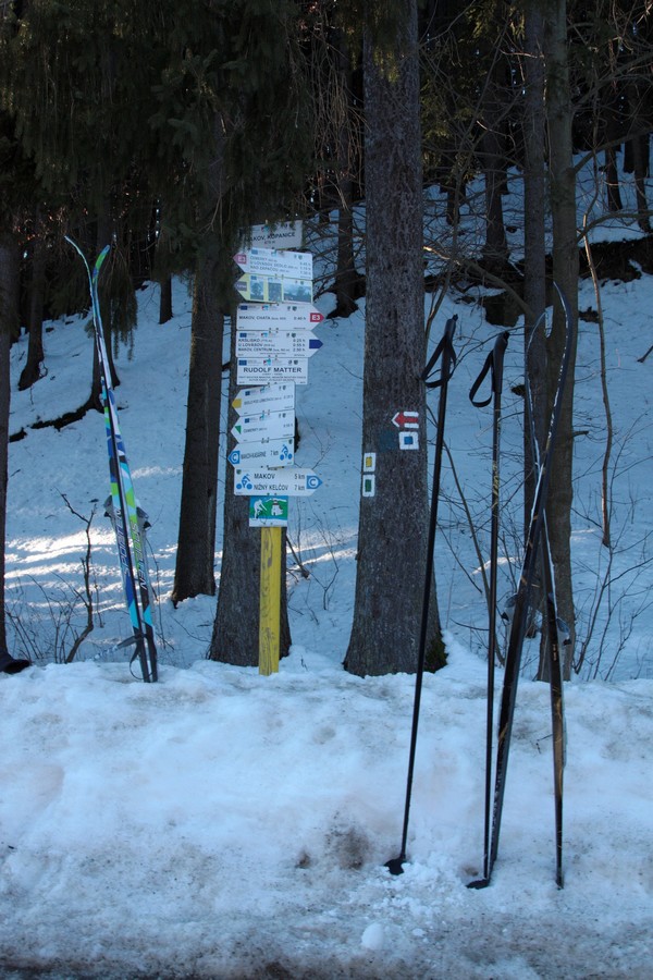 Z Makova nás čaká výstup po modrej na chatu Kmínek. Trochu nás vystraší prehrnutá a posypaná cesta, ale už na hornom konci dediny sa nepriateľský posyp stráca a my môžeme obúvať. Ujazdený a jemne primrznutý terén je nenáročný, len miestami nás trochu potrápi nejaké to prudšie stúpanie. Pri Bajcarovcoch musíme na chvíľu vyzuť, lebo sneh akosi skapal, no okrem toho je to bezproblémový presun na striedačku slnkom zaliatymi lúkami a vysneženým lesným koridorom. V sedle nad Bitalovcami je už rušno, hneď poznať, že sa tam dá dostať autom. Až ku chate Kmínek treba dávať pozor na chodcov a ďalších bežkárov a tesne pri chate aj na vlek, ktorý v zjazde križuje našu trasu. V altánku pri chate vyhlasujeme obedný štrajk.