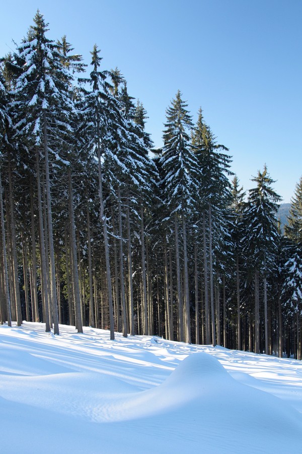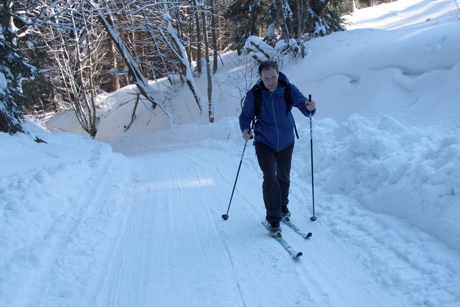 Z Kmínka na Bumbálku už splývame s bežkárskym davom na upravenej stope. Síce sa tu pohybuje aj veľa pešiakov, ktorí stopu „upravujú“ po svojom, stále je to však viac ako luxusný terén. Žiadne prudké stúpania, ani odvážne zjazdy, zato výhľadov a slnka utešene pribúda. Upravený terén vydrží po Bumbálku. Od sedla hore to vyzerá trochu bojovo. Hlboký prašan v strmšom stúpaní preverí kondičku. Vyzuť nemôžeme, snehu je vyše kolien, stromčekovať sa v tej mase nedá, tak len strúhame nekonečné pomalé serpentíny, kým sa vyštveráme k horným chatám. Tam už terén trochu zvoľní a v lese sa opäť napojíme na prehrnutú cestu. Ďalej už kopírujeme viac-menej CZ-SK hranicu. Miestami sa otvárajú výhľady na rodnú hrudu až po hradbu Západných Tatier. Príjemné lesné úseky s minimálnymi stúpaniami a klesaniami však zaklincuje divoký zjazd rozbitým lesným válovom do sedla U Tabulí. Počiatočný pokus zísť to cestou po pár hodených tigroch balíme a štrikujeme radšej krížom-krážom lesom. V sedle opäť pretíname asfaltku a kocháme sa širokou ratrakovou stopou akéhosi miestneho bežkárskeho okruhu na českej strane. Hneď by sme sa nechali zlákať, mať tak času nazvyš.