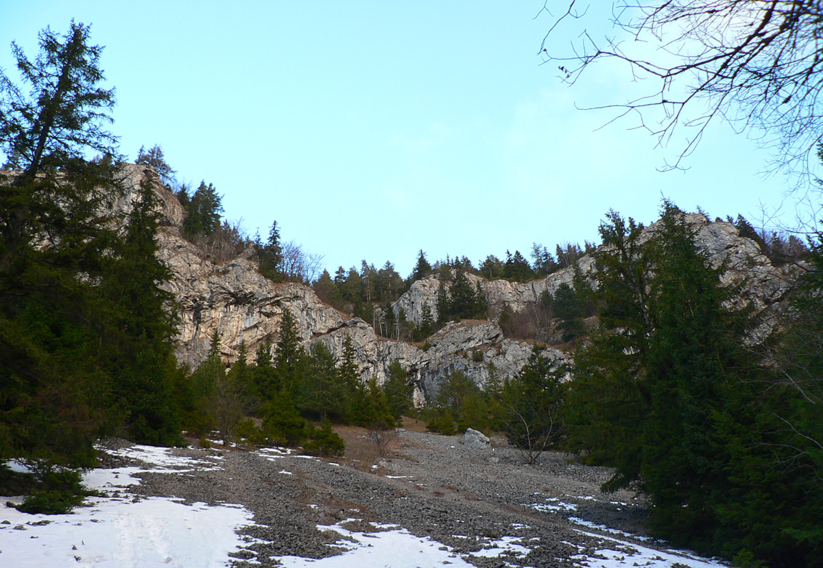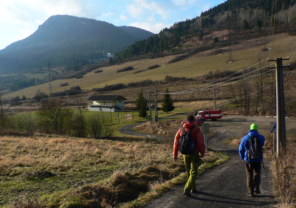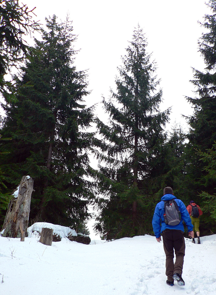 Nad dedinou ozaj krásne, pri pohľade dozadu nad kopce Šípskej Fatry. Dopredu pohľad na klenbu lesa nad chodníkom, strmina striedaná naklonenou rovinou, fučíme ako rušne... Nižšie ľad a šutre, vyššie ľad a tvrdé snehy. Už pred deviatou je tu rušno, už aj zhora idú niektorí, niektorí aj zodpovedne na mačkách.