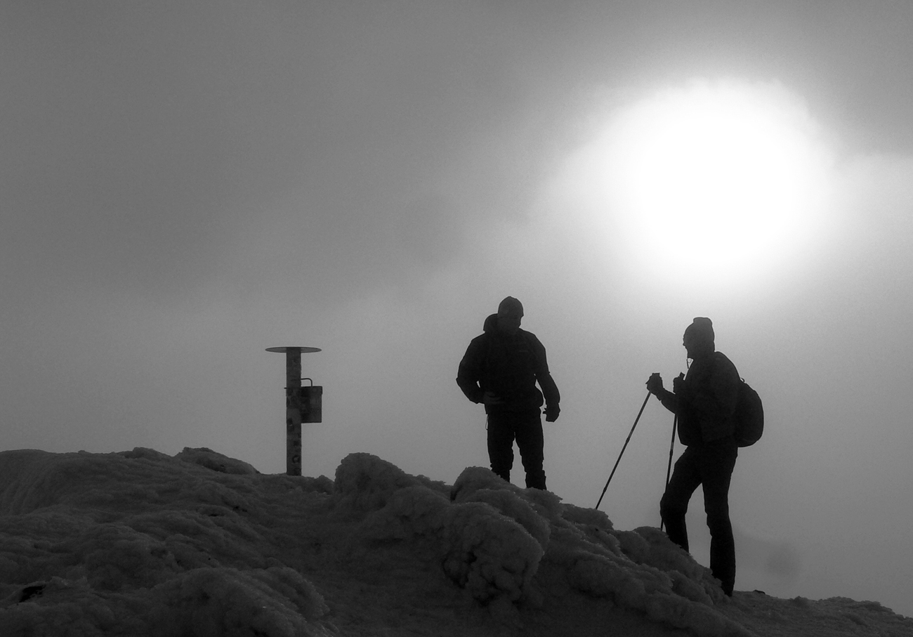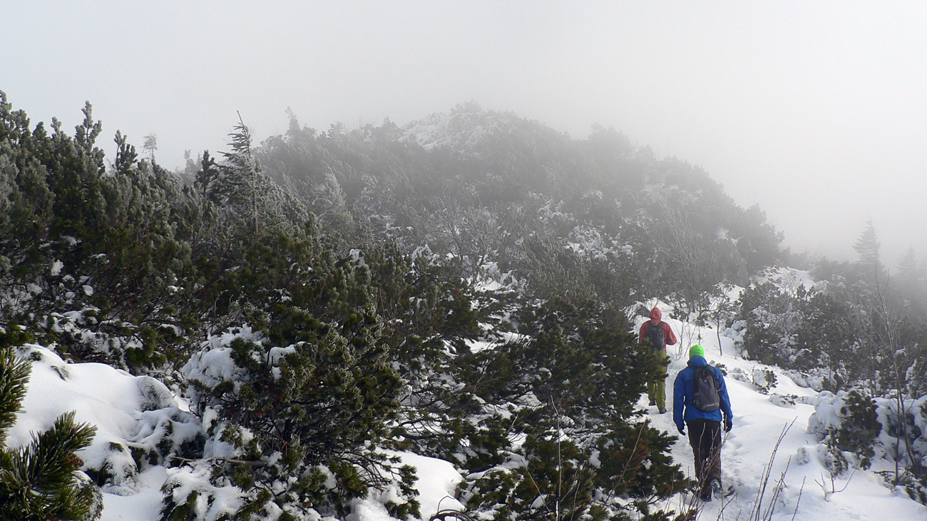 No ale stúpame ďalej, keď už sme tu. Z juhu fučí, mraky sa ženú kamsi na Oravu, front sa sem rúti skôr ako rosničky predpovedali. Konáriky omrznuté z jedného smeru, my o chvíľu tiež. Sprava.
