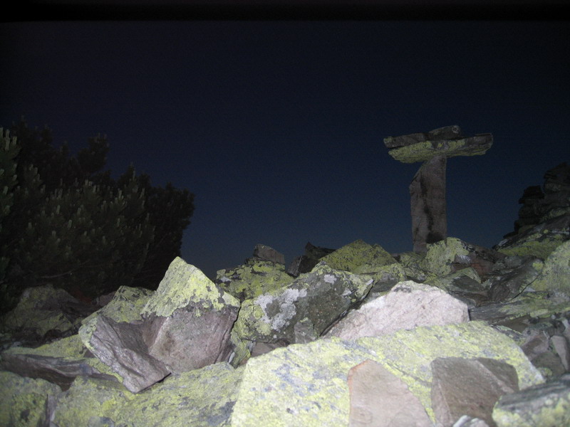 Pred Prašivou sa ale začína brieždiť a aj my ako by sme sa prebúdzali. Vypíname lampy a zrýchľujeme na vrcholovú hŕbu kameňa. Povinný oddych pre navigátorove kĺby pred (pre neho) najhorším zostupom do Hiadeľského sedla, zopár fotiek našich strhaných ksichtov (v budúcnosti nás možno od podobného šialenstva odradia), vetrovky do ruksaku (aby sme ich nepotrhali o konáre) a pomaly zostupujeme. Po niekoľkých minútach sa ozve nosičov vypnutý mozog. Myslí si že ideme po nesprávnom chodníku a namiesto pohľadu do mapy vyženie telo nazad na kopec, kde samozrejme zistí, že chodník je tu len jeden. Ale aspoň navigátor si znovu môže oddýchnuť, takže o nejakých 5 minút pokračujeme v zostupe.