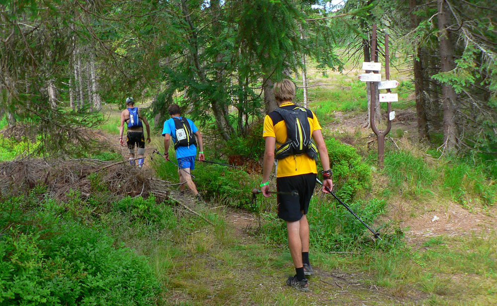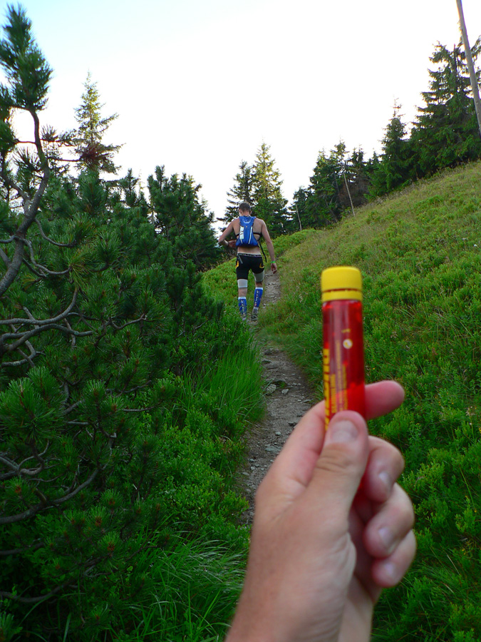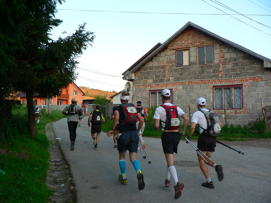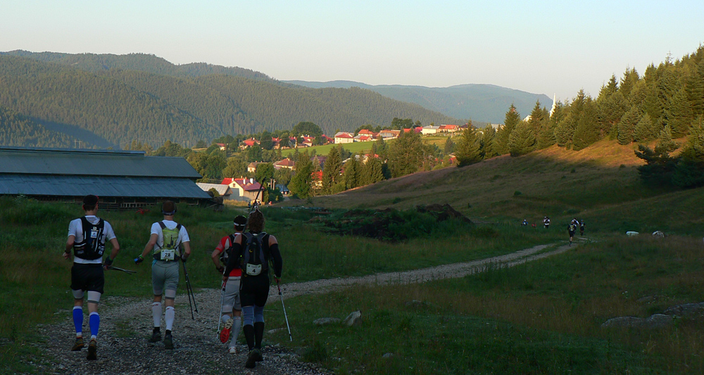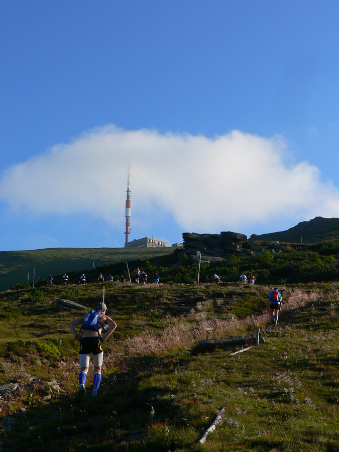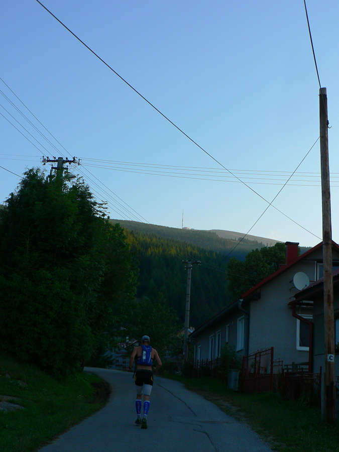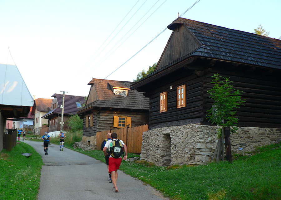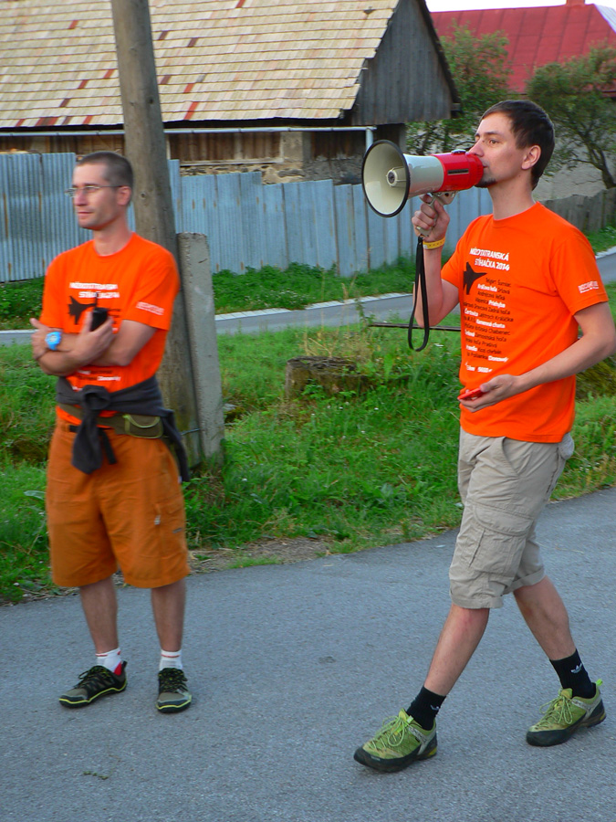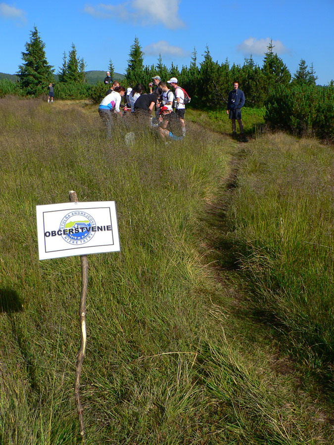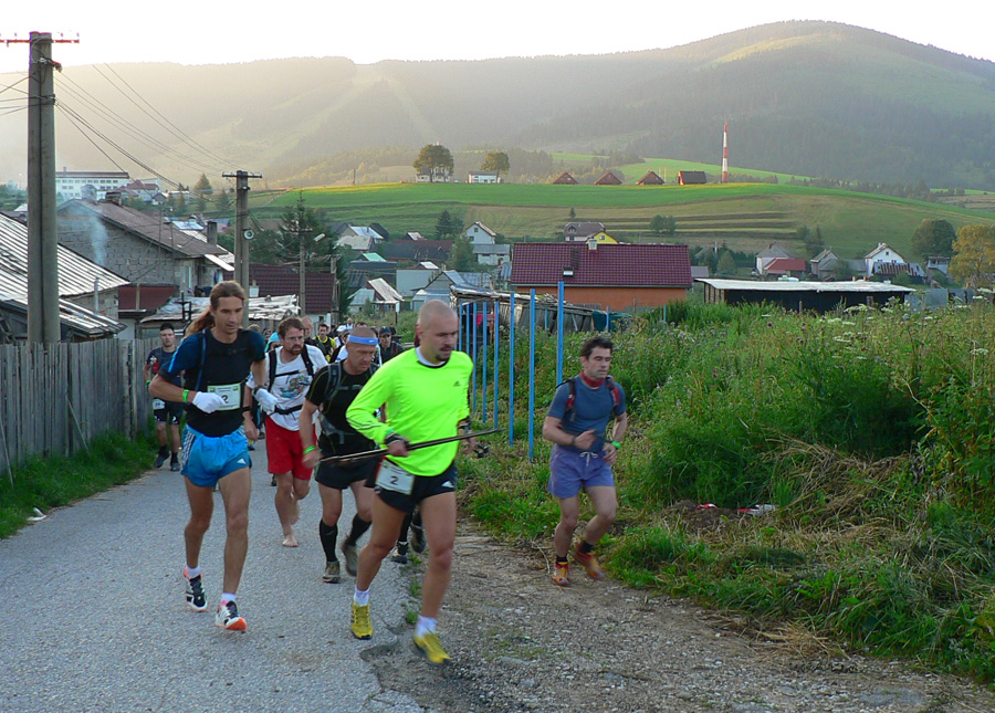 Nevyhnutný svetoznámy megafón funuje, tak sa môže štartovať a už sa beží: prví dvaja to napálili tak, že ten poplašenejší z nich už v „osade“ zle odbočil. Nebyť toho, že za ním ostatní zakričali, už by bol zožraný :-) Inak pohoda, vykecávačka až na Šumiac, veď skoro po rovine. Značenie super, len jedinú chybu to malo: vysoká tráva a skoro žiadny chodník na niektorých miestach by za mokra všetkých premočili vyše pása, nielen na nohách. Už na začiatku bežať čvachtajúc, nič moc perspektíva... Našťastie bolo sucho a tú trochu rosy otriasli prví :-)