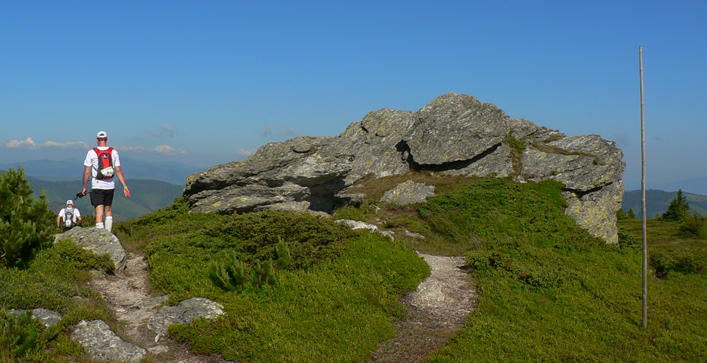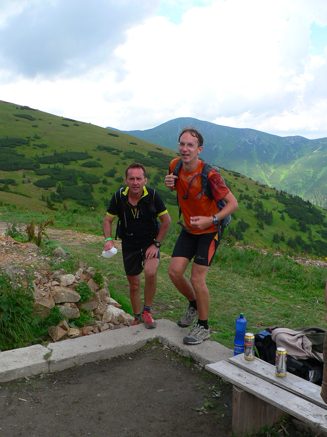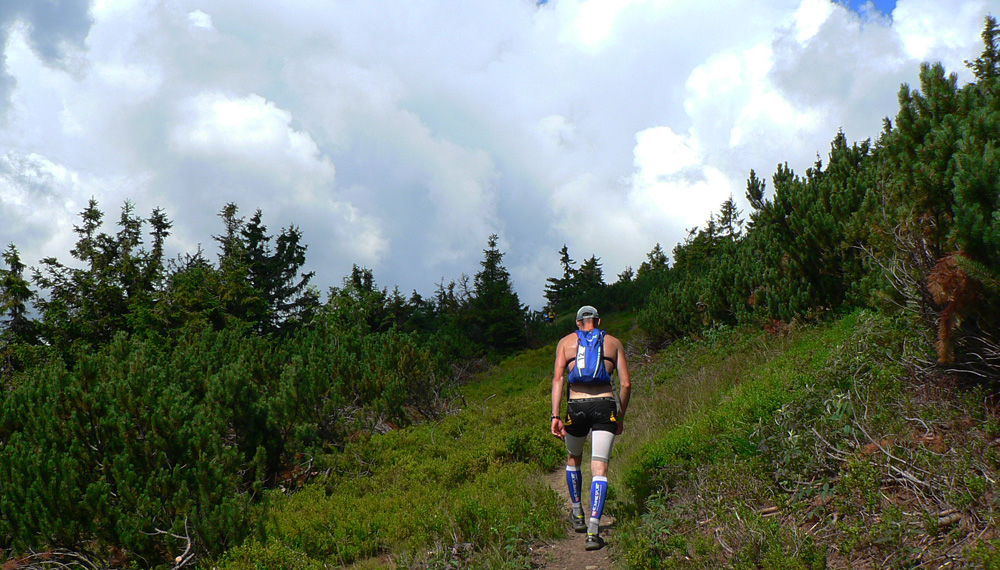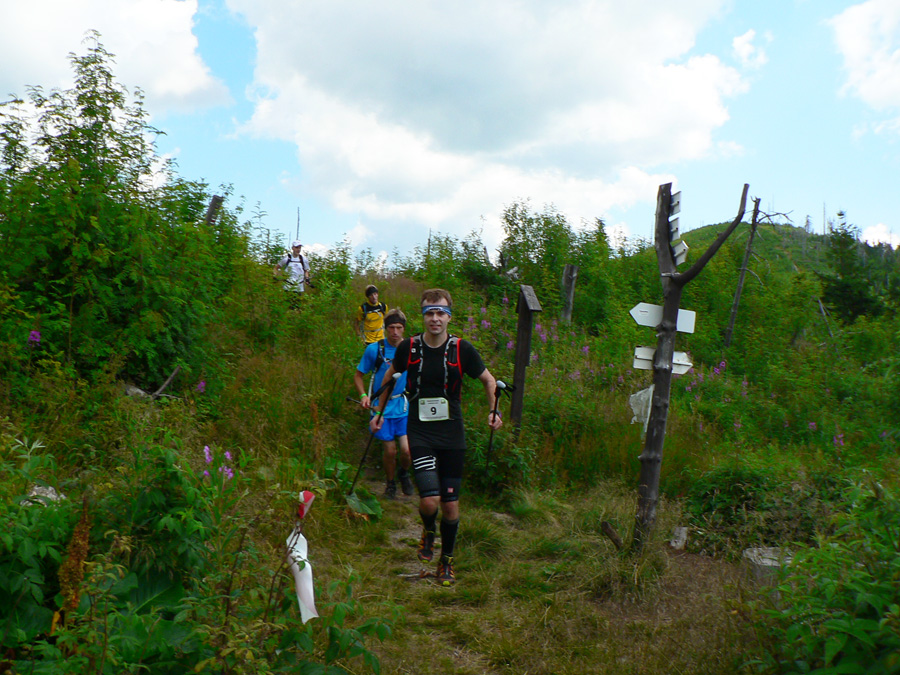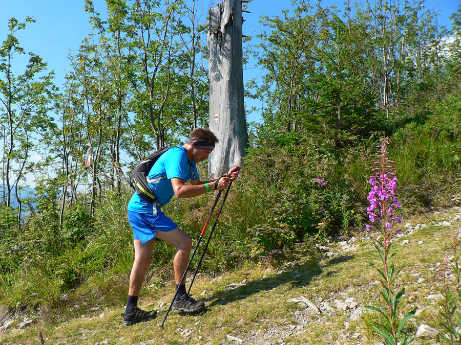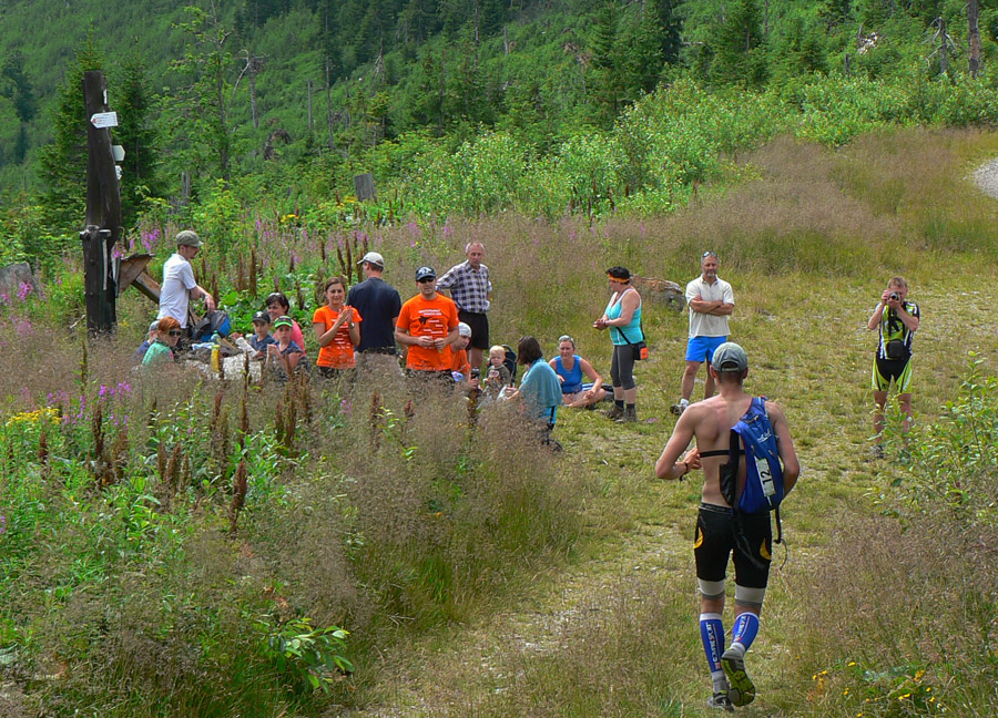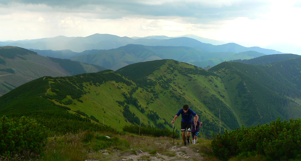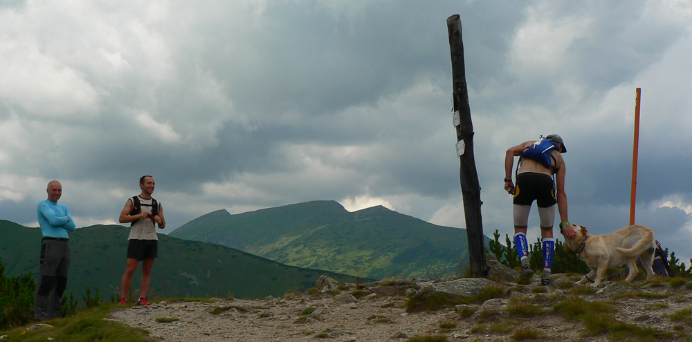 A to počasie? Ráno krásne, teplota príjemná, ale bolo cítiť začínajúce dusno a oblaky aj obavy rástli. Okolo obeda už bolo vidieť sivé steny lejakov nad Liptovom aj Horehroním. Hrebeň to ako zázrakom obchádzalo, ale nakoniec to popoludní schytala naplno Čertovica a okolie. Kvôli tomu tam dosť dvojíc z druhej polovice pelotónu premoklo do nitky a radšej nevyužili možnosť zapretekať si až po Trangošku (tam vraj nakoniec dorazilo 16 dvojíc). Pred druhou sme to ešte niektorí schytali pod Králičkou, ale to bola len super sprcha na umytie zasolených hláv a tým to skončilo. V diaľke ešte zo dva razy zahrmelo a už bolo len lepšie, až do konca: väčšinou príjemne pod mrakom, luxus v porovnaní s vlhkými trópami v prvej časti. Hrozne som rád, že tentokrát strašidelná predpoveď nevyšla, tragédia počas lanskej MF100 hovorí za všetko...