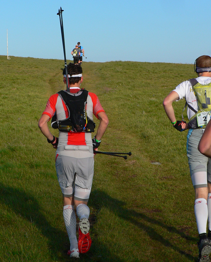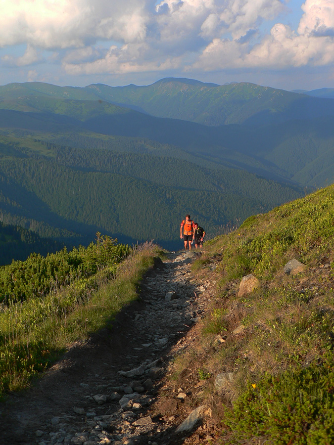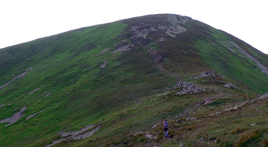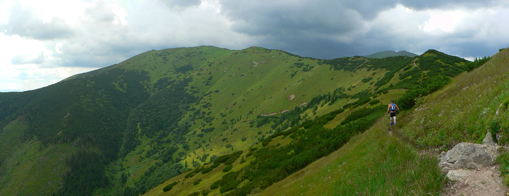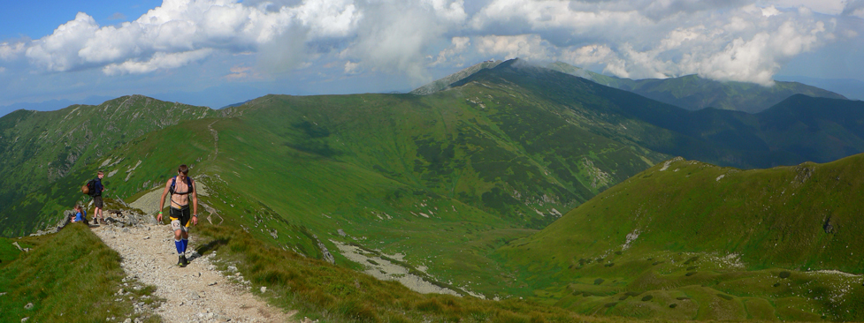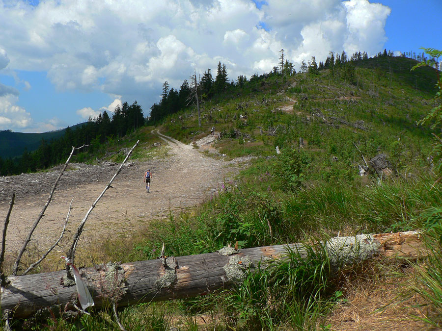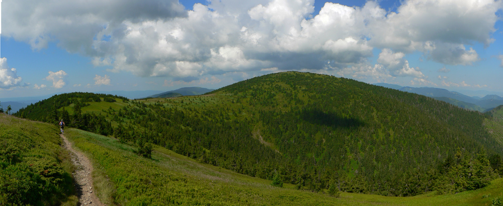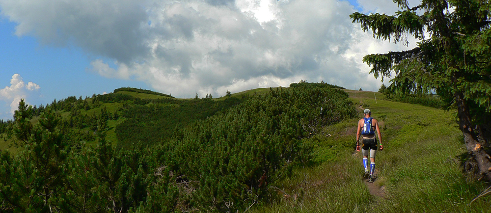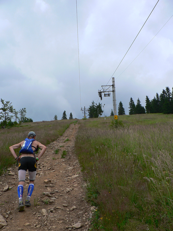 A to počasie? Ráno krásne, teplota príjemná, ale bolo cítiť začínajúce dusno a oblaky aj obavy rástli. Okolo obeda už bolo vidieť sivé steny lejakov nad Liptovom aj Horehroním. Hrebeň to ako zázrakom obchádzalo, ale nakoniec to popoludní schytala naplno Čertovica a okolie. Kvôli tomu tam dosť dvojíc z druhej polovice pelotónu premoklo do nitky a radšej nevyužili možnosť zapretekať si až po Trangošku (tam vraj nakoniec dorazilo 16 dvojíc). Pred druhou sme to ešte niektorí schytali pod Králičkou, ale to bola len super sprcha na umytie zasolených hláv a tým to skončilo. V diaľke ešte zo dva razy zahrmelo a už bolo len lepšie, až do konca: väčšinou príjemne pod mrakom, luxus v porovnaní s vlhkými trópami v prvej časti. Hrozne som rád, že tentokrát strašidelná predpoveď nevyšla, tragédia počas lanskej MF100 hovorí za všetko...