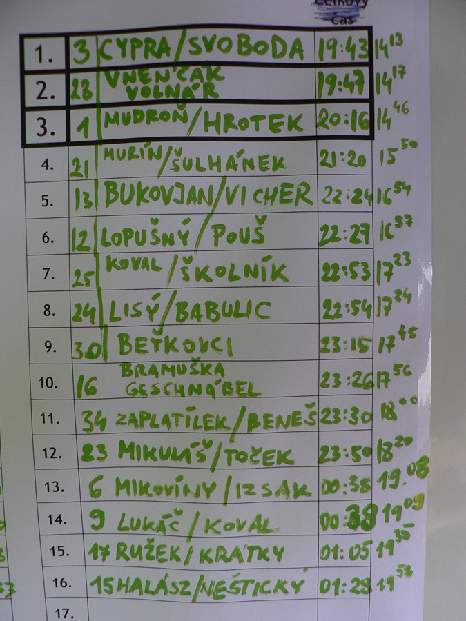 Prví boli na Holi pred siedmou a už sa šprintovalo po hrebeni. Doslova, lebo z roka na rok sa výkony zrýchľujú a vyrovnávajú. Podrobné online spravodajstvo aj s časmi na kontrolách je TU , takže zbytočne by som to ešte rozpisoval. Len spomeniem, že v oboch kategóriách sa od začiatku odohrával brato- a sestrovražedný česko-slovenský súboj, skončilo to ako väčšinou v hokeji :-) U chlapov do toho síce chcela prehovoriť aj jediná poľská dvojica, kvôli zraneniu však v Hiadeľskom sedle musela skončiť. Odviezla ich odtiaľ HZS. Prvým chlapom (Zbyněk Cypra - Tomáš Svoboda) síce traťový rekord odolal, zato v mixoch Kristýna Skalická a Filip Šilar zlepšili doterajší čas približne o hodinu, a to napriek dlhšej trase. Rešpekt!. Po výkone „v tréninkovém tempu, v pohodě“, podľa ich vlastných slov spod Lajštrocha :-) Recept? Napríklad palice do rúk a hore kopcom uviazať partnerku na špagát :-) Čomu sa ale divili aj samotní organizátori, že posledná dvojica (Laura Bergerová - Tomáš Zágoršek) sa dorútila s úsmevom o druhej v noci, ďalekooo pred limitom. Mohlo sa ísť spať, nevídali!