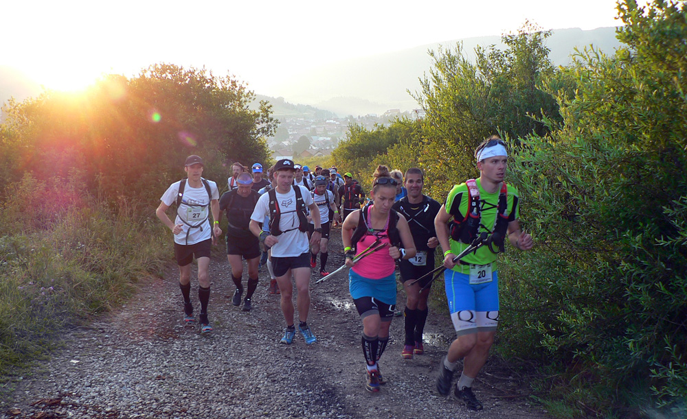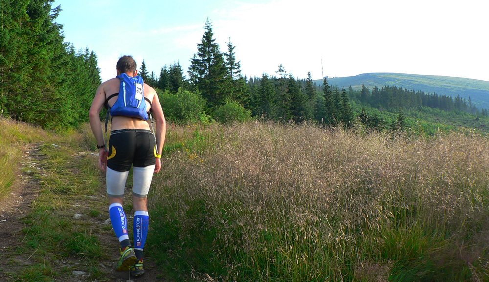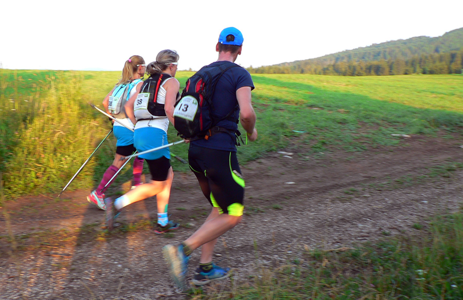 Pod Latiborskou Hoľou máme krásny západ slnka, pod Košariskom už čelovky na hlavách. A v bruchu poslednú poistku – čarovné chemické lektvary, ktoré nás majú preniesť cez posledné prekážky: Prašivú a Kozí chrbát. S čelovkami máme lepší prehľad o súperoch – doháňateľoch. Doháňajú nás pravidelne a neúprosne, len aby to aspoň boli chlapi a nie tie dve superbaby, čo to idú vyhrať :-)