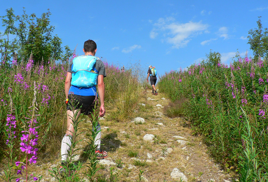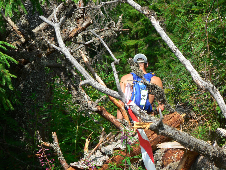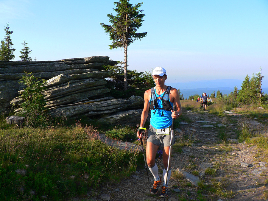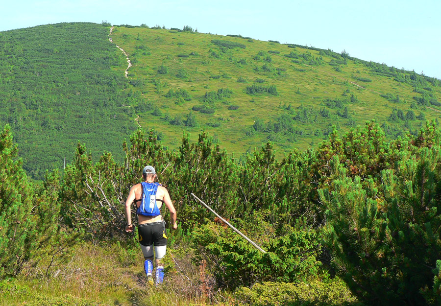 Ťažko sa po troch hodinách pri krmelcoch stúpa na Lajštroch... Ale čím sme vyššie, tým je nebo čistejšie a teplo menšie, tak ako pokropení živou vodou (z posledných zablúdených mráčkov, aj dúha bola) letíme zo Štefáničky po kameňoch v ústrety zázračnému „kamennému čaju“ pod Chopok. Predbiehame všetkých, čo si dovolili predbehnúť nás. Víta nás pokrik „Kde sa toľko flákate?“, tak sa nezdržujeme a letíme ďalej. Predbiehame ďalej, ale predčasná radosť! Stíhačka naráža do steny zvanej Kotliská, mení sa na dýchavičný dvojplošník a predbiehanie prebieha zas, len v opačnom garde a tentokrát definitívne. Chabenec to isté, odtiaľ našťastie z kopca a dlhóóó... Z kopca som ešte aký – taký frajer, do kopca mŕtvola. Môžem len rozmýšľať, či sú za tým stafylokoky, MF100 alebo tá dopoludňajšia sauna... Asi zo všetkého trochu, tak neriešim, plazím sa čo to dá. Tempo sa mení na pozvoľne spomaľujúce, krízy (stále dlhšie) sa striedajú s nekrízami. Matúš, musíš strpieť moje zmeny tempa, lepšie to už nebude, soráč!