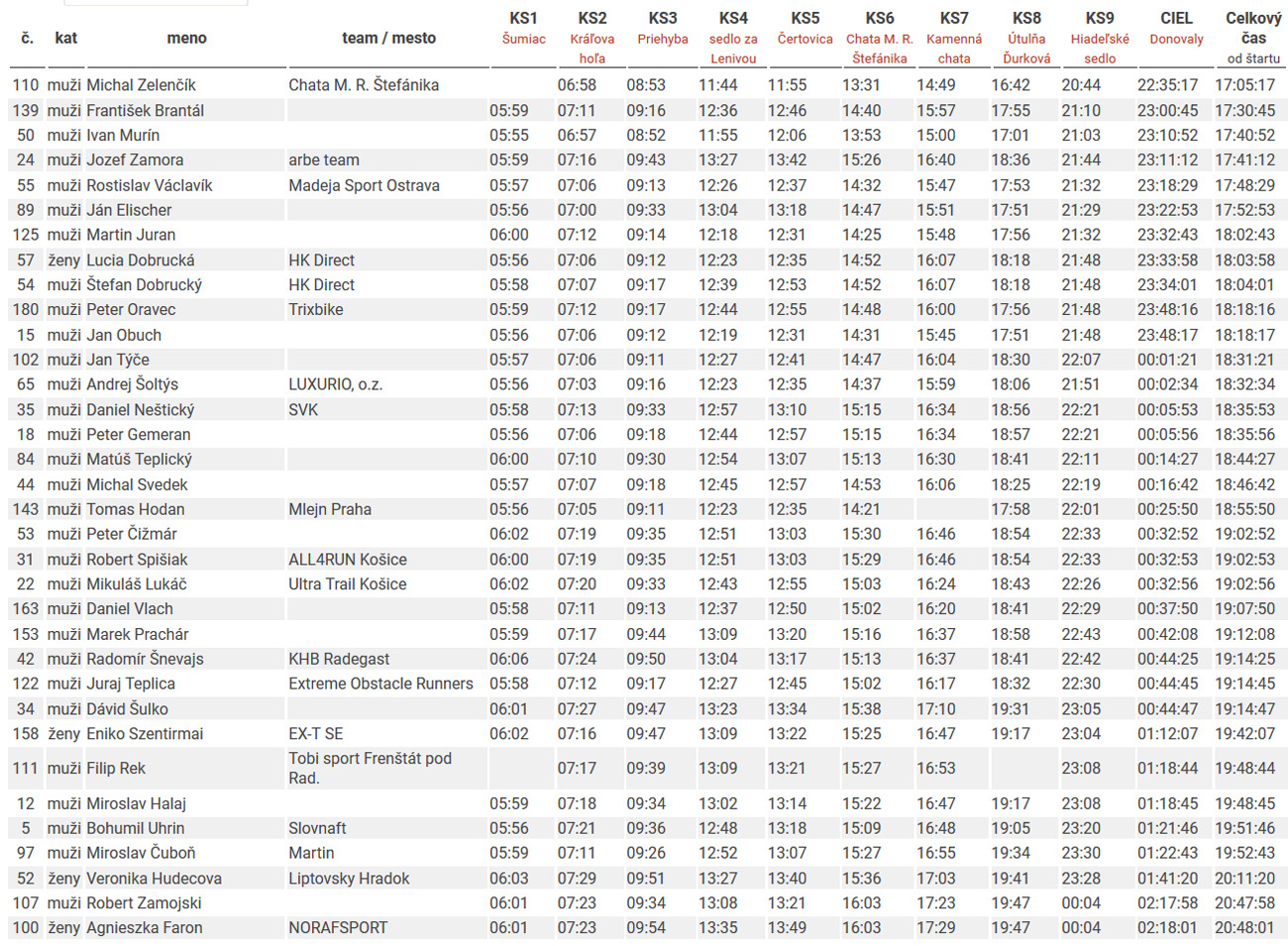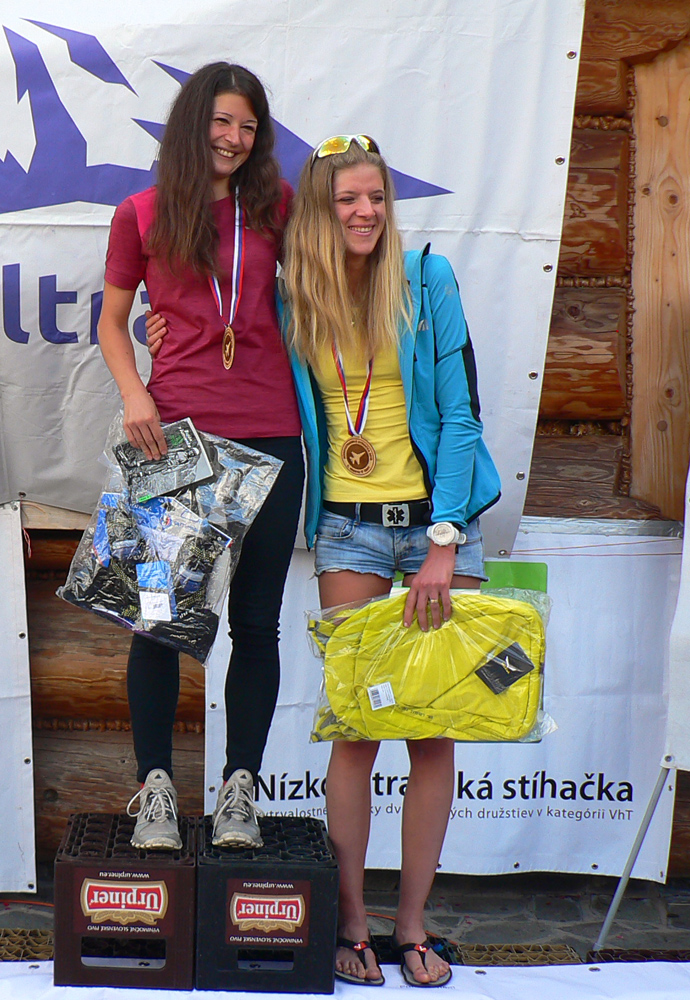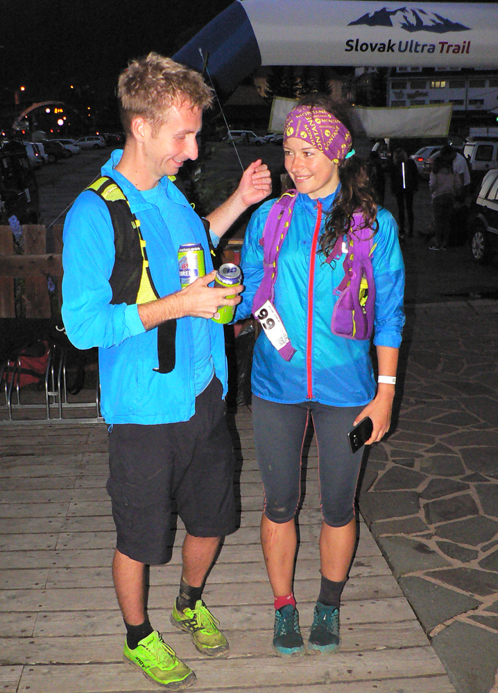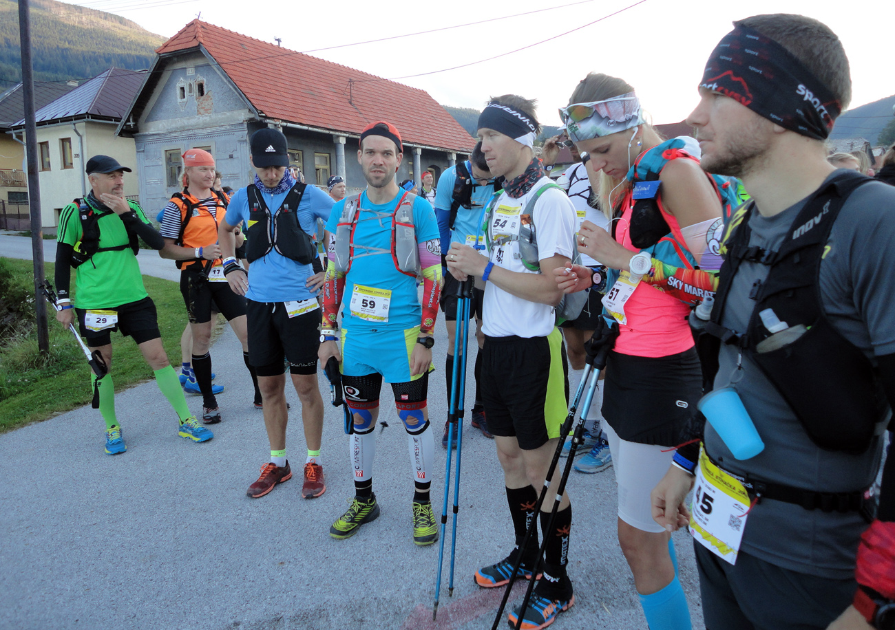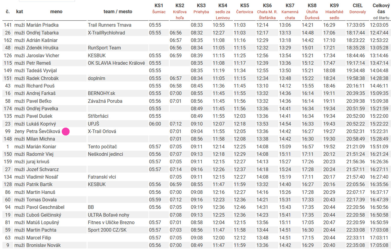 Nakoniec sa na Donovaly dovalilo 89 pacientov zo stovky, ktorá odišla z Čertovice. Jednu pretekárku vzali do nemocnice s rozbitým kolenom a pár ľudí to radšej zabalilo, keď videli čo sa popoludní od severu na nich valí. Vpredu ale padali okrem dažďových kvapiek aj kozmické časy: najrýchlejší Marian Priadka (12:03) vylepšil rekord dua Ivo Mudroň – Paťo Hrotek z roku 2013 (13:37) o hodinu a pol – a to sa vtedy po štarte ešte nešlo okľukou cez Šumiac! Čo viac, tento čas prekonali aj ďalší štyria. Medzi devami Petra Ševčíková (15:22) tiež poriadne podbehla čas 16:05 Kristýny Skalickej a Filipa Šilara z roku 2014. Druhá Lucia Dobrucká (18:04) je ozajstná hrdinka, že vôbec došla – lebo sa predtým „otrávila“ jedlom v telgártskej pizzerke. Inak nebola jediná a nebolo to prvý raz, tak ľudia, nabudúce v tom podniku pozor! Tretia dobehla Eniko Szentirmai (19:42). Tá ani na fotke nie je, lebo musela utekať preč – nie náhodou peši nazad na Telgárt pre auto? Niektorí ultras sú nevyspytateľní :-)))