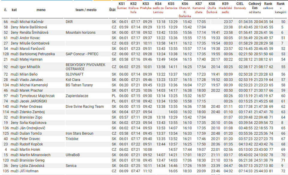 Na čele sa od začiatku usadil Tadeáš Vyvíjal (12:25) a stíhaciu letku Piotr Choroś (12:35) – Matej Oravec (12:41) si držal na dištanc. Druhý doletel Piotr, ktorý Mateja predbehol až za Ďurkovou. Potom už bola poriadna diera asi hodinu a pol, kým si to o „zemiakovú“ rozdali v šprinte Petr Vabroušek s Mikim Kérim. Dobrý záver po sto kilákoch...