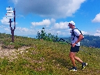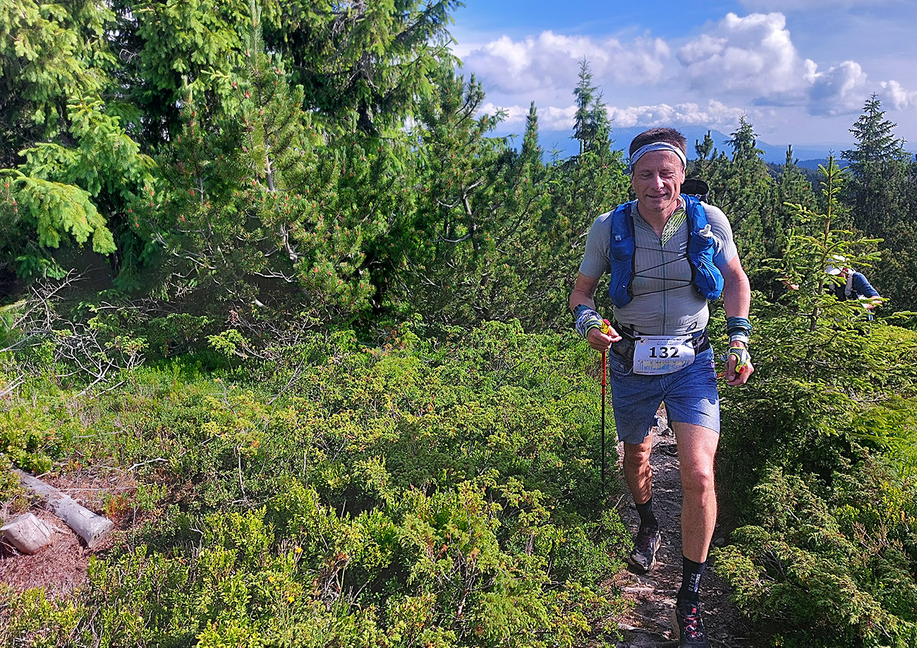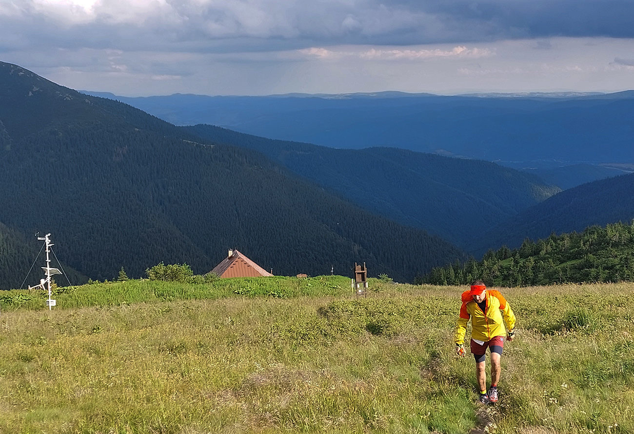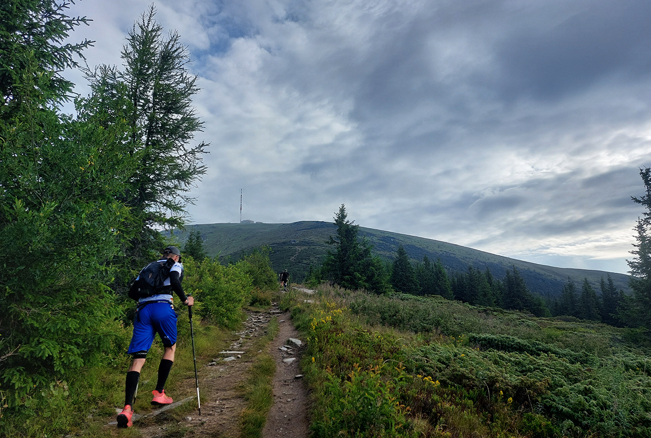 Medzi Priehybou a Ramžou ma obehlo asi 200 ľudí. Nevadí, že toľko ani nevyštartovalo. Boli medzi nimi aj invalidní dôchodcovia a miestne slimáky. Aj slimák je len človek, ponáhľa sa občas. Nevadí, bude viac fotiek. Zato húštiny z roka na rok exkluzívnejšie, vyššie, hustejšie a pod nohy vidno stále menej. Výnimkou je tu len krátky, otvorený úsek cez Zadnú hoľu, potom ponor nazad do zeleného pekla po zostupe spod Homôľky. Odtiaľ aj jediné poriadne výhľady – vpredu na krásne nasvietený Ďumbier a vľavo na dažďové záclony nad Poľanou a Veprami. Odtiaľ aj pár dofúknutých kvapiek doletelo. Novinkou v zbierke obľúbených gymnastických atrakcií pred Ramžou bol „tester štíhlosti“. Hneď som si na niektorých spomenul, že sa ich v cieli opýtam, ako tade prešli. Ak prejdú...