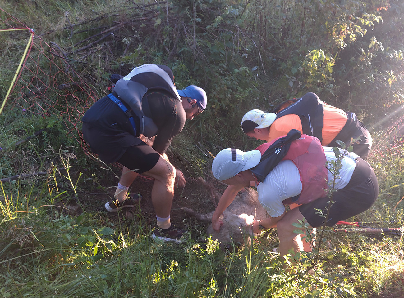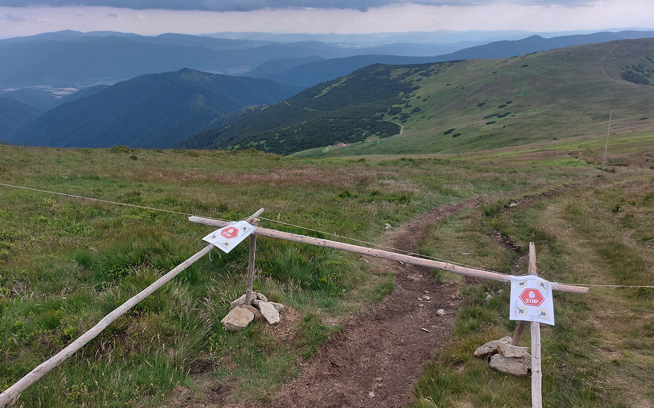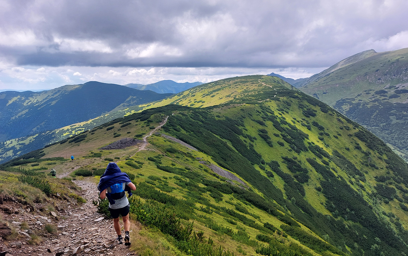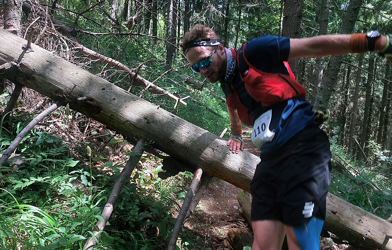 Medzi Priehybou a Ramžou ma obehlo asi 200 ľudí. Nevadí, že toľko ani nevyštartovalo. Boli medzi nimi aj invalidní dôchodcovia a miestne slimáky. Aj slimák je len človek, ponáhľa sa občas. Nevadí, bude viac fotiek. Zato húštiny z roka na rok exkluzívnejšie, vyššie, hustejšie a pod nohy vidno stále menej. Výnimkou je tu len krátky, otvorený úsek cez Zadnú hoľu, potom ponor nazad do zeleného pekla po zostupe spod Homôľky. Odtiaľ aj jediné poriadne výhľady – vpredu na krásne nasvietený Ďumbier a vľavo na dažďové záclony nad Poľanou a Veprami. Odtiaľ aj pár dofúknutých kvapiek doletelo. Novinkou v zbierke obľúbených gymnastických atrakcií pred Ramžou bol „tester štíhlosti“. Hneď som si na niektorých spomenul, že sa ich v cieli opýtam, ako tade prešli. Ak prejdú...