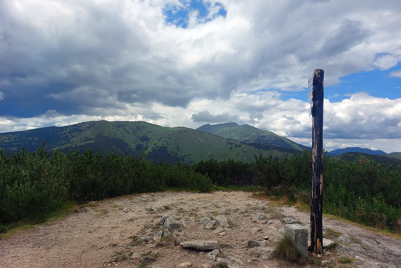 Nové boty sú o hodne vyššie ako staré, tak som začal zakopávať, aj jednu ukážkovú rybu som hodil, s volejbalovým sklzom. Našťastie do mäkkého, zeleného, čvachtavého, niekde pod Orlovou. Trocha krvi, trocha kriku, ani ma to nebolelo... Hlavne ale s klesajúcou výškou mizli aj mraky a vyzeralo to na pekný deň. Nad hlavami zatiaľ iba barančeky, v diaľke pred nami celý hrebeňový program na nasledujúce hodiny, na pravoboku vysvietené Tatry: