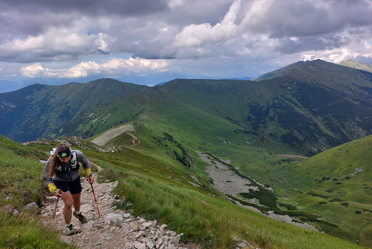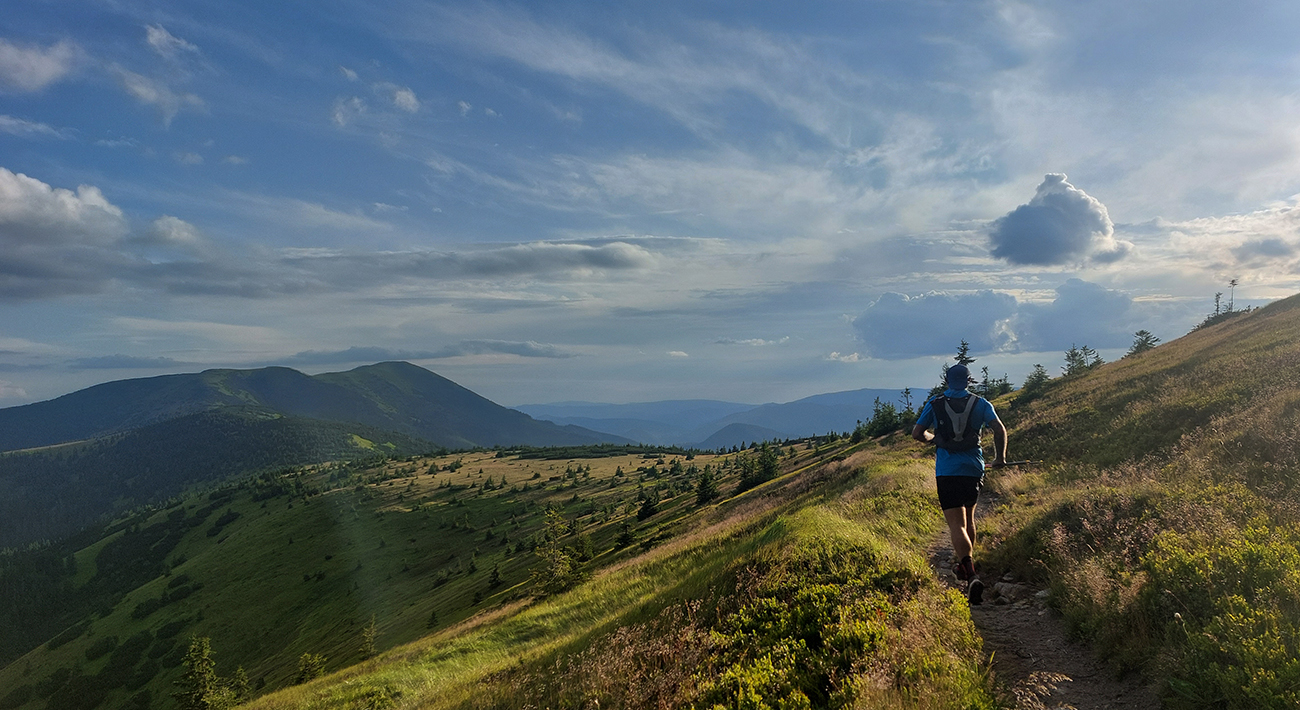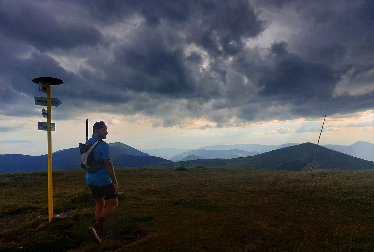 Na Ďurkovej to majú orgovia dobre vymyslené – obojsmerka pre kontrolu odstupov od súperov - ako dole z hrebeňa, tak aj nazad. Ani tam som sa moc nezdržal, lebo pre bulvár nemali nič, žiadne uskladnené polomŕtvoly, a na terase prefukovalo. Tak zas rýchle cukry a veľa, veľa - lebo telo spomaľovalo a čakal ho dlhý úsek do Hiadeľského sedla. Našťastie behavý, vlnkavý, len to by museli nohy fungovať. Ambícia sa scvrkla na snahu prísť bez čelovky aspoň tam. Cestou ale klesajúce slnko začalo pomedzi mraky kadejaké parádne tieňohry vyrábať: