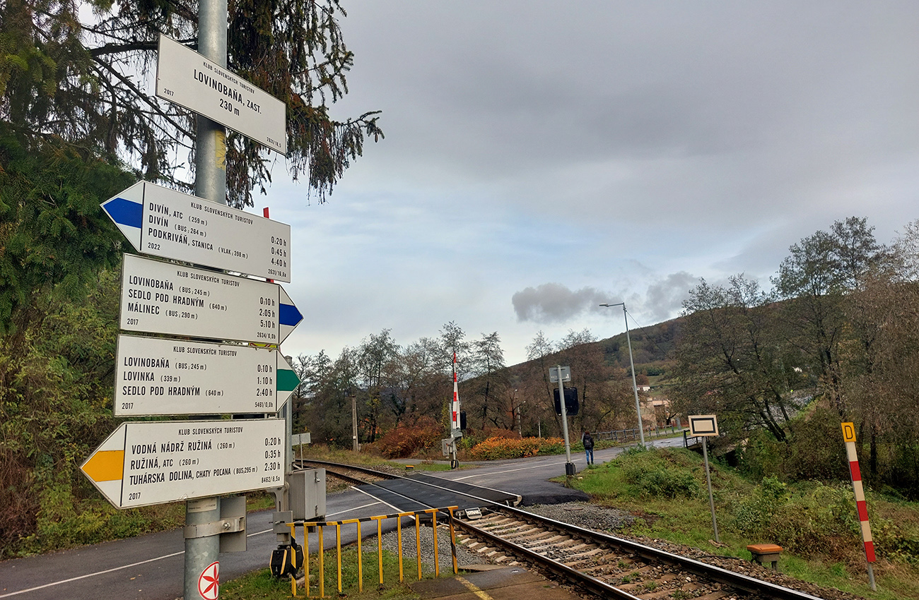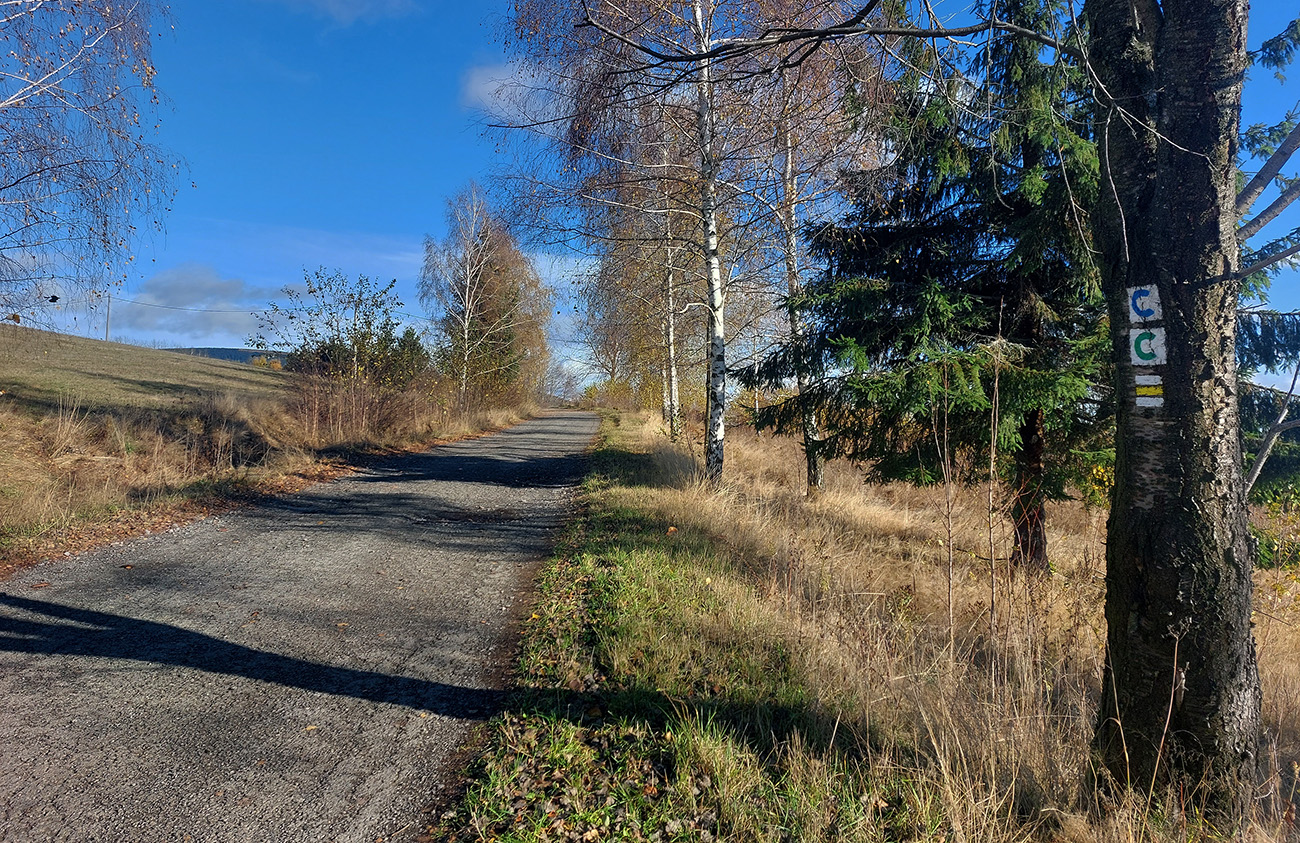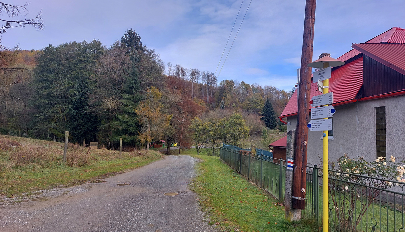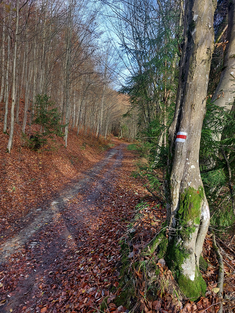 Od vlaku optimisticky popri cintoríne, až na Hrbáky (566 m) klasicky hore lesom (stále pekne farebným), pod nohami dobrá lesná cesta - len málo blata, a ešte aj dobre prikrytého dubovým lístím. Sem – tam kopytník, bedľové súhubia okolo cesty, hore presne podľa názvu trochu hrboľato – v hnedom podklade pekné, machovozelené skalky: