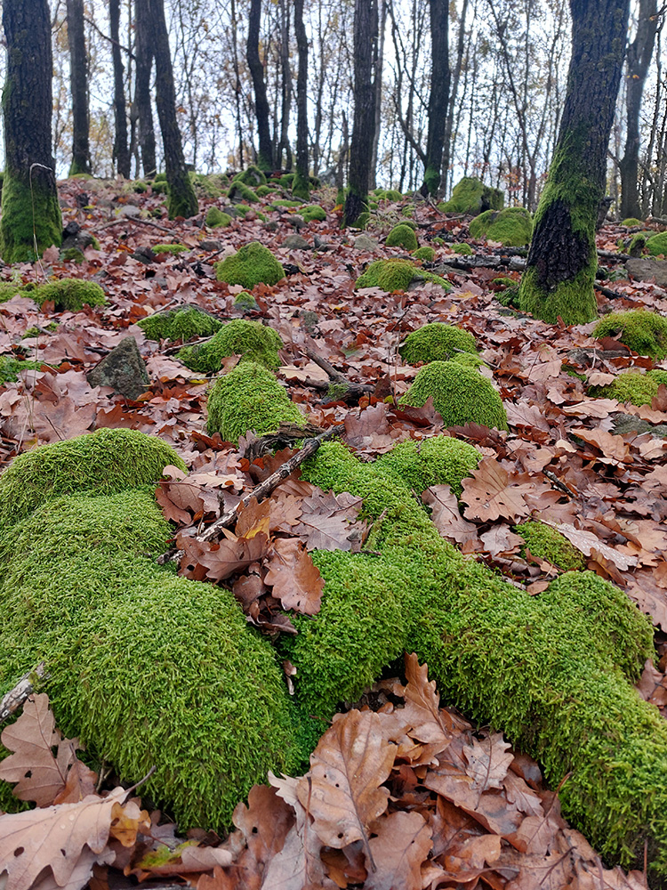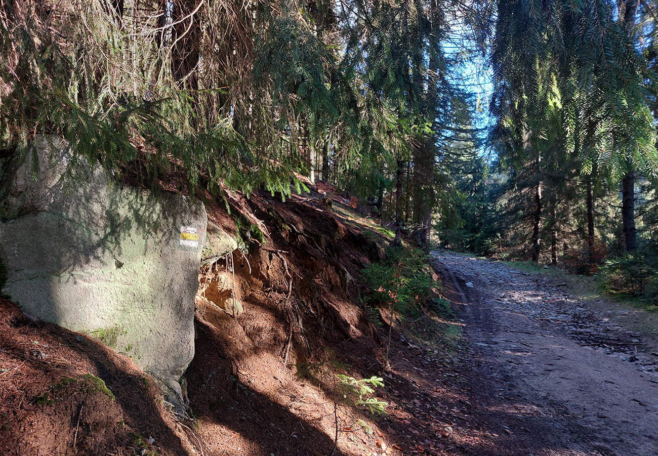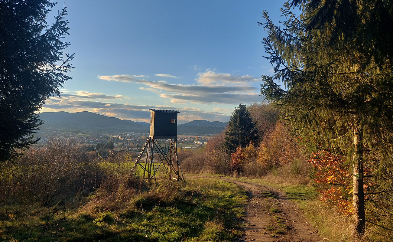 Od vlaku optimisticky popri cintoríne, až na Hrbáky (566 m) klasicky hore lesom (stále pekne farebným), pod nohami dobrá lesná cesta - len málo blata, a ešte aj dobre prikrytého dubovým lístím. Sem – tam kopytník, bedľové súhubia okolo cesty, hore presne podľa názvu trochu hrboľato – v hnedom podklade pekné, machovozelené skalky: