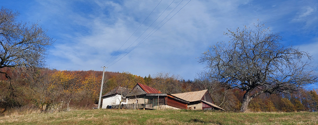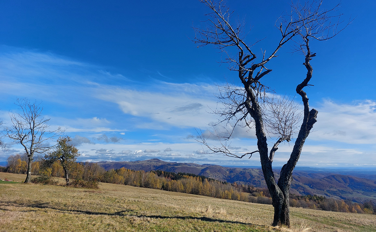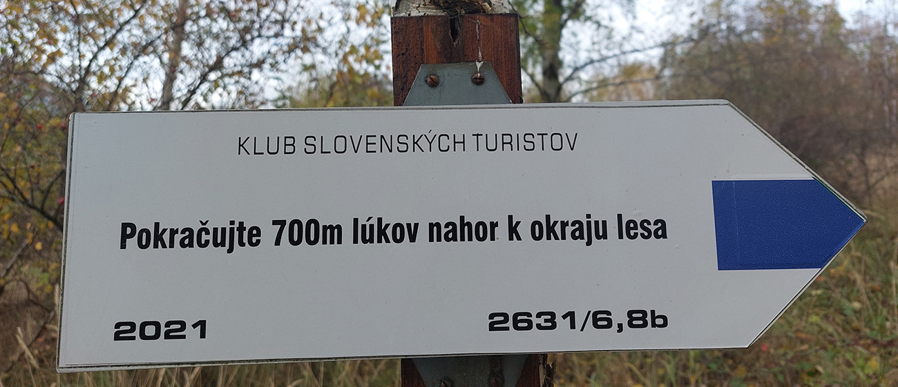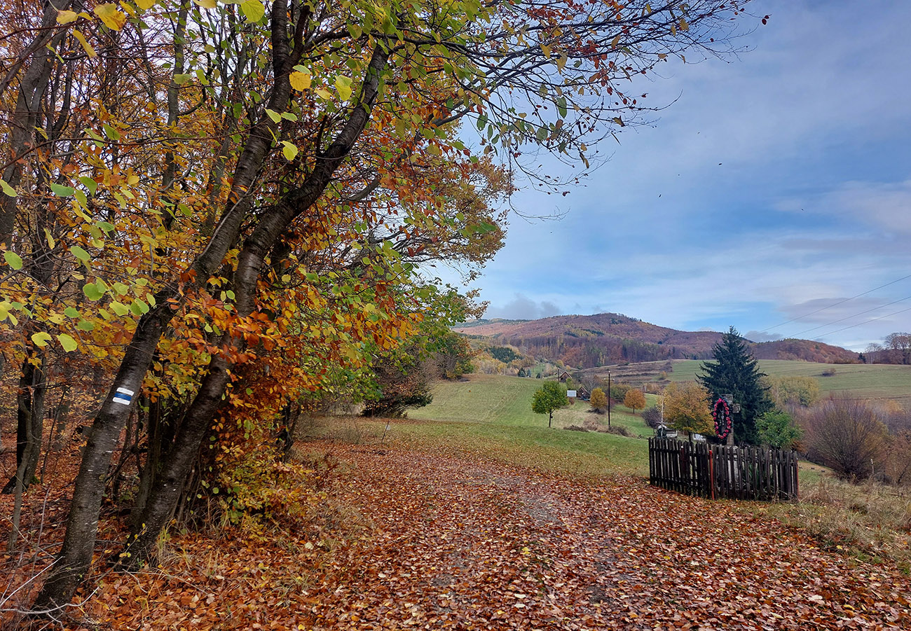 Potom o malú chvíľku to už začalo: vynorenie z lesa na rozľahlé pasienky a panoramatická cesta okolo osady Horné Fafáky. Aj dosť veľký cintorín tam majú, kedysi tam na okolí dosť ľudí muselo bývať (samý Melicherčík). Tých domkov sa aj ďalej od samotnej osady krčí viac. Teraz všetko pozatvárané, ale vidno, že obhospodárené, tráva vypasená „na ježka“ a samé upozornenia na kamerový dozor. A v sade pri osade aj jedlé gaštany. Nové modré značky tam pekne svietia, nedajú blúdiť, len šípku na cestu hore lúkou asi vyrobili v miestnom dialekte :-) Alebo je to len prejav kvality nášho školstva: