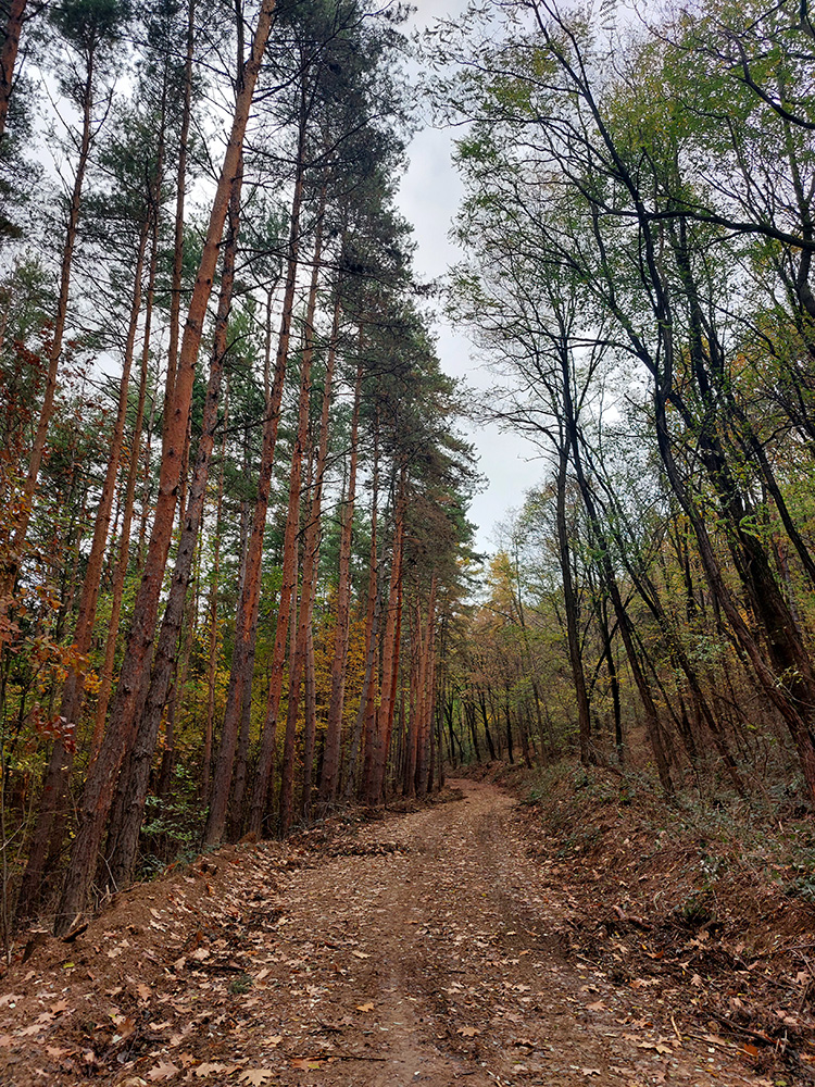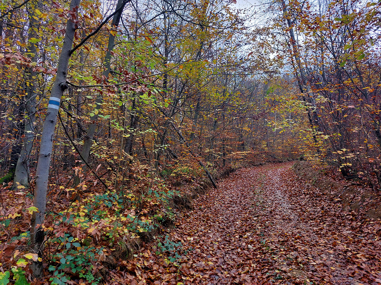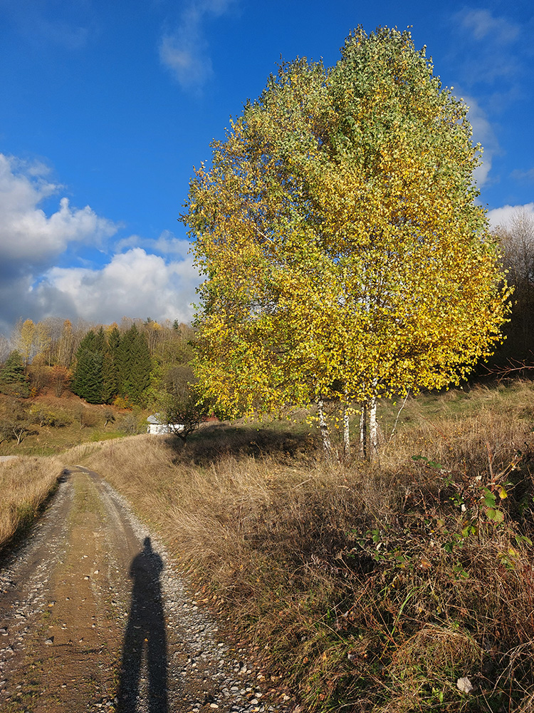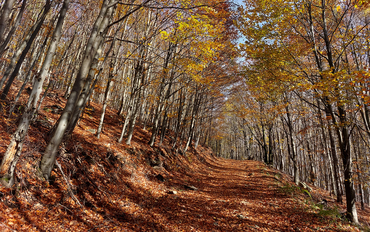 Cesta lesom hore na „náhornú planinu“ Táňovo je poriadne strmá, a na mnohých miestach je dosť voľných kameňov, takže toto bol jediný úsek na trase, kde by bolo treba potlačiť bajk. Lebo inak bola celá táto trasa prudko bajkpozitívna. Že by to bolo v zime aj na bežky, ani nepíšem, lebo čo už z týchto zím? Ale teraz to bolo plnofarebné, parádne. Akurát s rastúcou výškou bolo dubové lístie pod nohami vystriedané javorovým a bukovým.