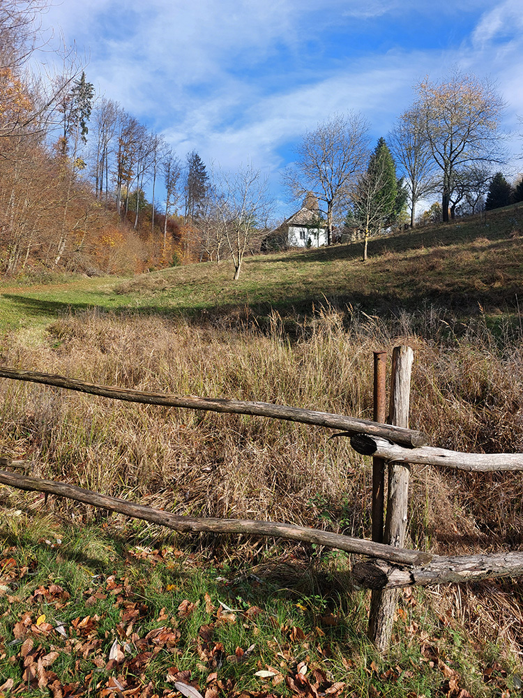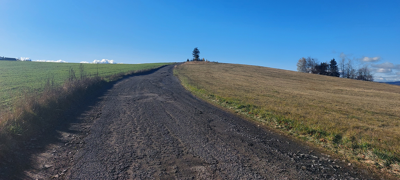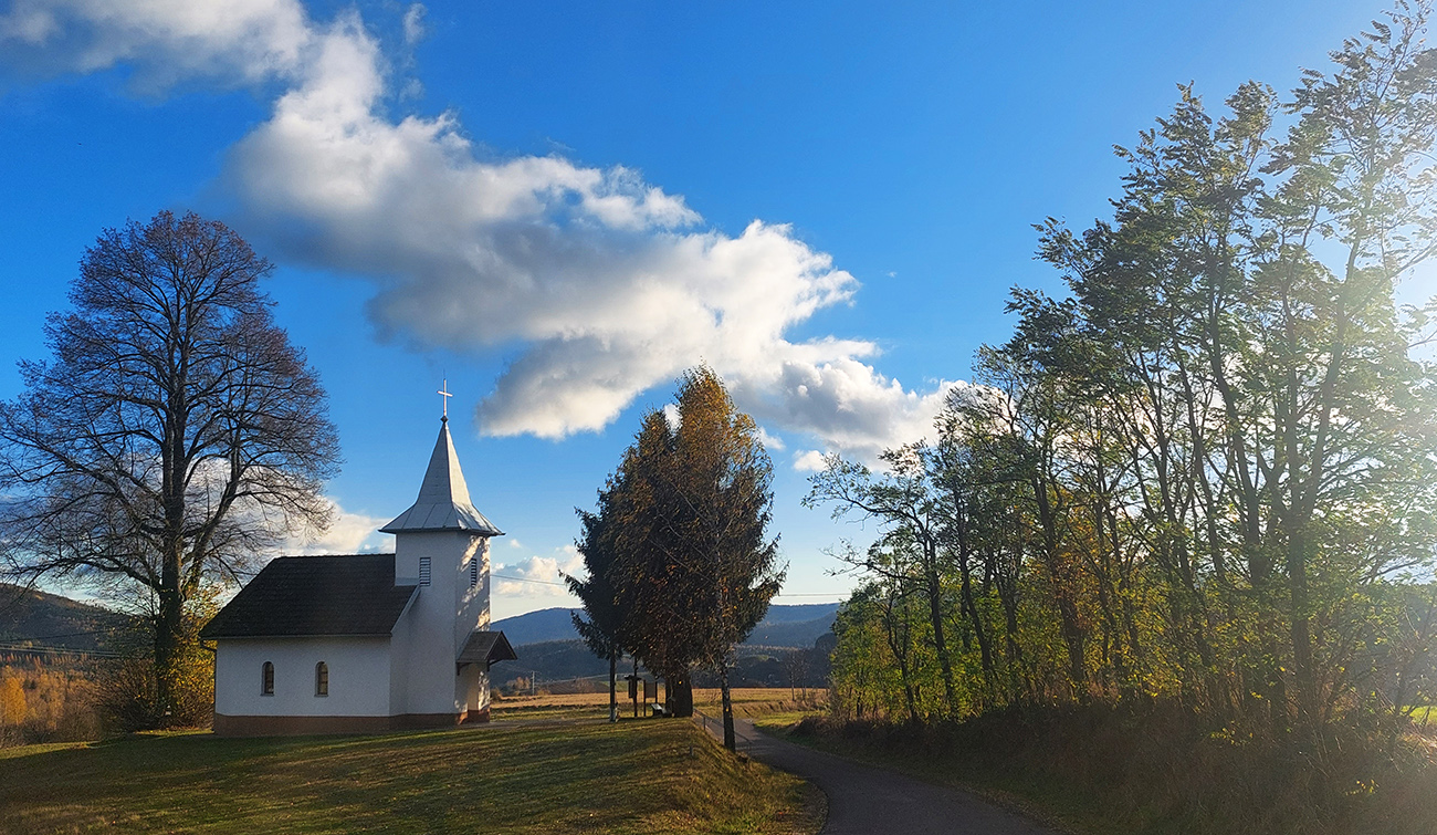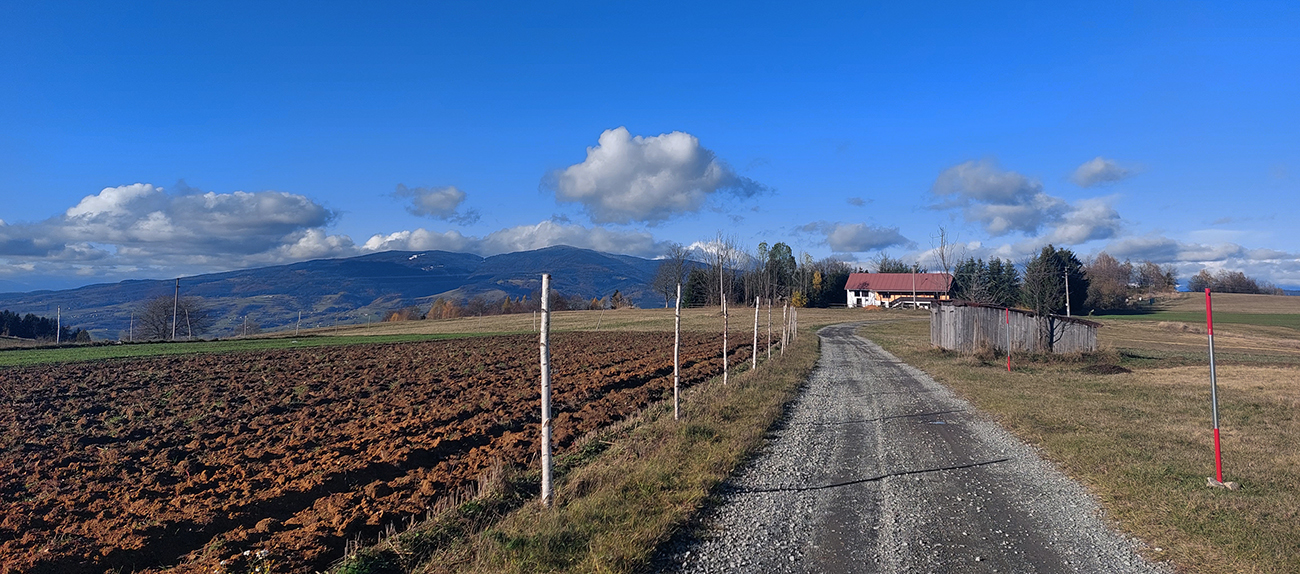 Vleky na Košútke som ani nevidel, značka ich obchádza poza les. To už som bol na zelenej cyklotrase (5664), zase prevažne cez lúky sa kľukatiacej. Chvíľu ešte hore – dole, potom zlom a dlhé, finálne (takmer) klesanie do cieľa. Vpredu Rohy, zavadzajúce vo Zvolenskej kotline, potom kľukatenie pomedzi stále hustejšie porozhadzované domčeky. V Paučíkove keď som sa vynoril na asfalt, myslel som, že definitívne, ale nie. Kostolík na návrší nad cestou o kus nižšie bol pekne nasvietenou dominantou okolia, potom zošup na križovatku Ivanišovo. Tam som si to poobzeral, tam sa chcem na žiletke prebehnúť na jar.