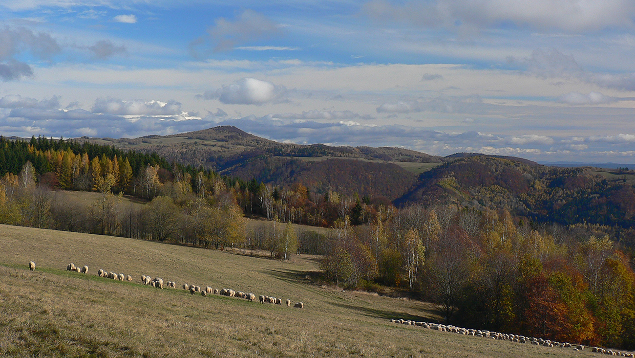 Za horizontom sa mi prvý raz ukázala Poľana, ešte s poriadne huňatou čapicou, ale tá už redla. Pridal som sa zase na kúsku ku trase Hriňovskej stovky a o chvíľu som už hľadal obchádzku hromady napílenej guľatiny a totálne rozbahnenej cesty okolo nej. Ešte že sa dala komfortne obísť po lúke. Ciest tam je dosť, na tej „náhornej planine“. Predtým ale ešte jediný úsek na tomto výlete, kde značka vedie nie po ceste, ale po úzkom a nie veľmi zreteľnom chodníku dole zarastajúcim pasienkom. Krátka, ale príjemná výnimka z pravidla. Vpredu na obzore dominuje bochníku podobné Bykovo (1110 m):