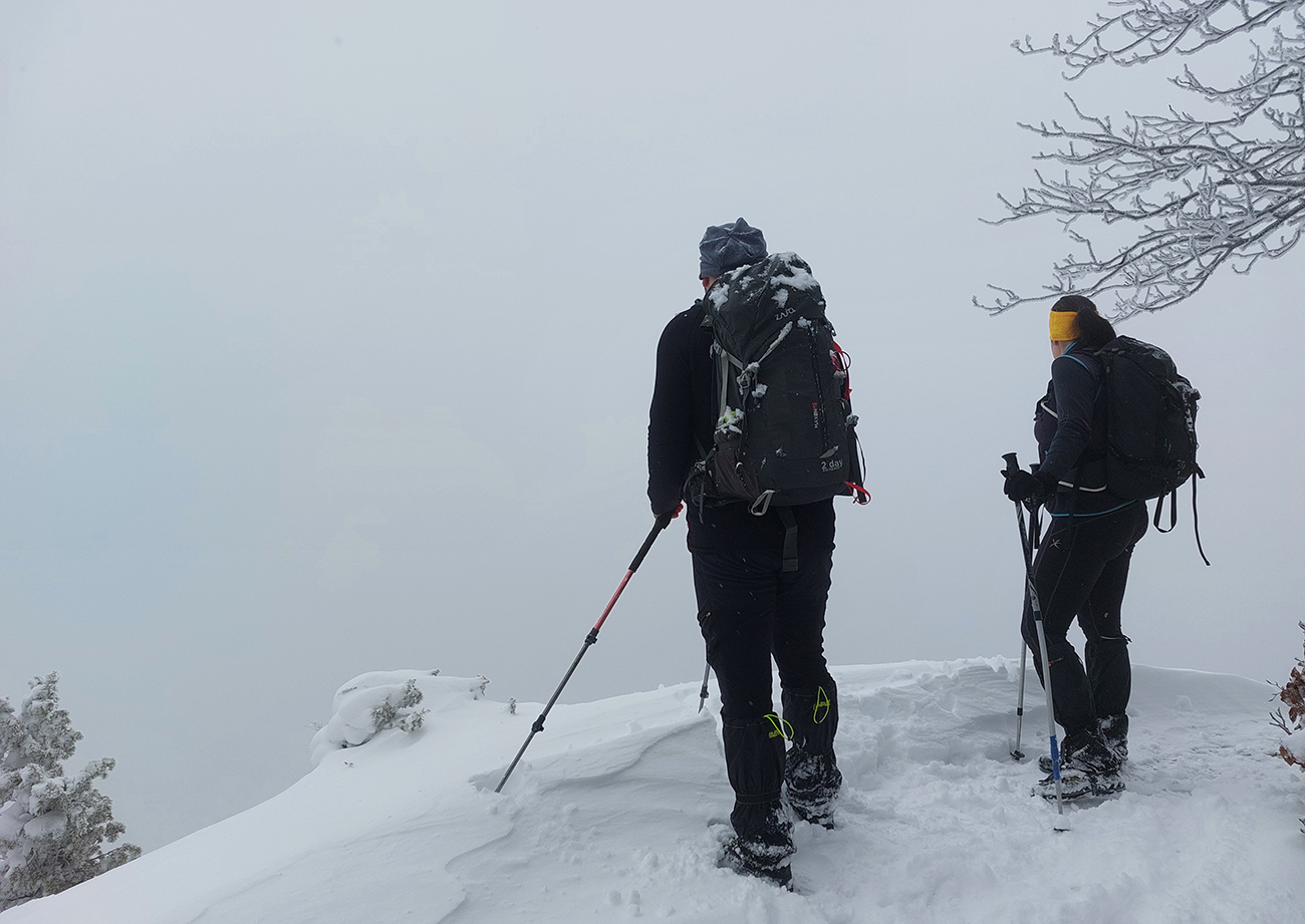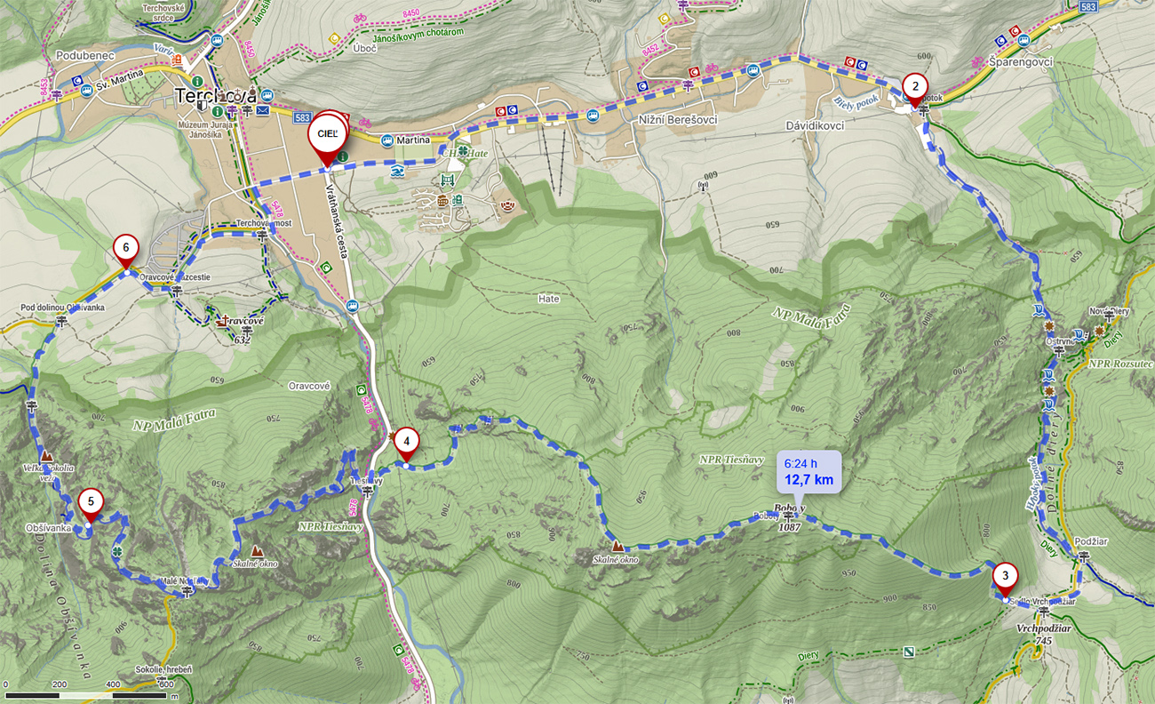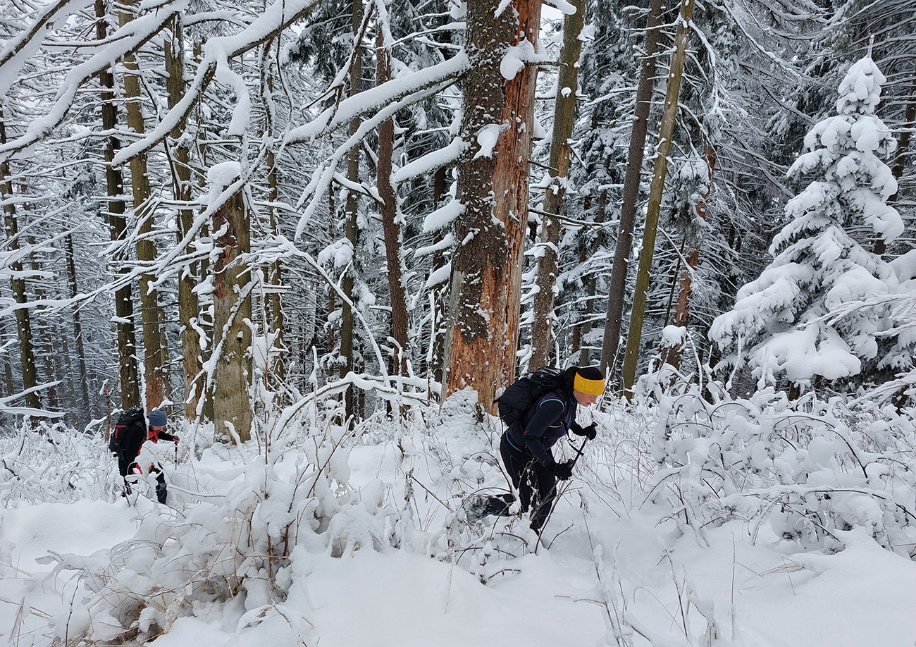 Diery, Boboty, Tiesňavy, Sokolie, Obšívanka – klasické turistické ciele nad Terchovou a pekne v tomto poradí. Atraktívne svojou krásou, všeobecne známe, a preto väčšinou plné turistov. Lenže nastalo novoročné ráno, keď sa všetky penzióny a priváty len veeeľmi pozvoľna prebúdzali zo silvestrovského žúrovania. Navyše teplota jemne pod nulou, na zemi (aj na neodhrnutých chodníkoch samozrejme) tak do 20 cm čerstvého snehu, ktorý navyše dopoludnia stále jemne pribúdal. To bolo treba využiť, lebo skúsenosti hovorili, že bude ľudoprázdno. Takže na nohy hrubé boty, na boty štucne (niektorí) a išlo sa. Necelých 13 km a necelý kilák prevýšenia, ale podceňovať tie technické preliezačky netreba, v strminách je postup vždy pomalý a samozrejme čerstvý sneh ho teraz ešte viac komplikoval. Častokrát sme veľmi nevideli, do čoho stúpame. Ale ideálna voľba do počasia, keď nad lesom fučí severák a nič tam nevidno. Takto teda sme to zokruhovali, podľa Mapy.com: