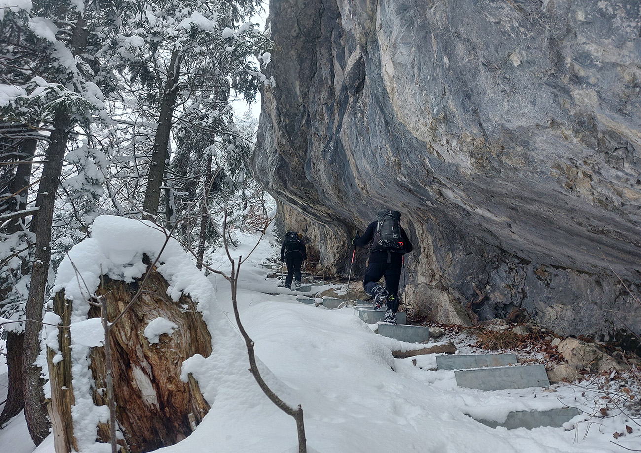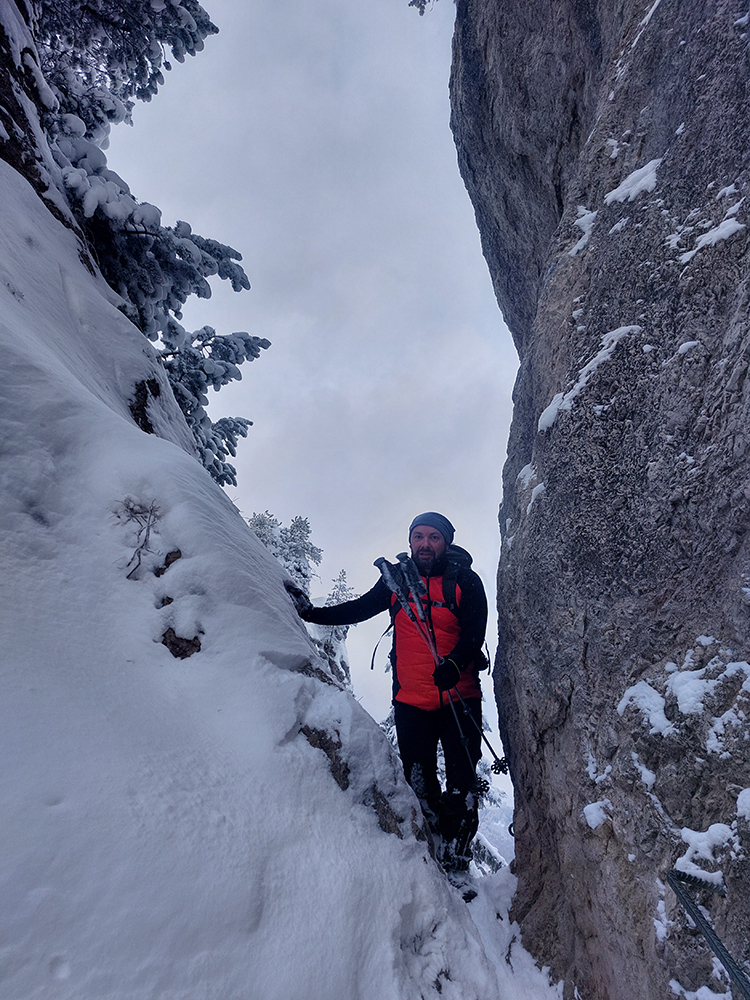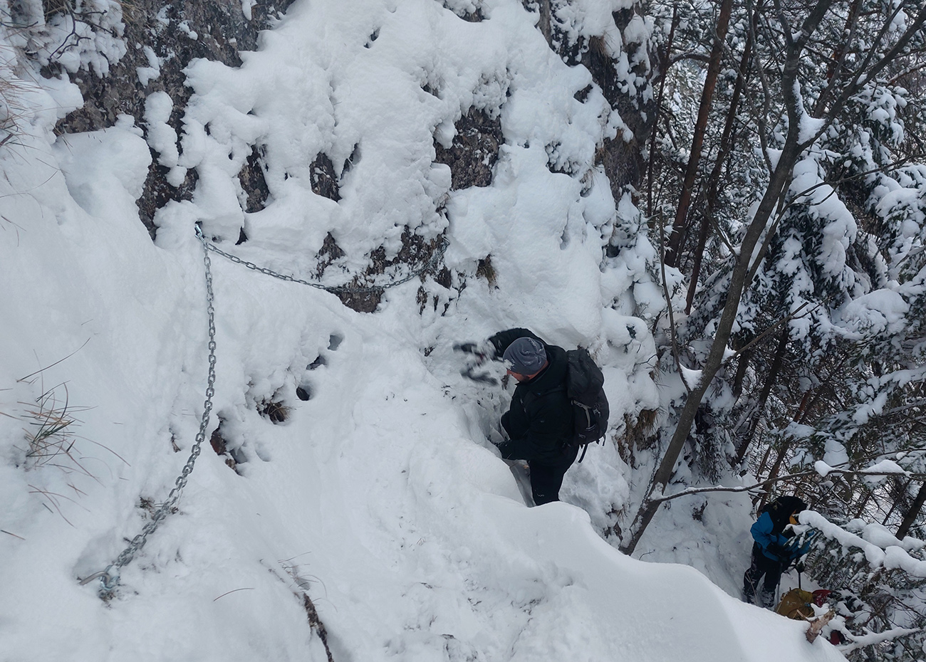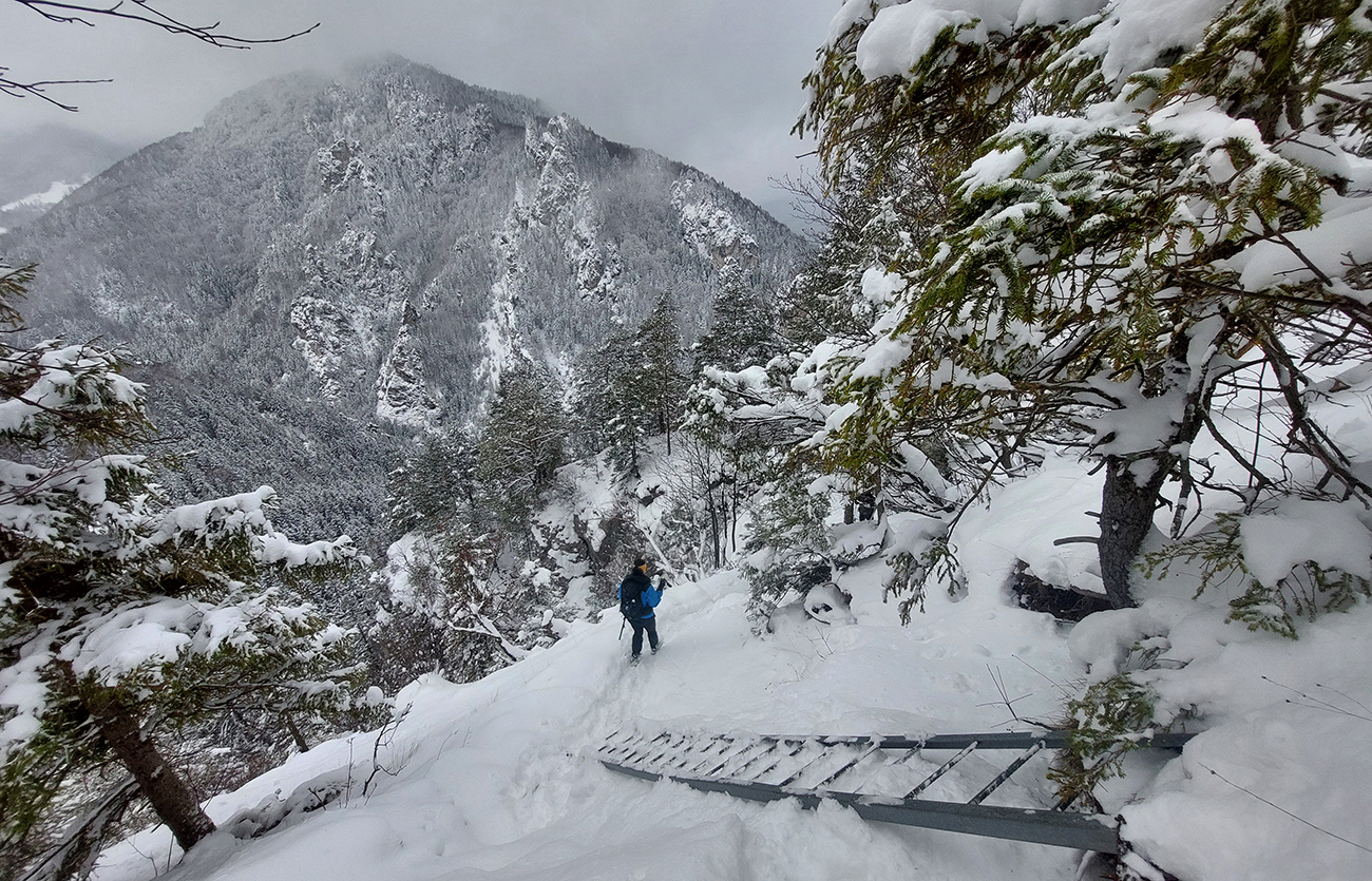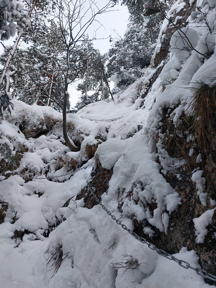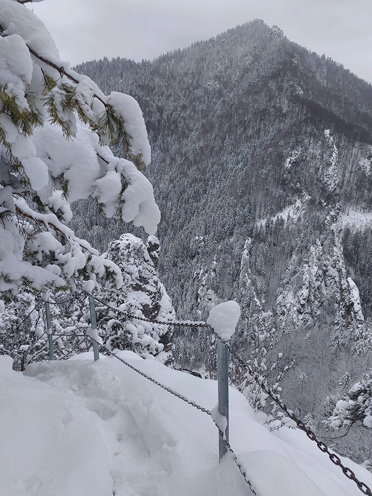 Zostup strmo dole do Tiesňav ešte krajší, ale vďaka tomu čerstvému páperiu bez základu aj šmykľavejší. A často vôbec nevieme, do čoho pod tým snehom stúpame. Retiazky a schodíky ukryté pod perinou moc nepomáhajú, skôr zavadzajú. Ale sivobiela bralnatá krajina naokolo je úchvatná.