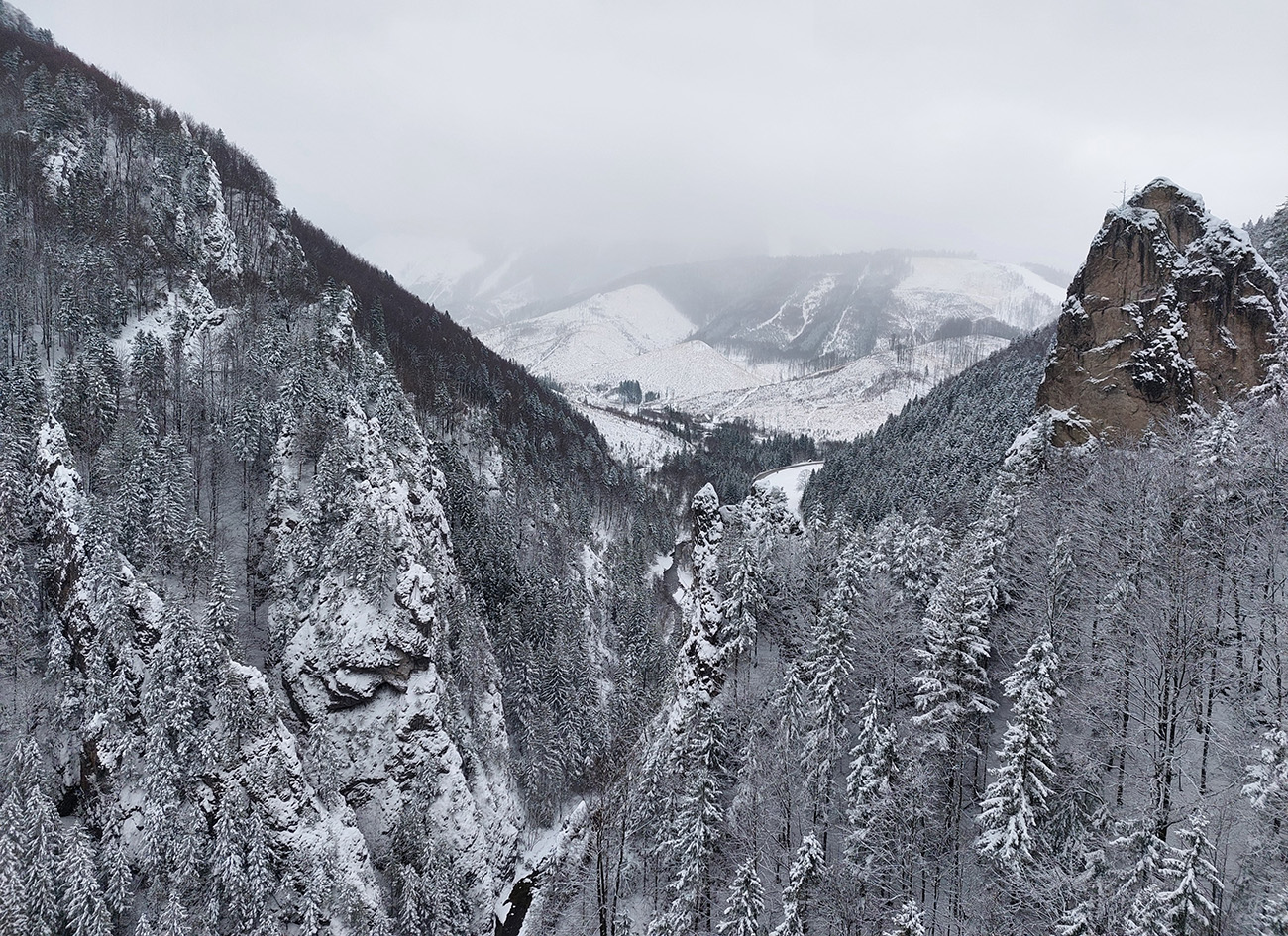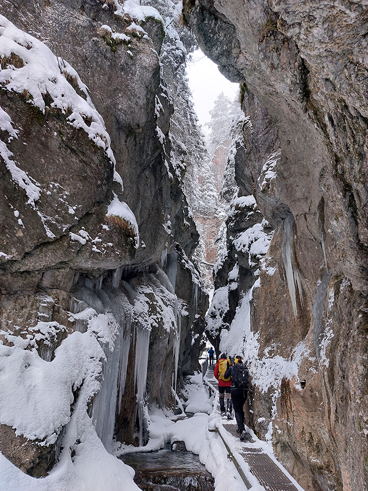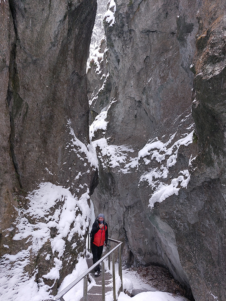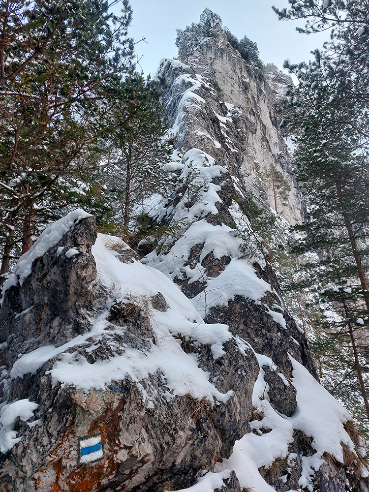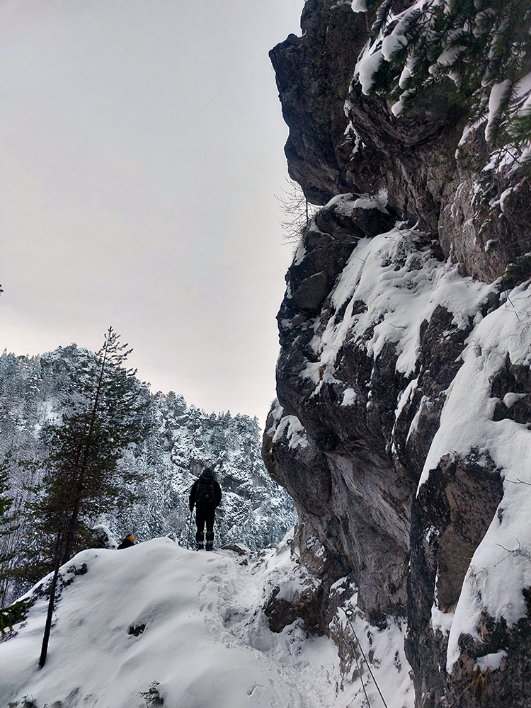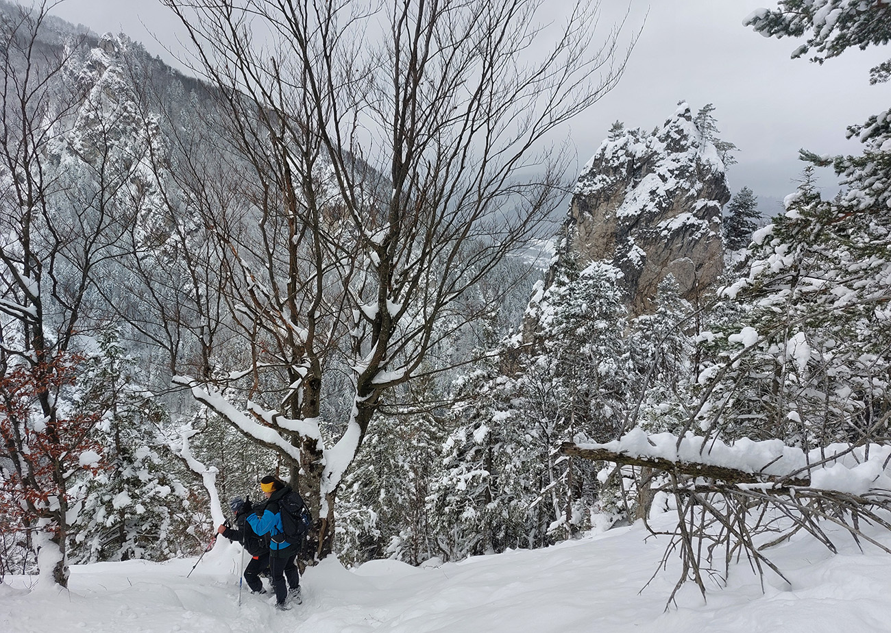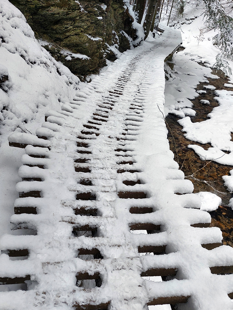 Zostup strmo dole do Tiesňav ešte krajší, ale vďaka tomu čerstvému páperiu bez základu aj šmykľavejší. A často vôbec nevieme, do čoho pod tým snehom stúpame. Retiazky a schodíky ukryté pod perinou moc nepomáhajú, skôr zavadzajú. Ale sivobiela bralnatá krajina naokolo je úchvatná.