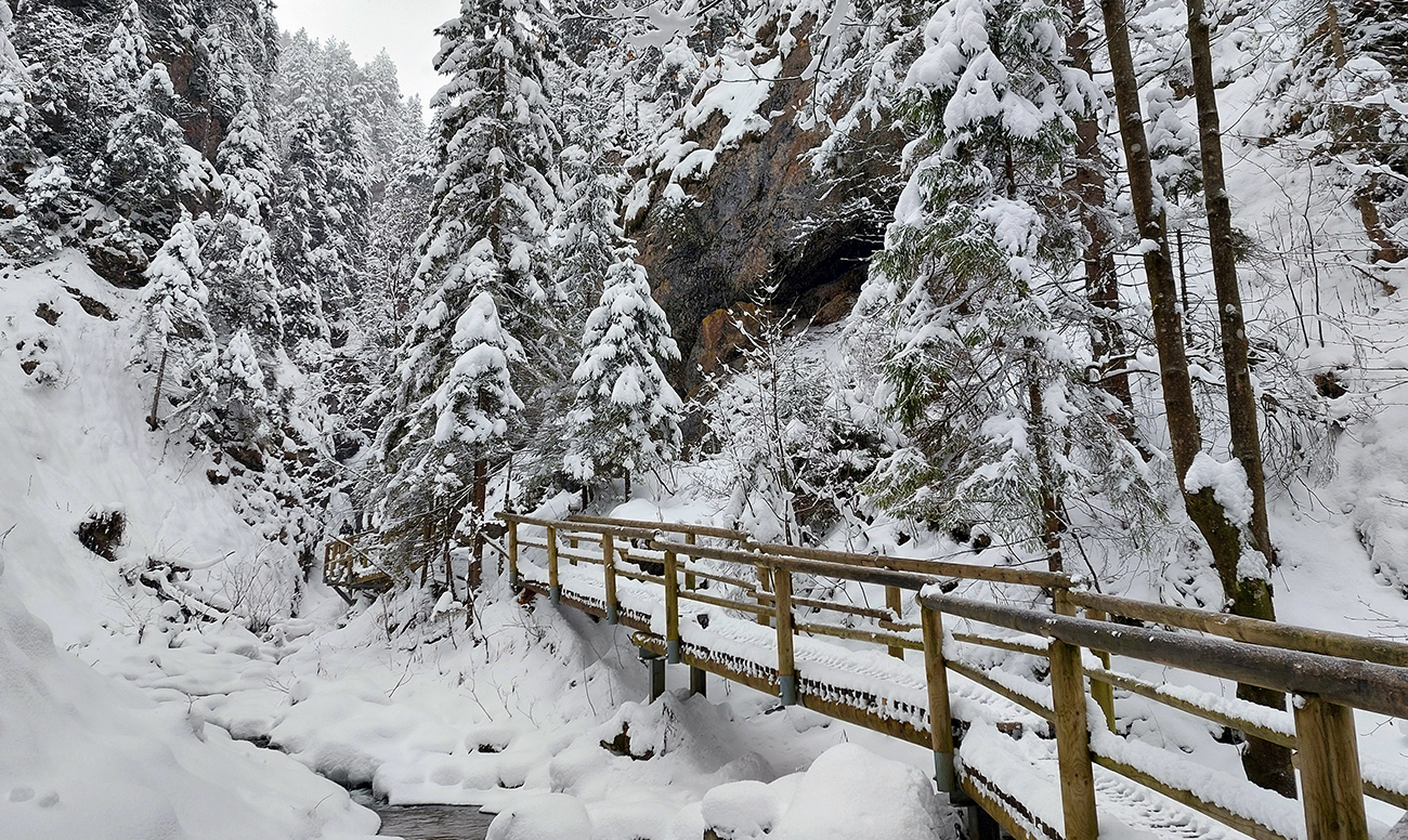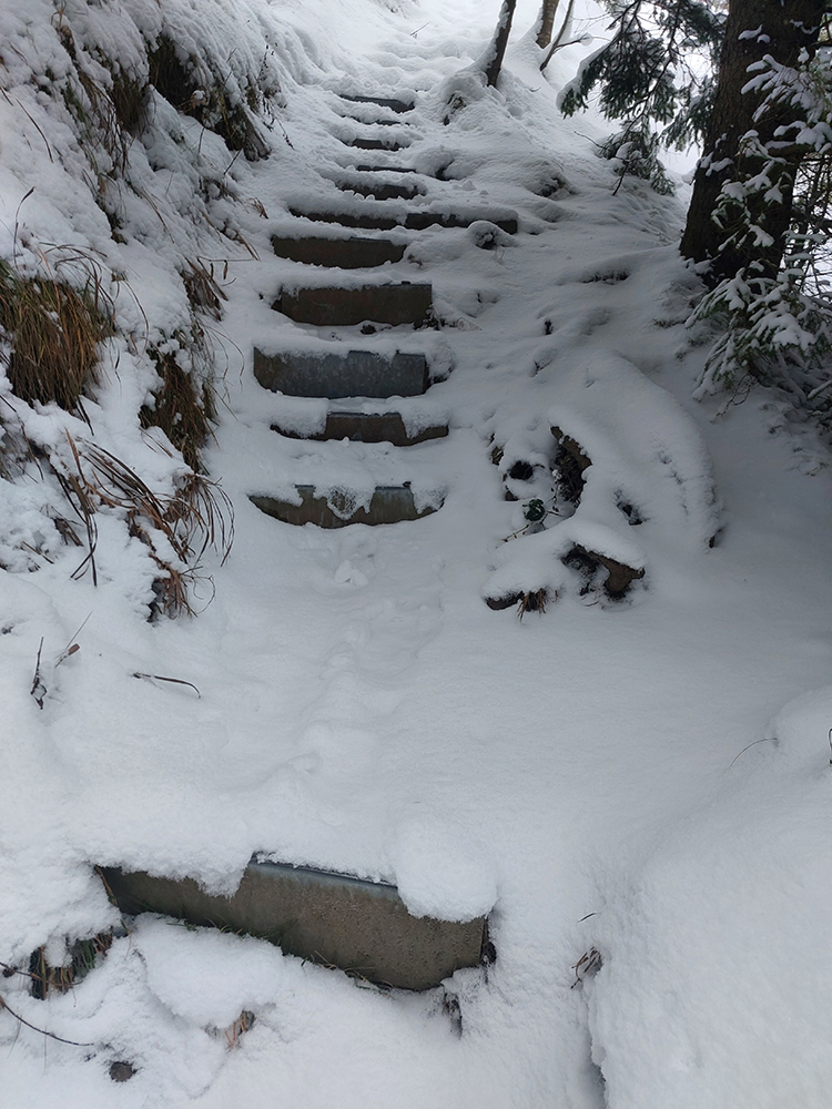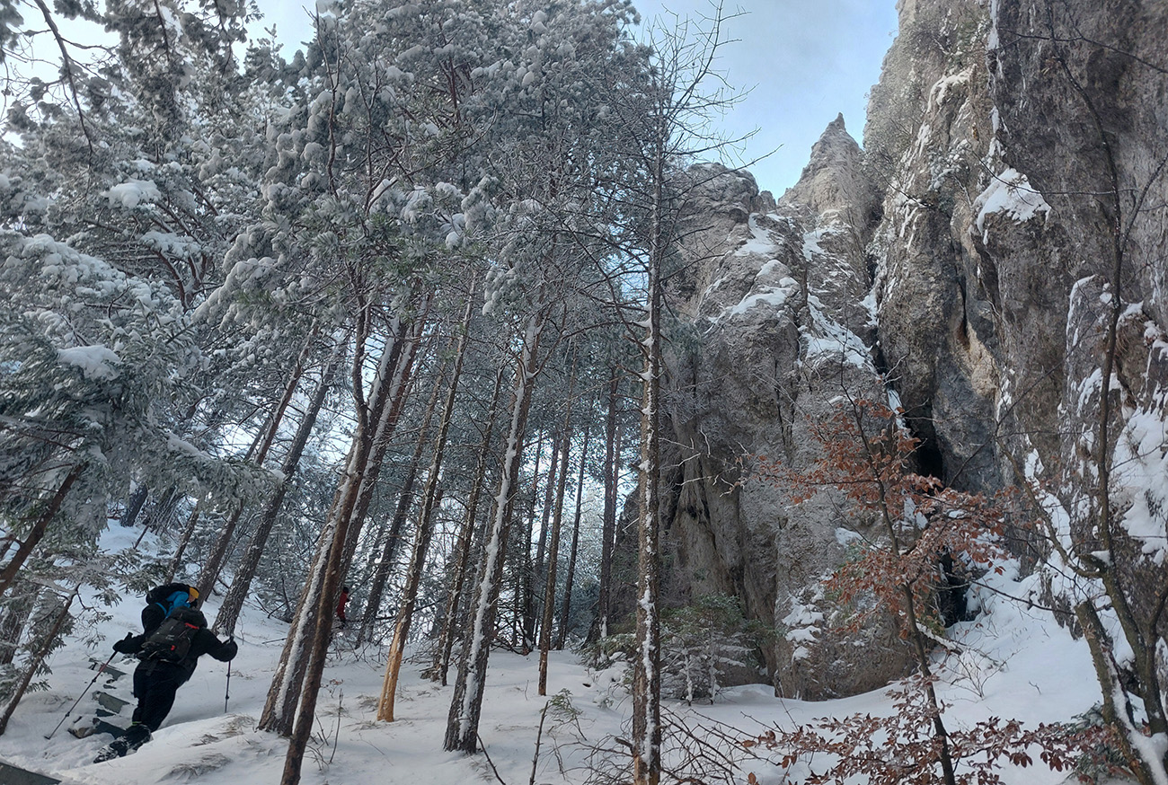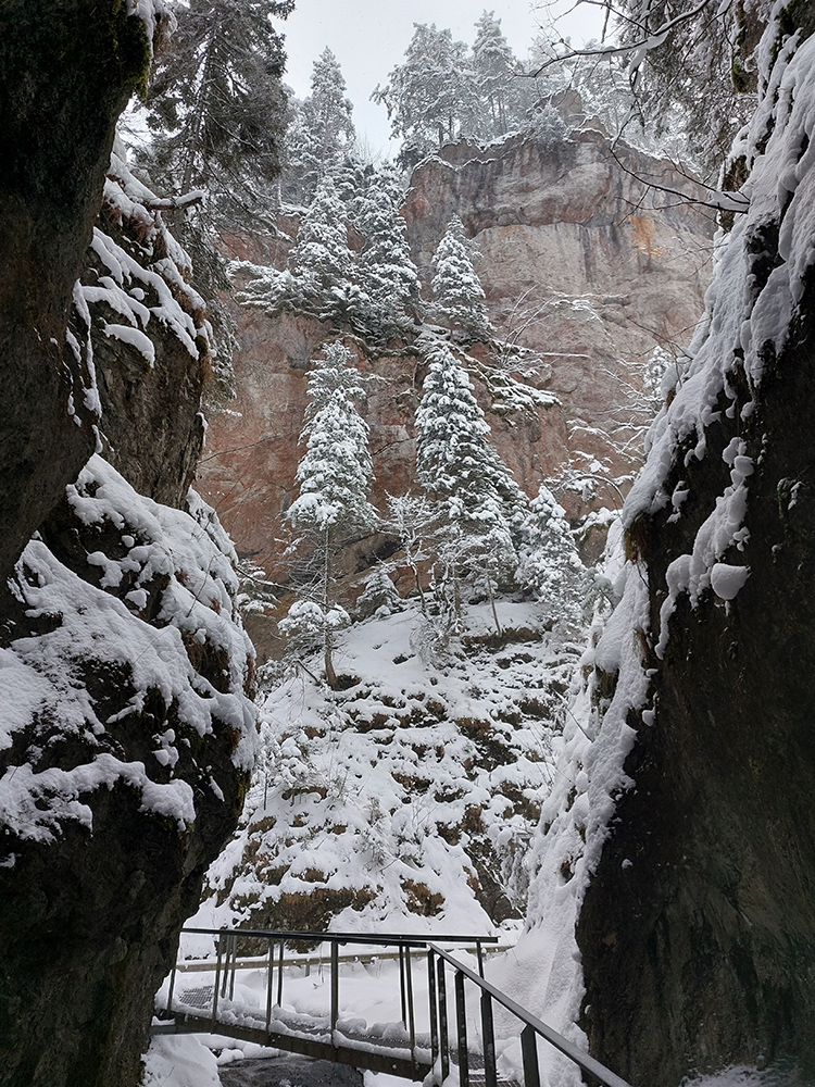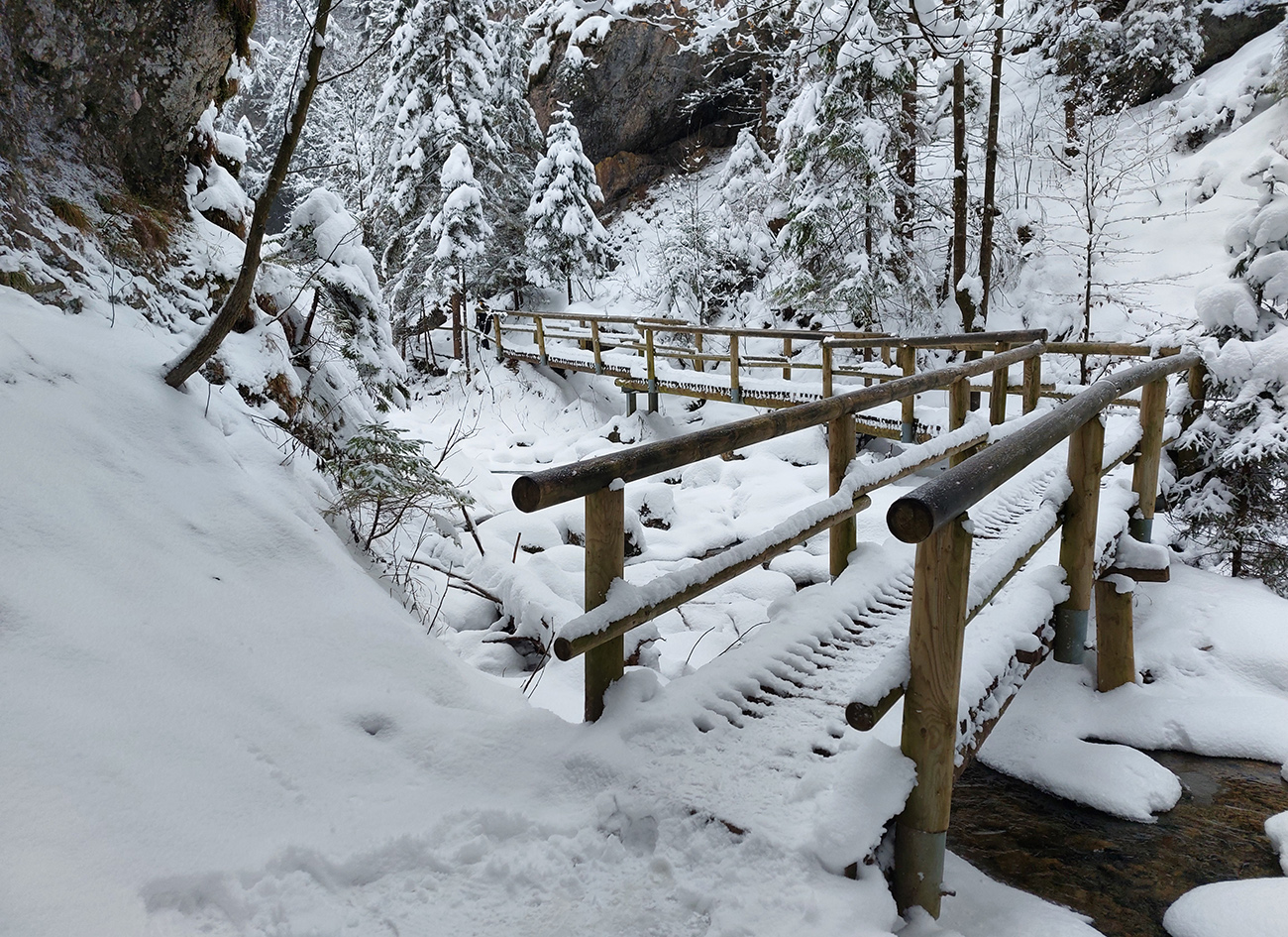 Zostup strmo dole do Tiesňav ešte krajší, ale vďaka tomu čerstvému páperiu bez základu aj šmykľavejší. A často vôbec nevieme, do čoho pod tým snehom stúpame. Retiazky a schodíky ukryté pod perinou moc nepomáhajú, skôr zavadzajú. Ale sivobiela bralnatá krajina naokolo je úchvatná.
