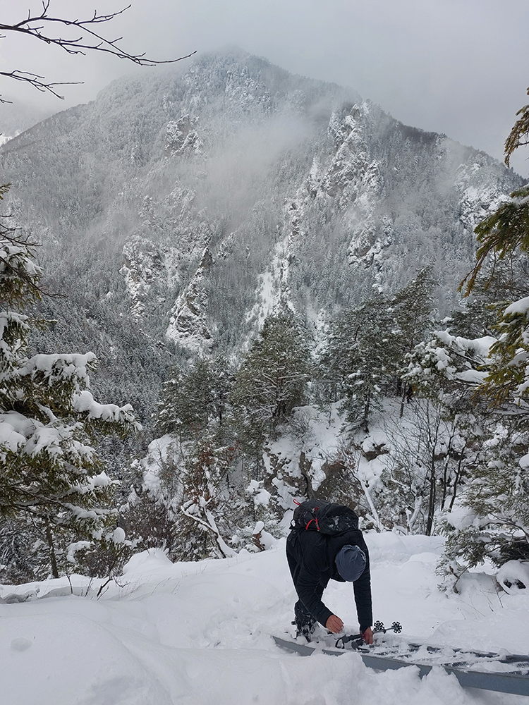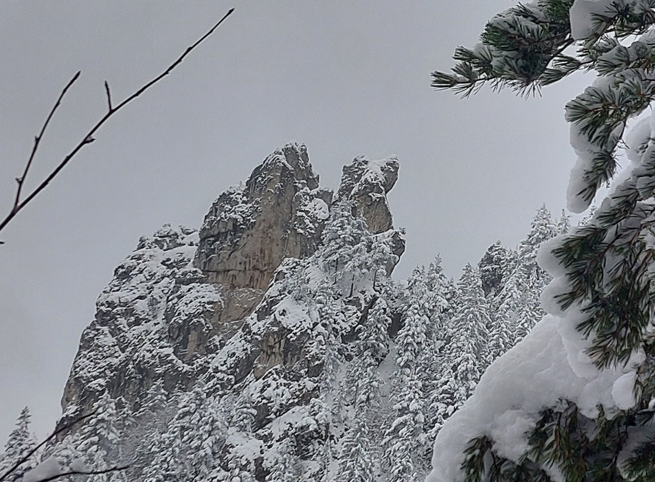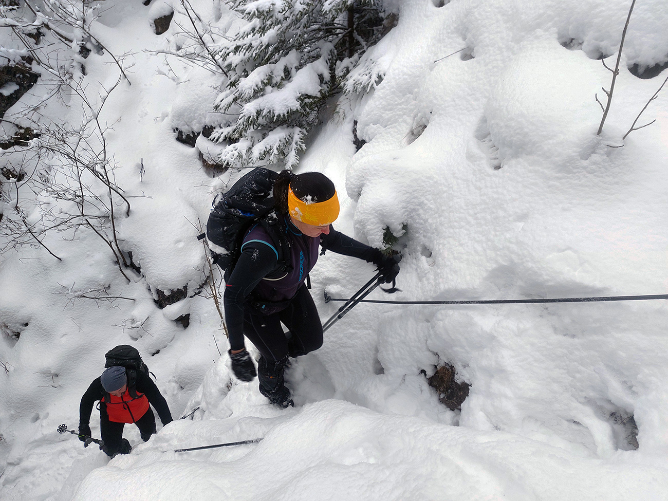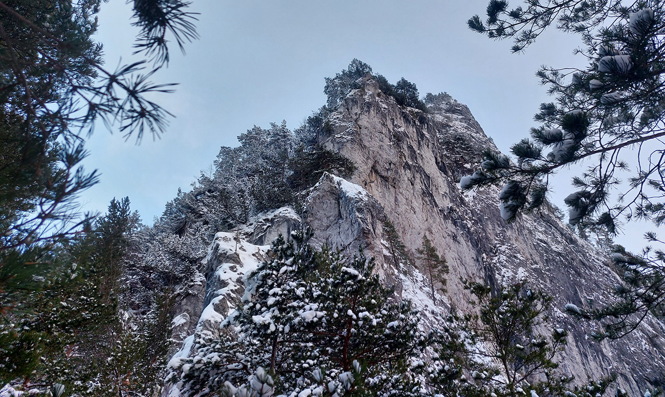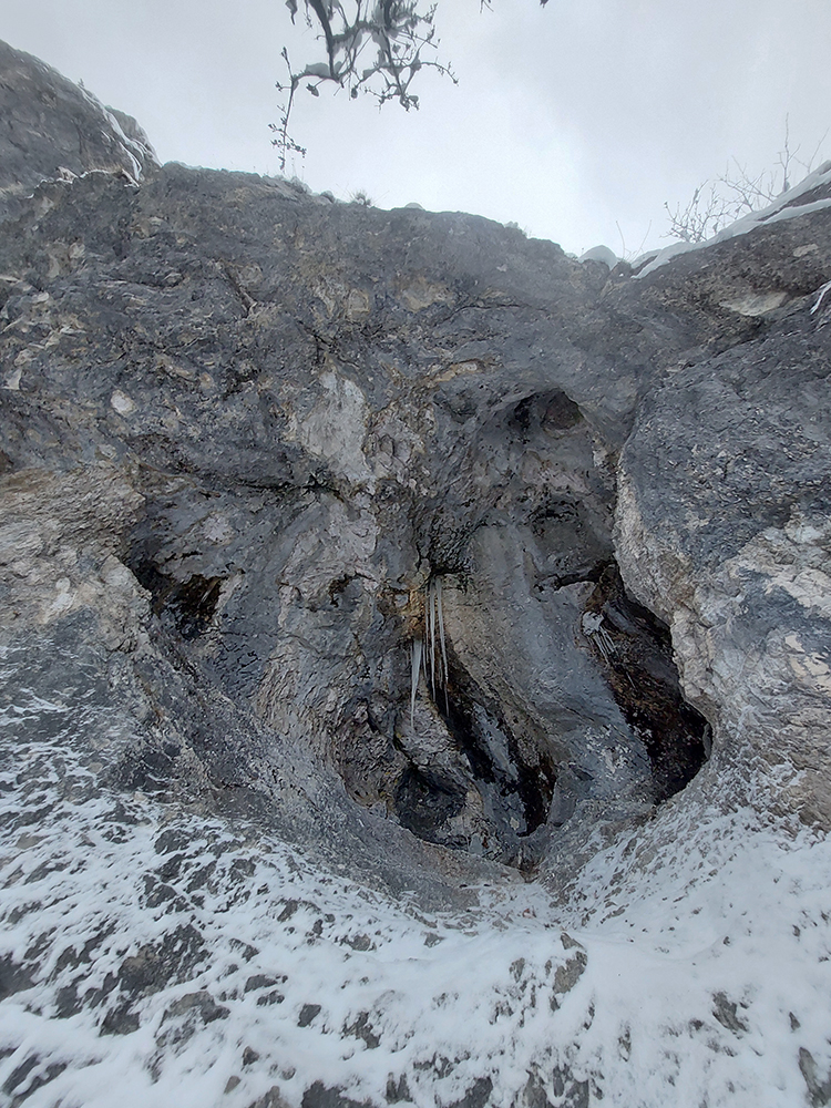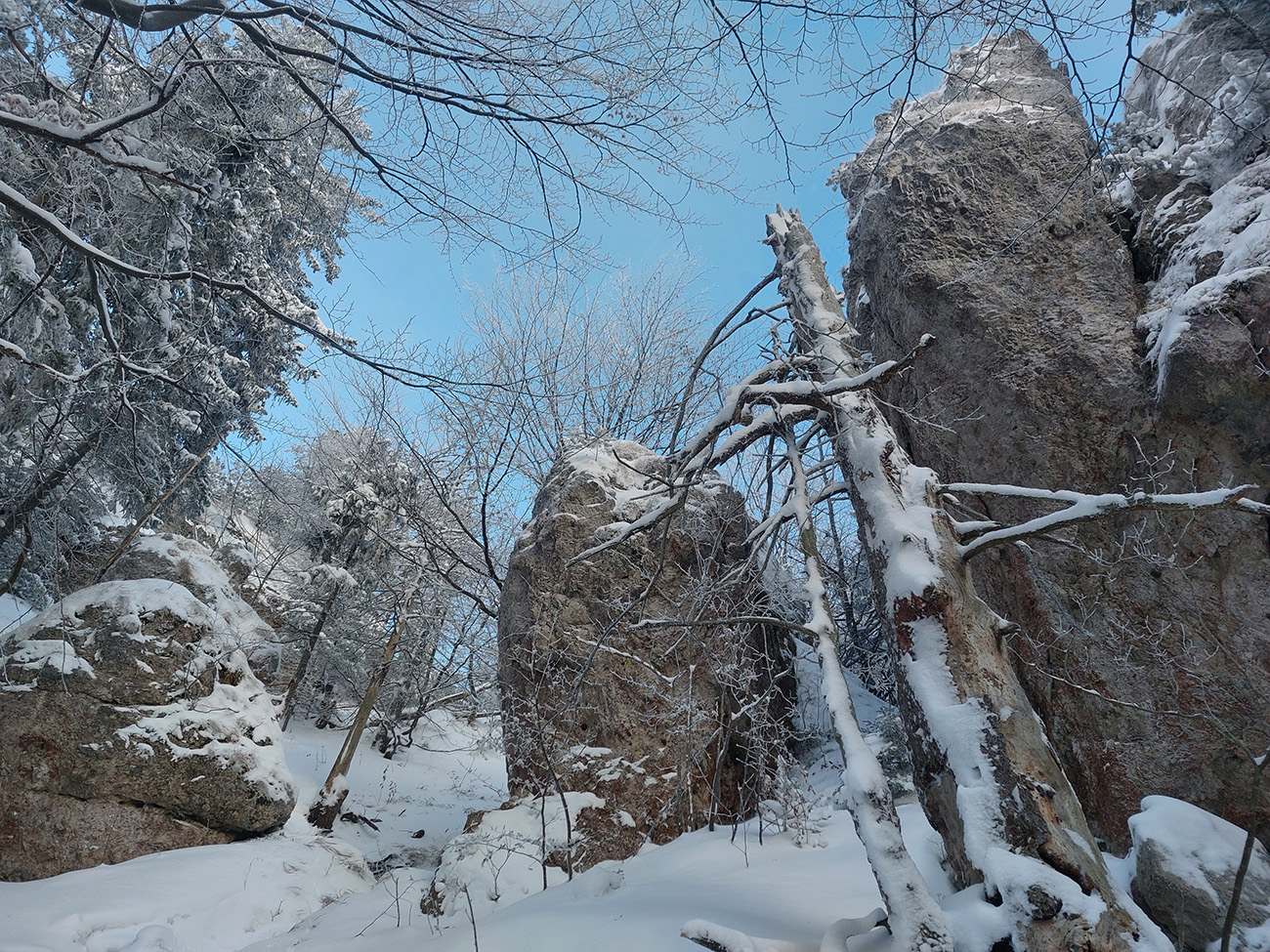 Zostup strmo dole do Tiesňav ešte krajší, ale vďaka tomu čerstvému páperiu bez základu aj šmykľavejší. A často vôbec nevieme, do čoho pod tým snehom stúpame. Retiazky a schodíky ukryté pod perinou moc nepomáhajú, skôr zavadzajú. Ale sivobiela bralnatá krajina naokolo je úchvatná.