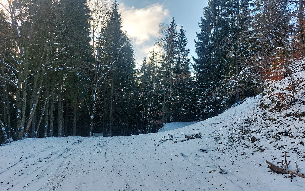 Po Medvedej ceste by sa opatrne na pásoch dalo mooožno aj od Investičky, takých 5 cm na zamrznutej hline, stredom to ide. Ale lepšie furt na bajku. Popri padaní aj fúkalo, tak tesne pred napojením na serpentíny viac tej hliny.