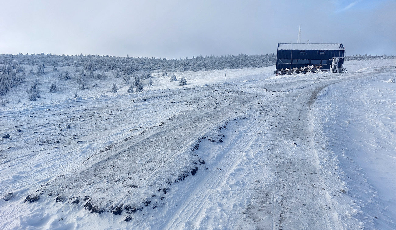 Okolo starej chaty je už vidieť, že viac fúkalo ako snežilo, aj asfalty trčia na zákrute a trávy kde kade. Aj tam platí, že hore pistou by to išlo, dole aj kameňáky škoda drať. Zato cesta od chaty až hore k vysielaču čistý pásový komfort, ak si odmyslíme vyfúkaných pár metrov pod chatou Javorina (dá sa to obísť).