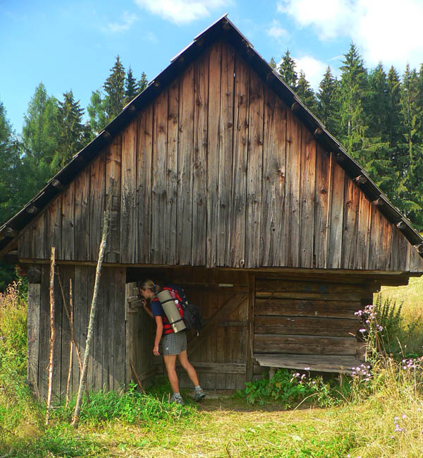 Prvý úsek pripomína skôr prechádzku po parku – sprava les, zľava lúky, skupinky stromov, sem tam dom, kráčame po spasenej a pokosenej tráve alebo po poľnej ceste. Len škoda že asi kilometer pred sedlom Tlstý javor vedie značka po asfaltke, aj keď teraz (v nedeľu ráno) premávka nie je takmer žiadna. Za sedlom sa po krátkom pochode lesom znovu dostávame na krásne lúky, už dohola vykosené. Po ich hornom okraji vedie popod les pohodlná „lúčna“ cesta – toto keby sme vedeli tri dni dozadu, nemuseli sme sa trmácať po asfalte hore Kamenistou dolinou. Dalo by sa tadiaľto aj za dažďa bez strachu o mokré nohy. Od smerovníka na Obrubovanci si trochu zachádzame odbočkou cez lúku – treba obzrieť a odfotiť aktuálny stav opusteného salaša. Výborné miesto na bivak! Pod drevenicou mätovo-žihľavová húština naznačuje prítomnosť vody a pramienok je dosť výdatný aj na skromné sprchovanie z fľaše.